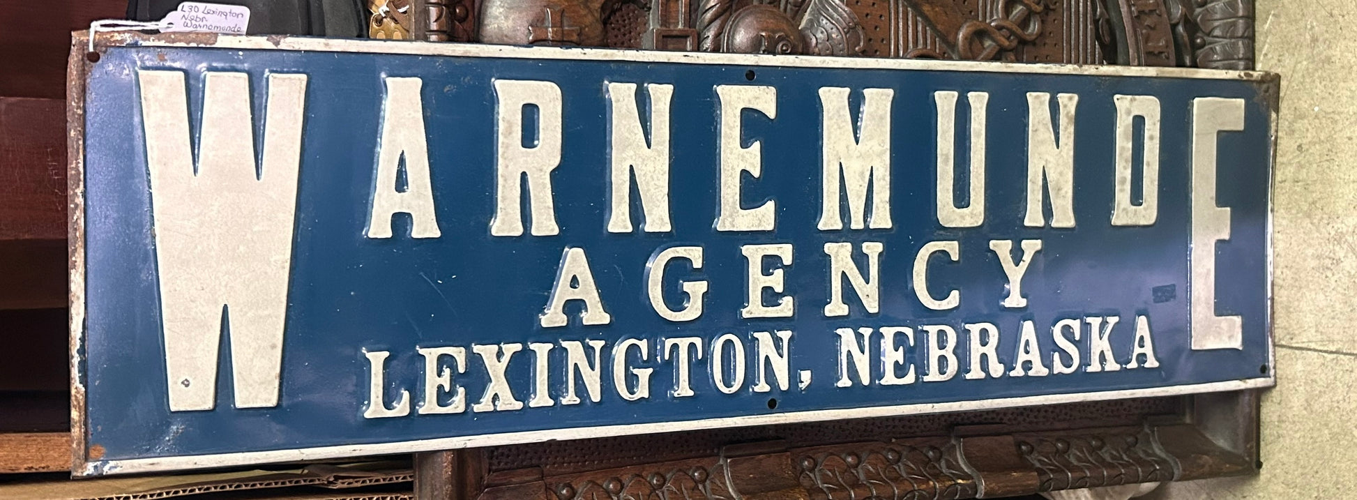 LEXINGTON, NEBRASKA WARNEMUNDE AGENCY ANTIQUE EMBOSSED TIN ADVERTISING SIGN IN EXCELLENT SHAPE. PLEASE CALL, TEXT, OR E-MAIL FOR MORE INFORMATION