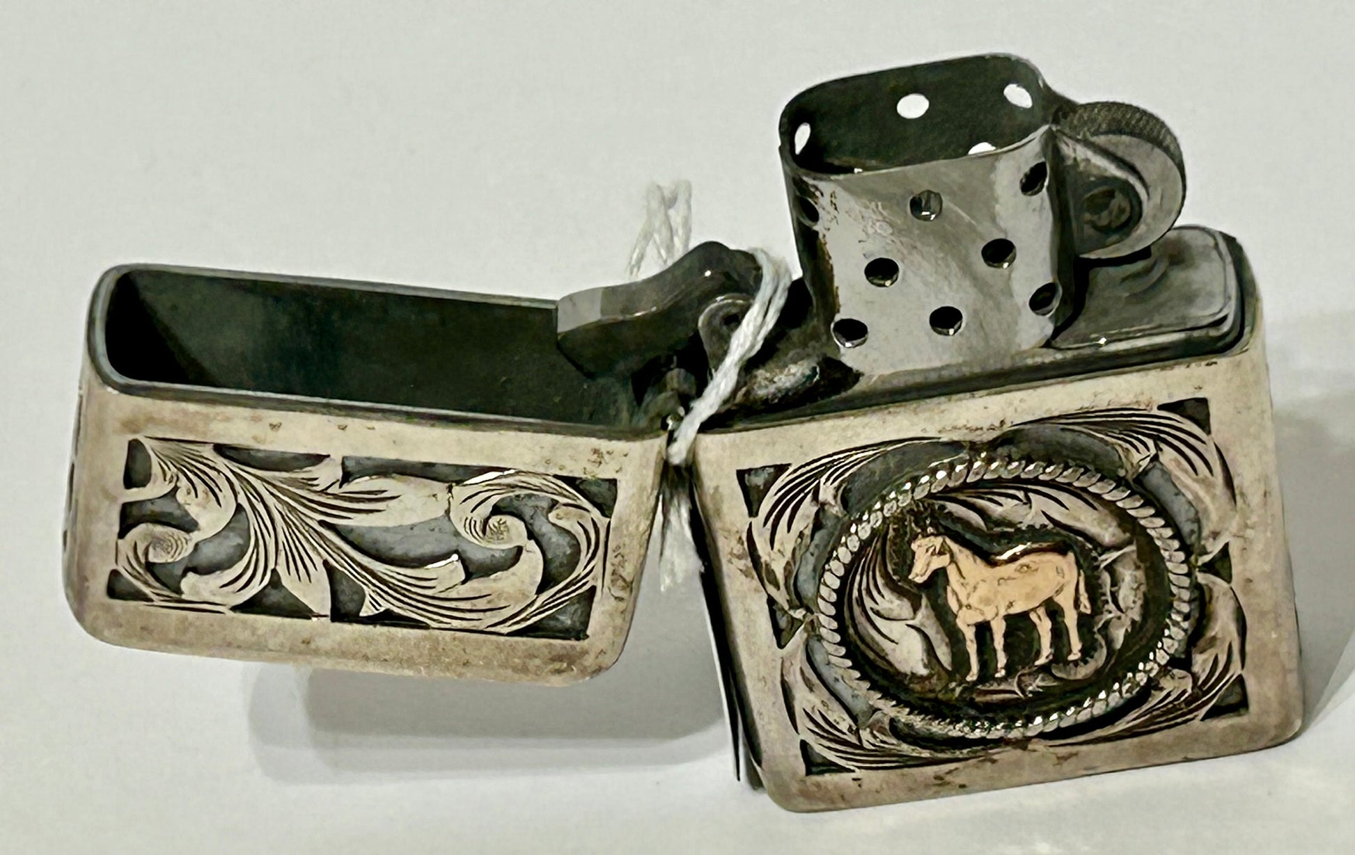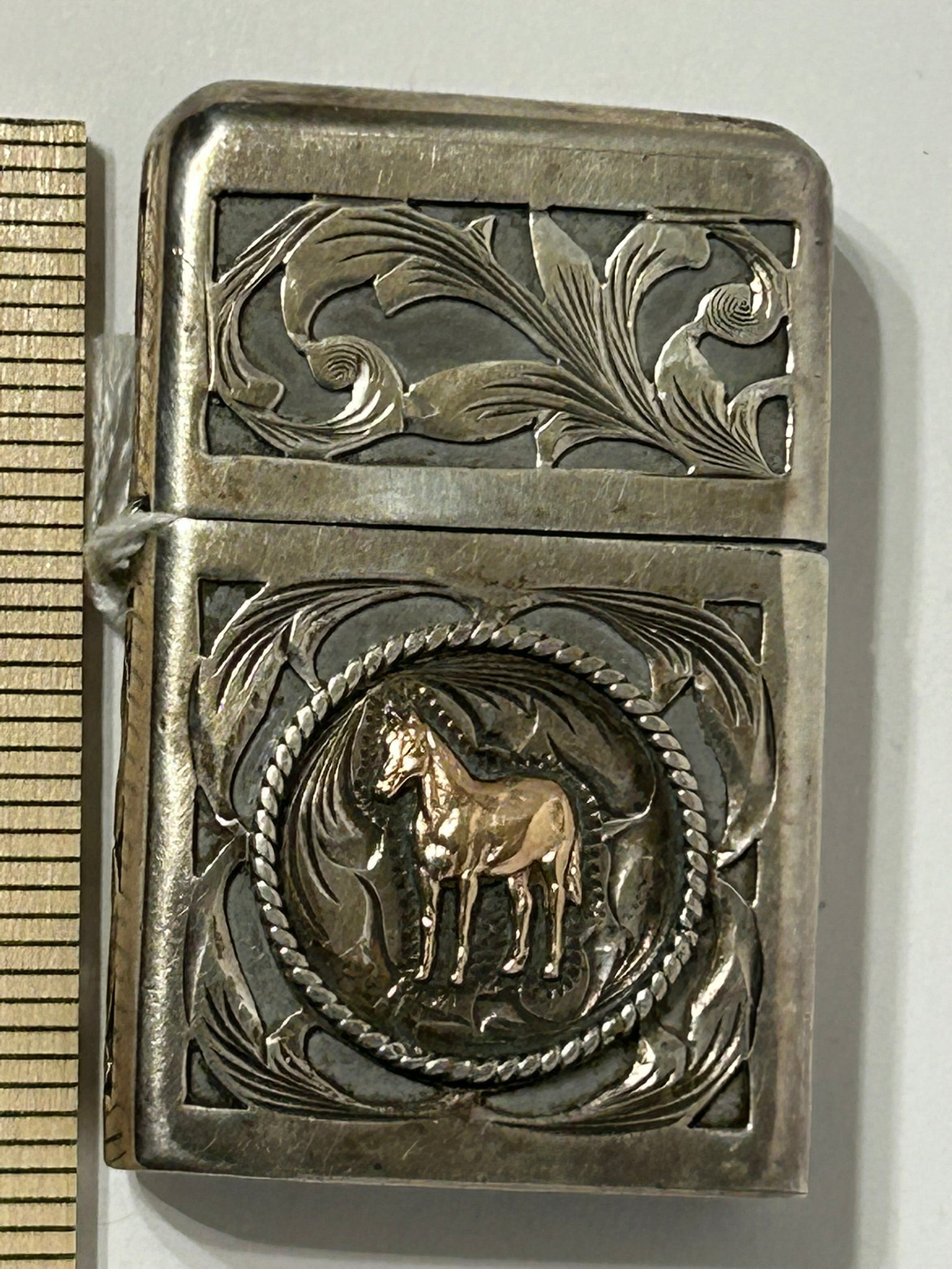 LIGHTER WITH MEXICAN HEAVY STERLING WITH GOLD HORSE DESIGN BY VOGT. CALL OR TEXT FOR MORE INFORMATION