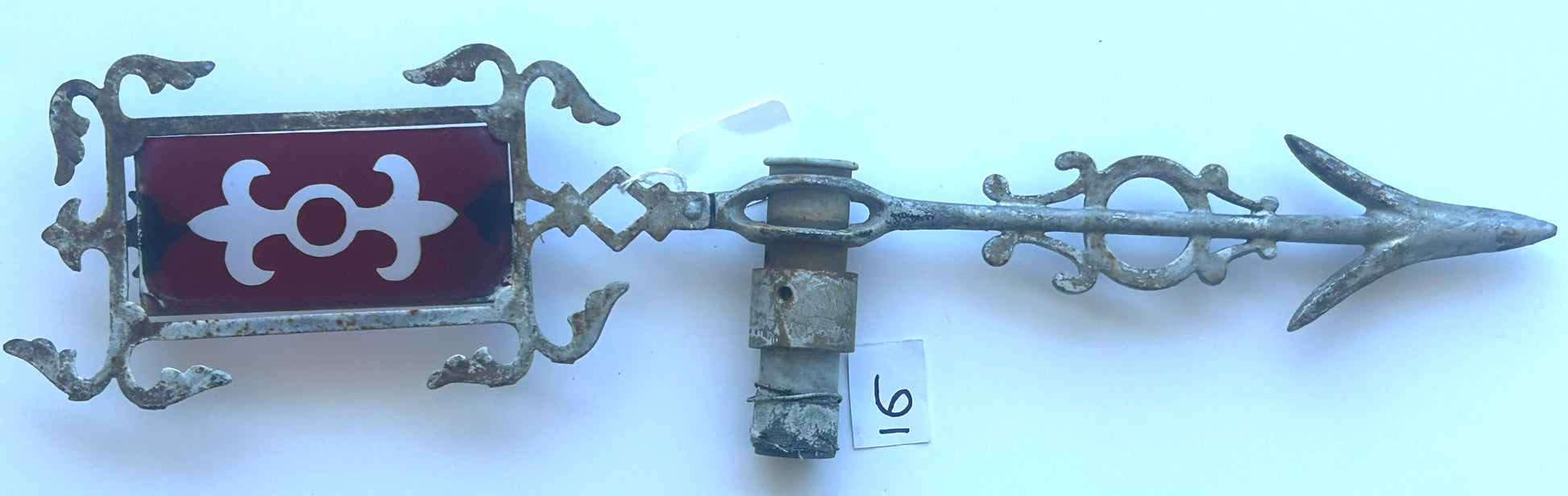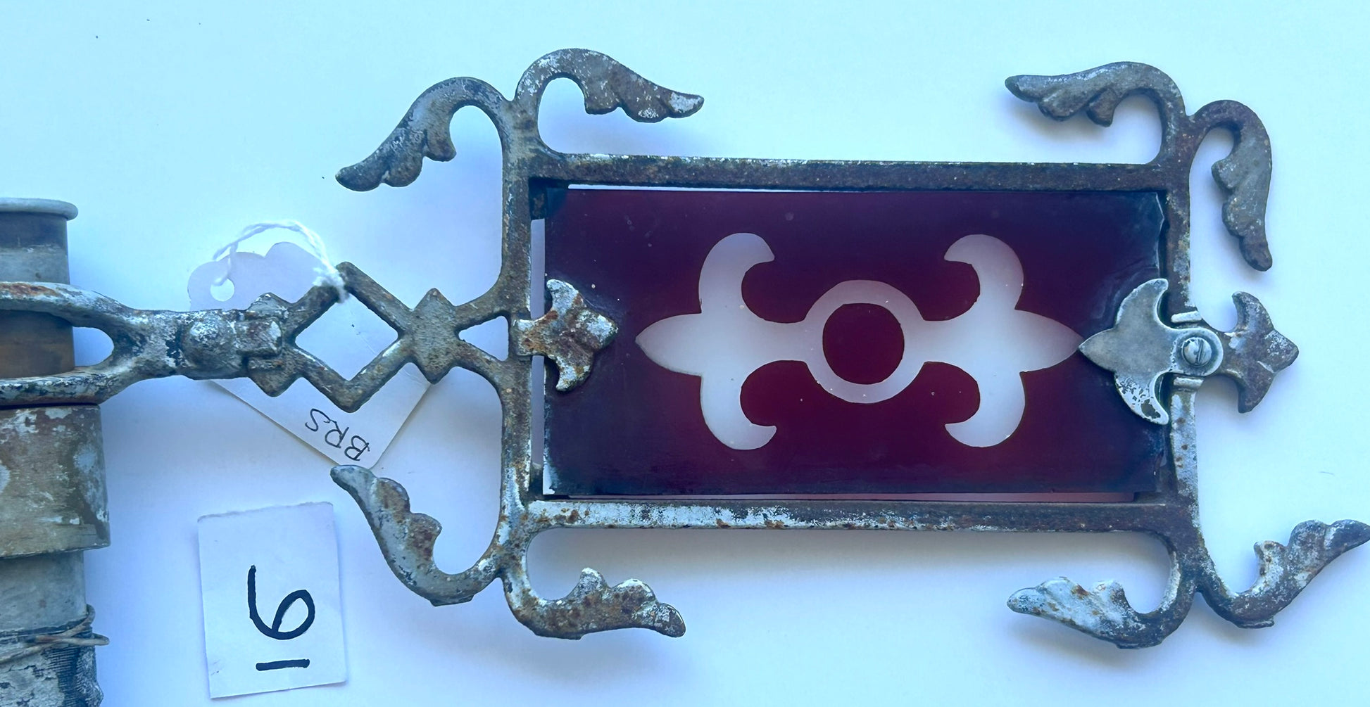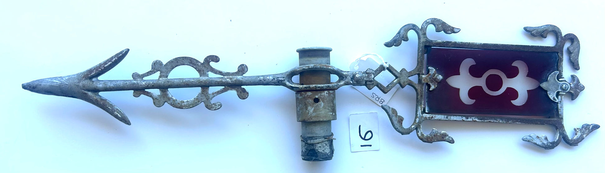 ANTIQUE LIGHTNING ROD ARROW WITH RUBY GLASS FLEUR DE LIS DESIGN TAIL 18" LONG. CALL OR TEXT FOR MORE INFORMATION