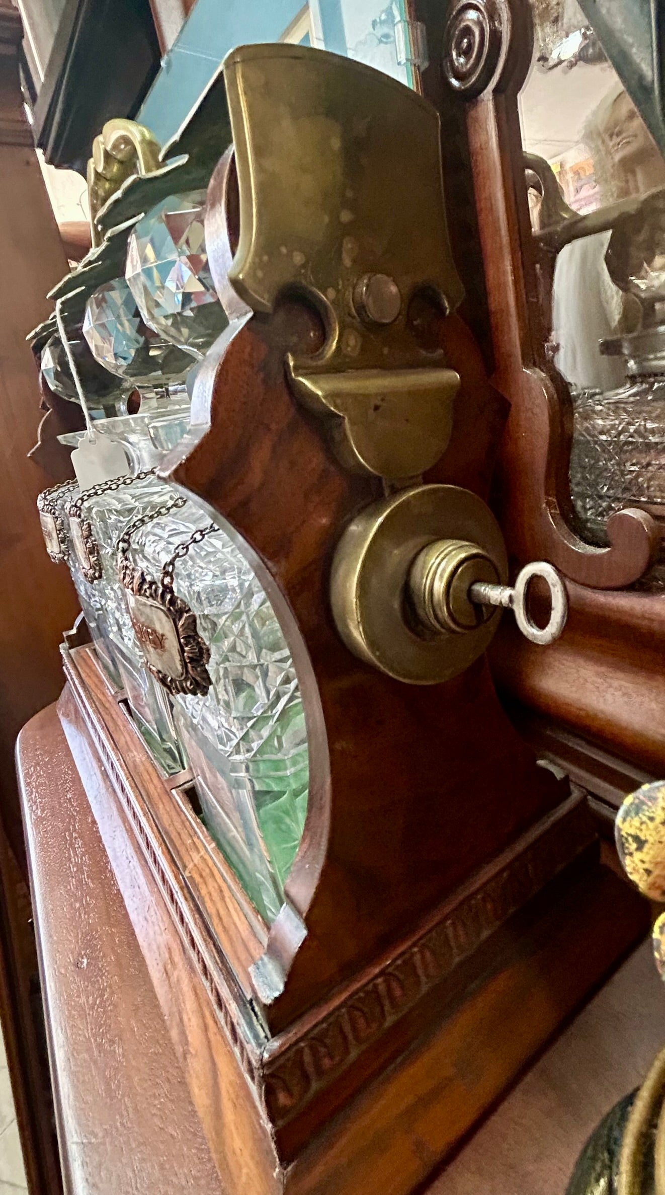 LIQUOR THREE DECANTER ANTIQUE LOCKING TANTALUS OR CADDY 15" X 12". CALL OR TEXT FOR MORE INFORMATION