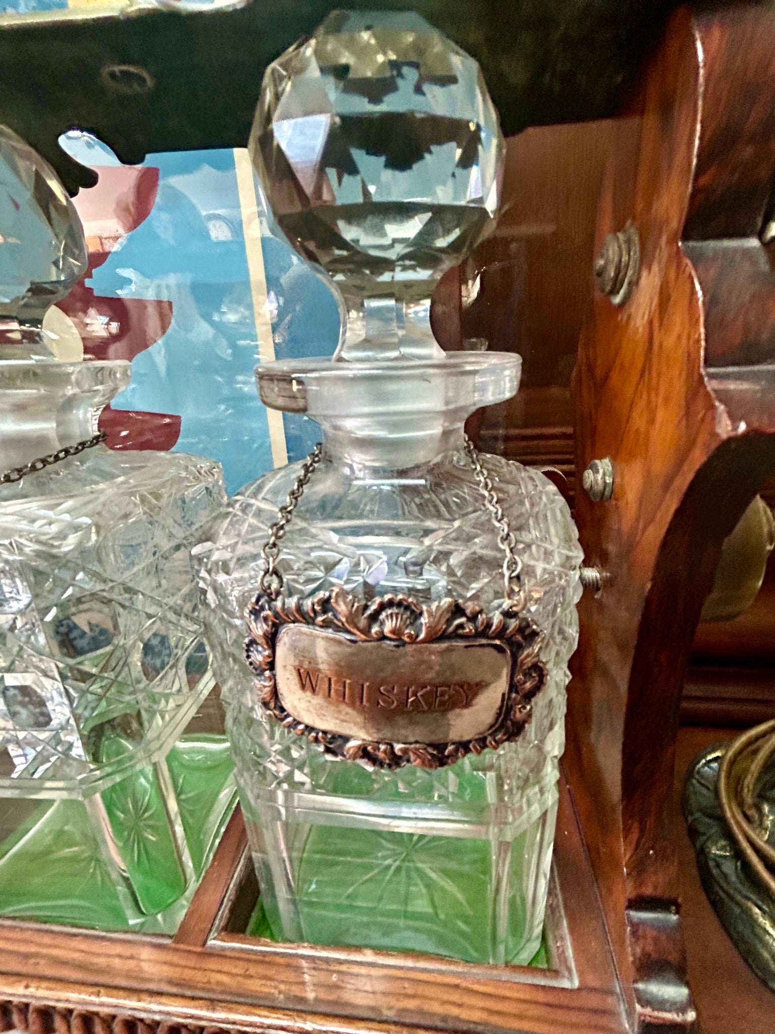 LIQUOR THREE DECANTER ANTIQUE LOCKING TANTALUS OR CADDY