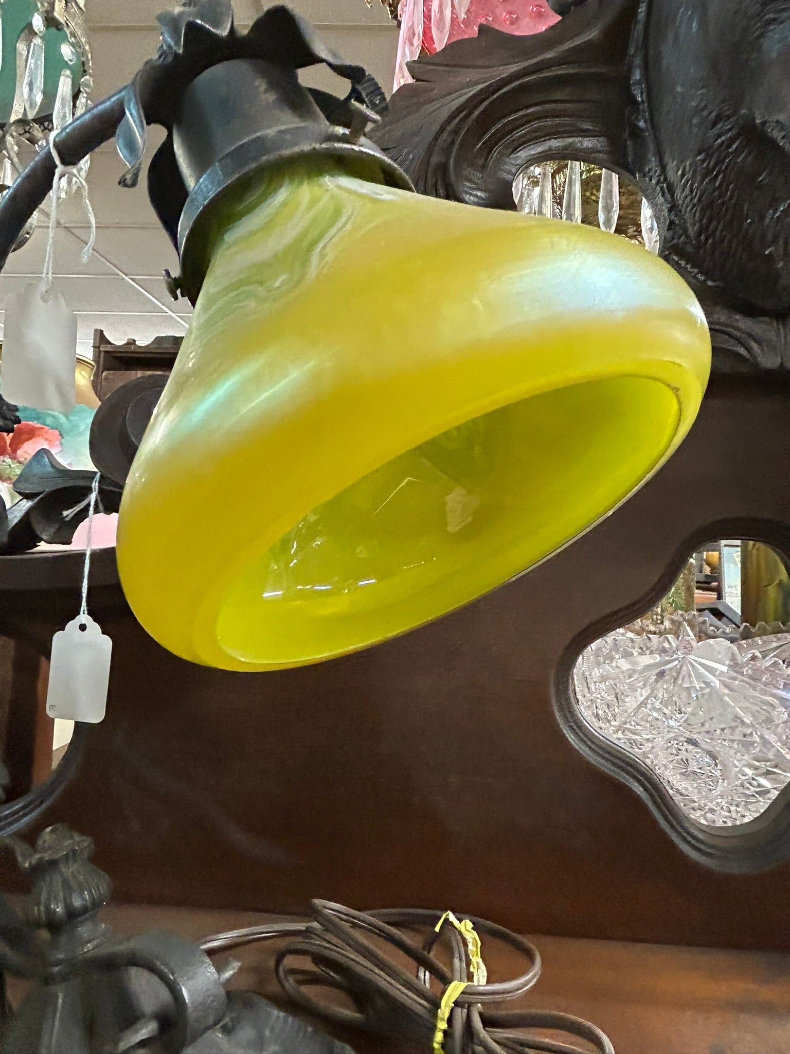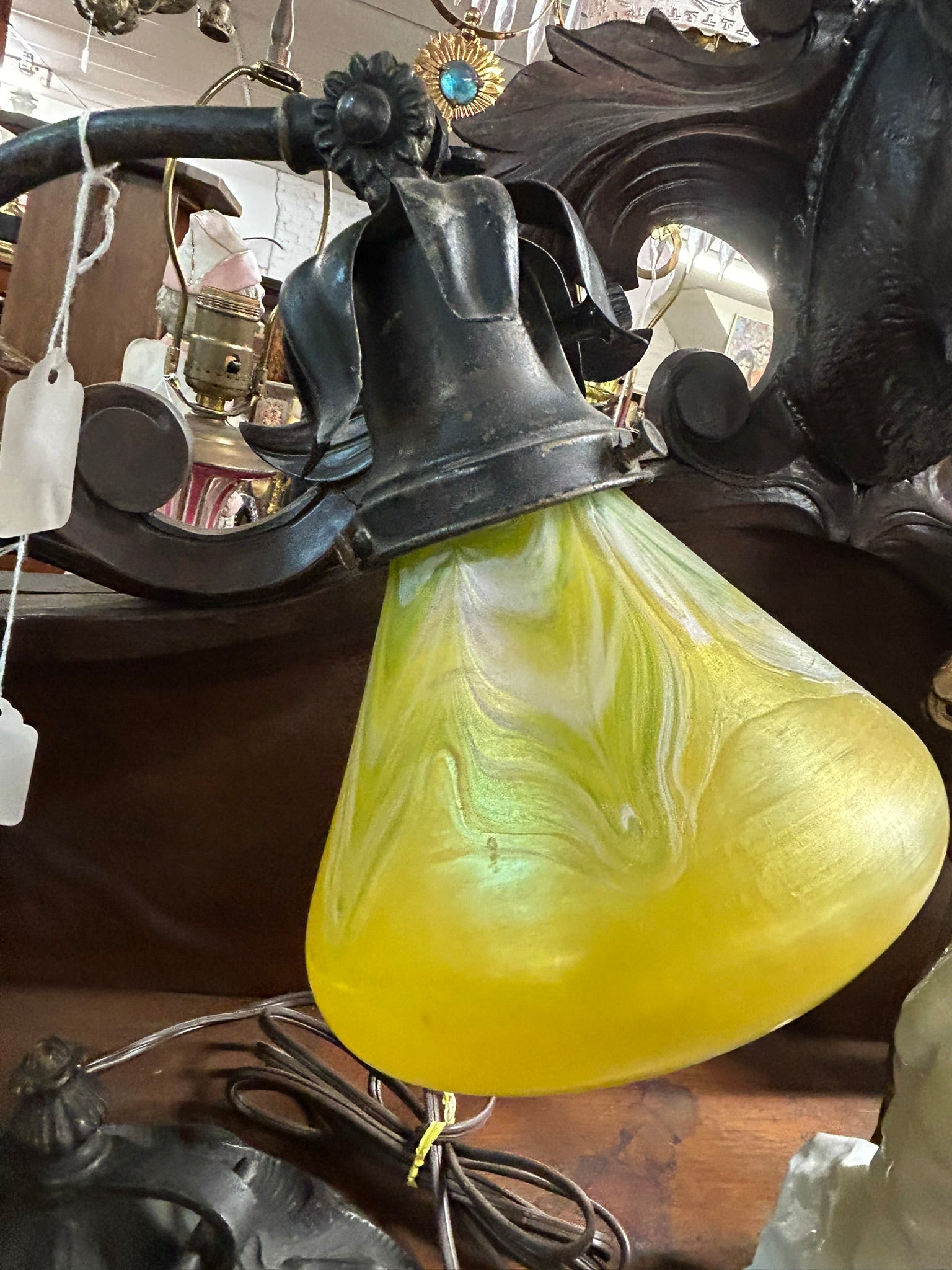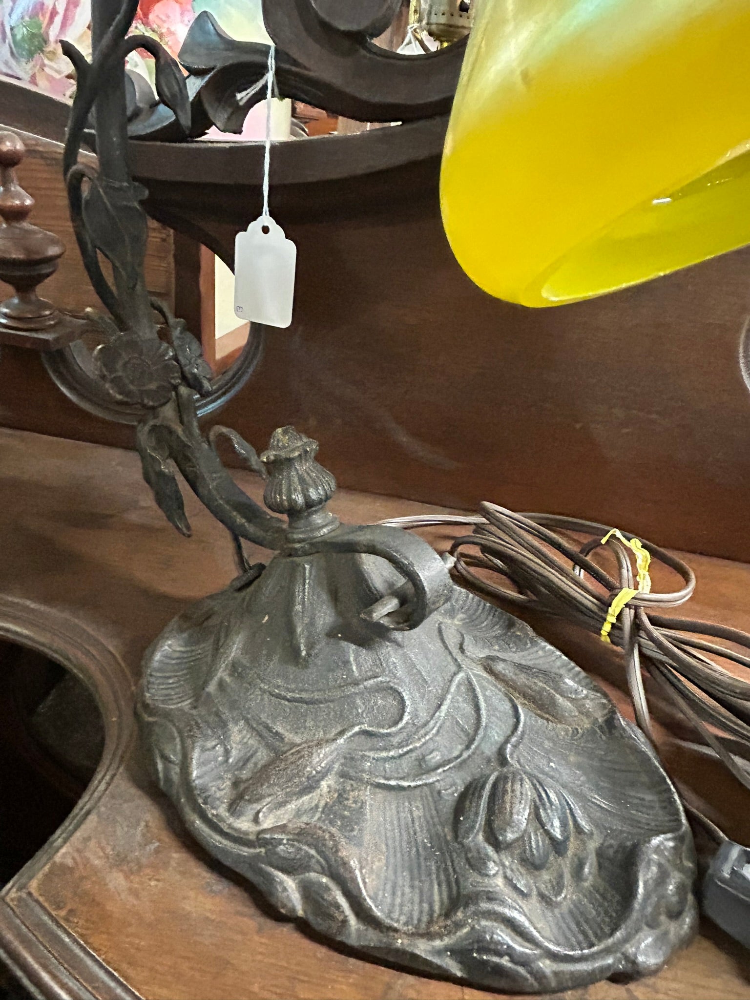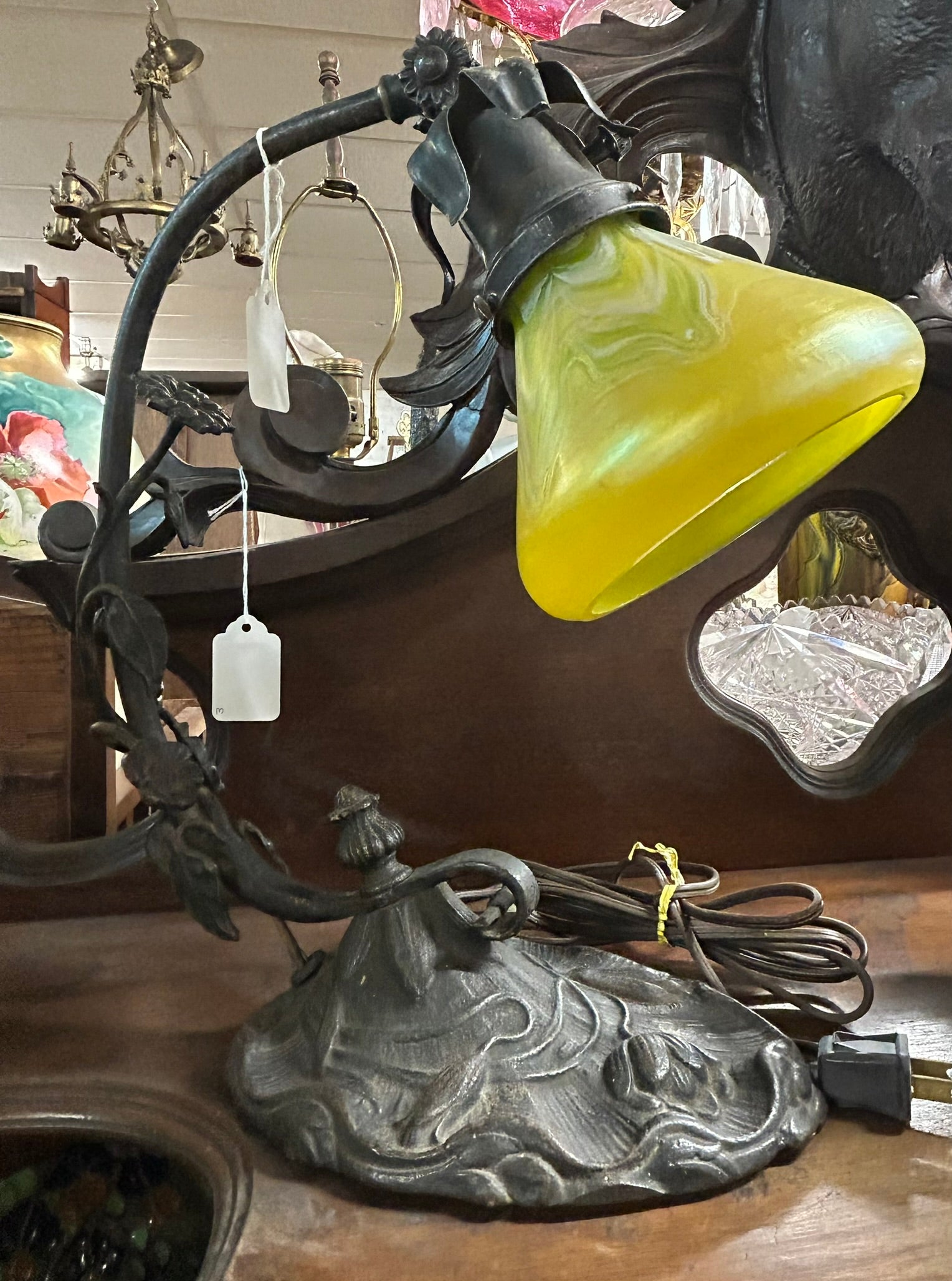 LOETZ GLASS ANTIQUE YELLOW SHADE DESK LAMP WITH ART NOVEAU BASE 13" TALL. PLEASE CALL OR TEXT FOR MORE INFORMATION