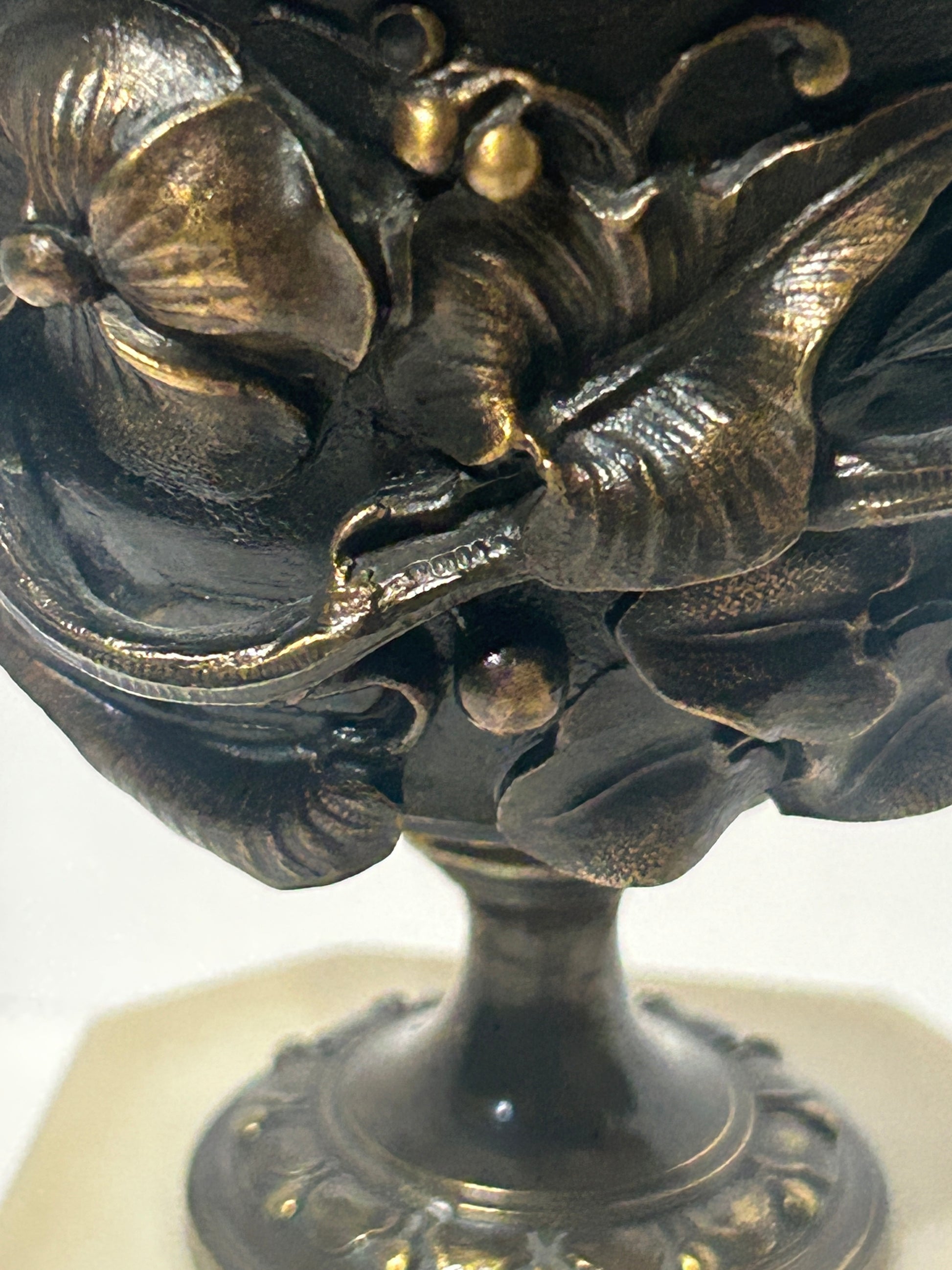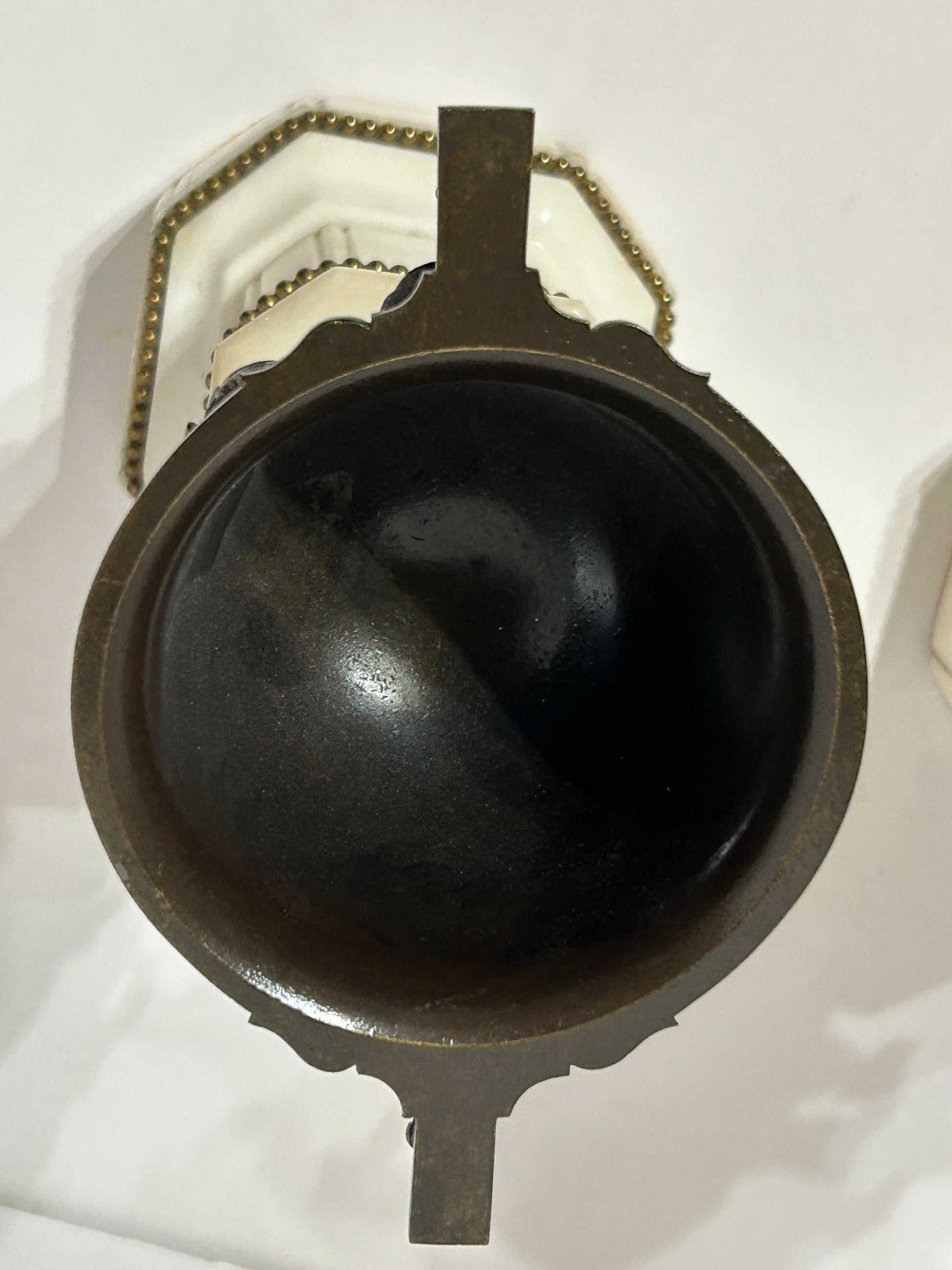 ANTIQUE BRONZE AND MARBLE INTERIOR URNS 10" TALL X 6" WIDE. SHIPPING CHARGES ARE EXTRA SO CALL OR TEXT US TO FIND OUT WHAT WE HAVE TO PAY TO SHIP TO YOUR ADDRESS