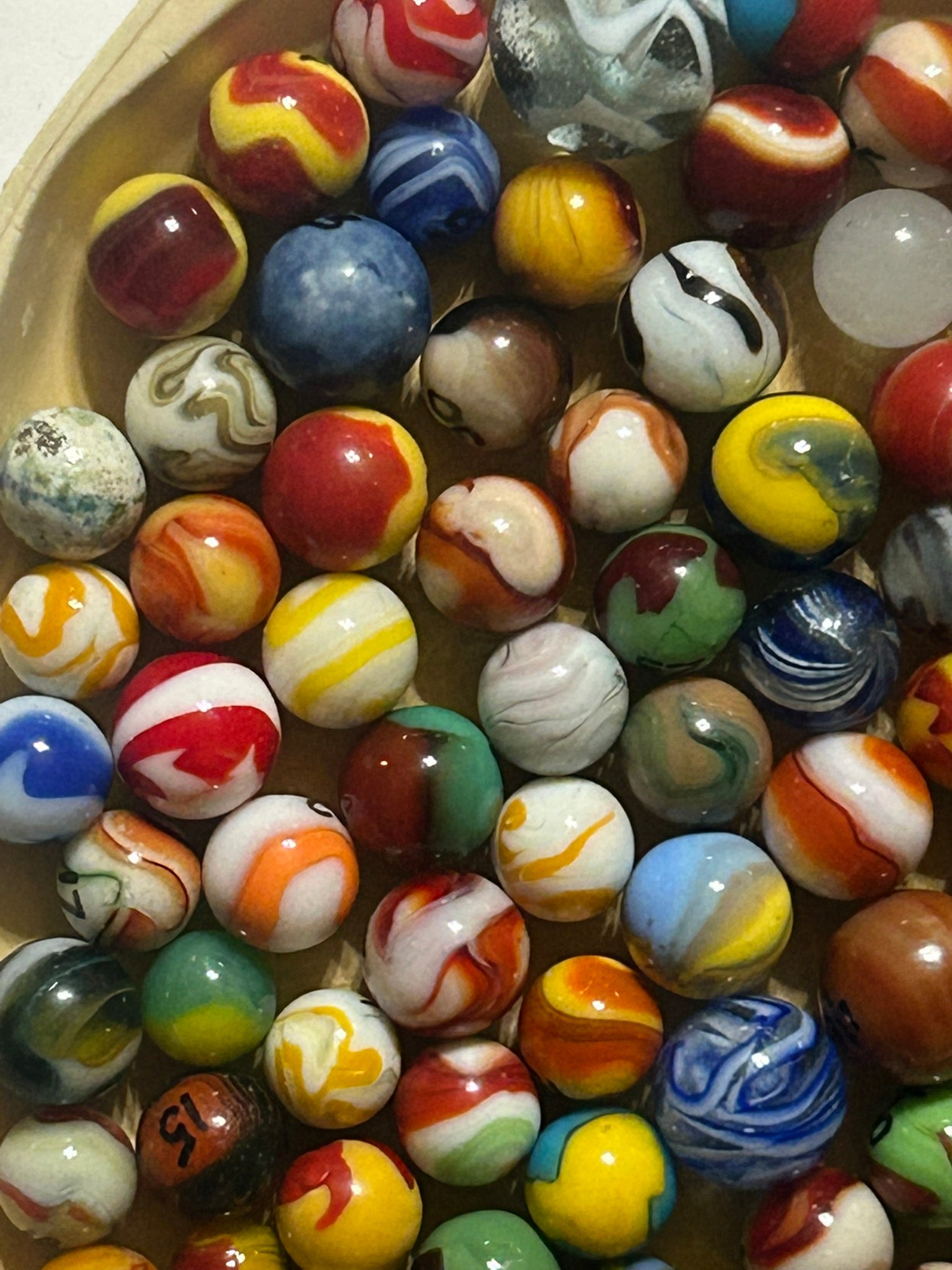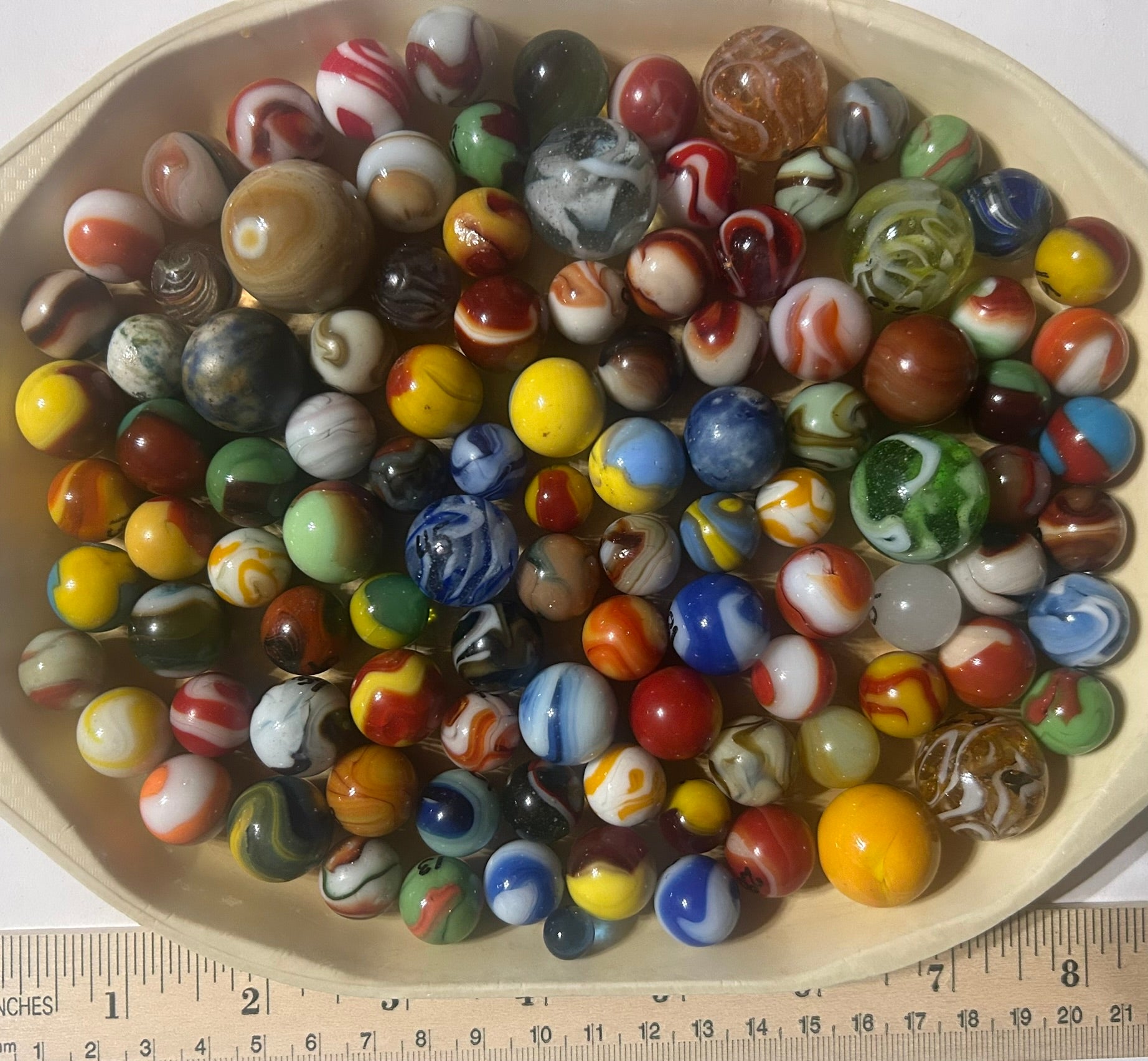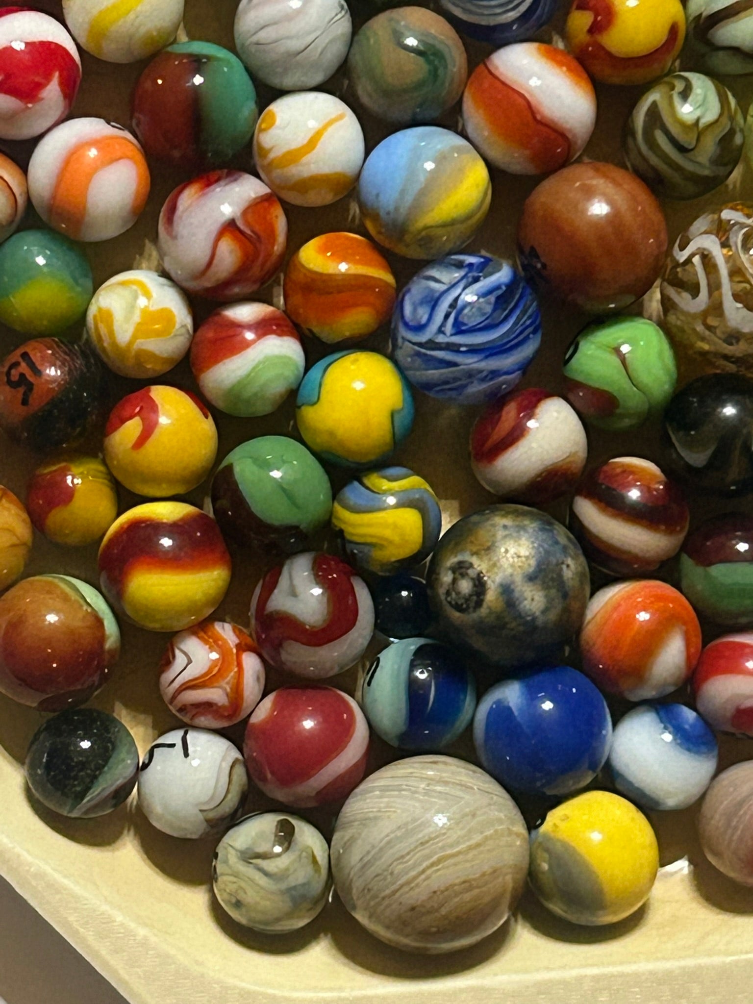 MARBLE COLLECTION OF VARIED SIZES AND TYPES 103 MARBLES ALL TOGETHER. CALL OR TEXT FOR MORE INFORMATION
