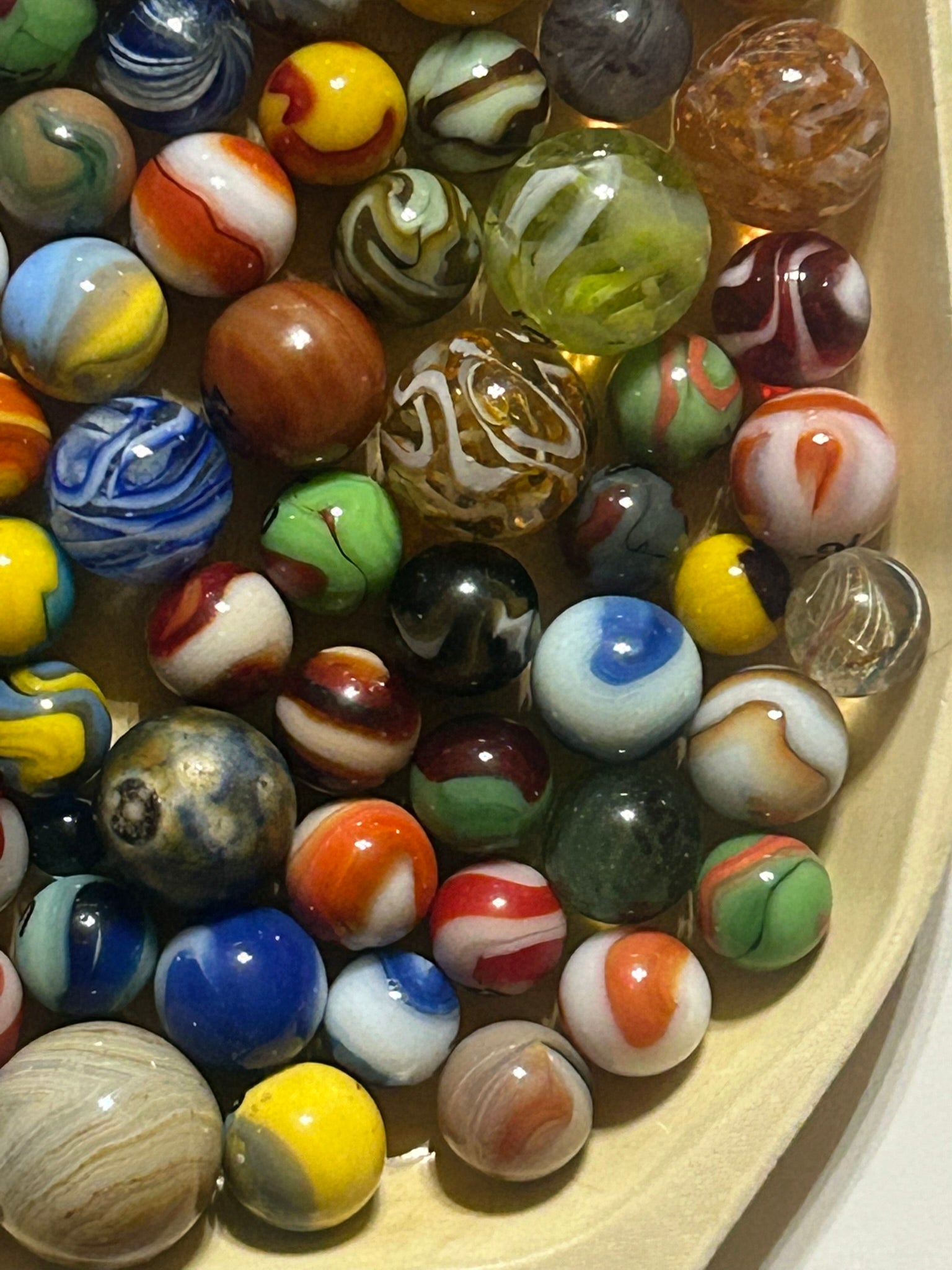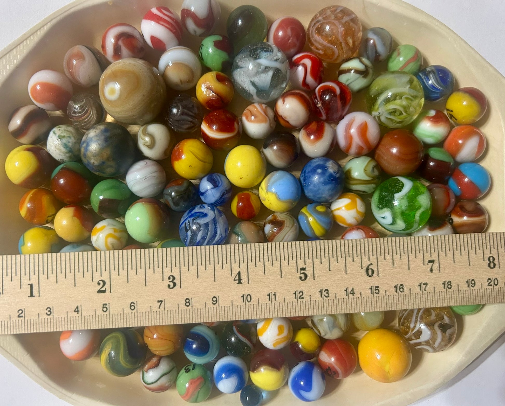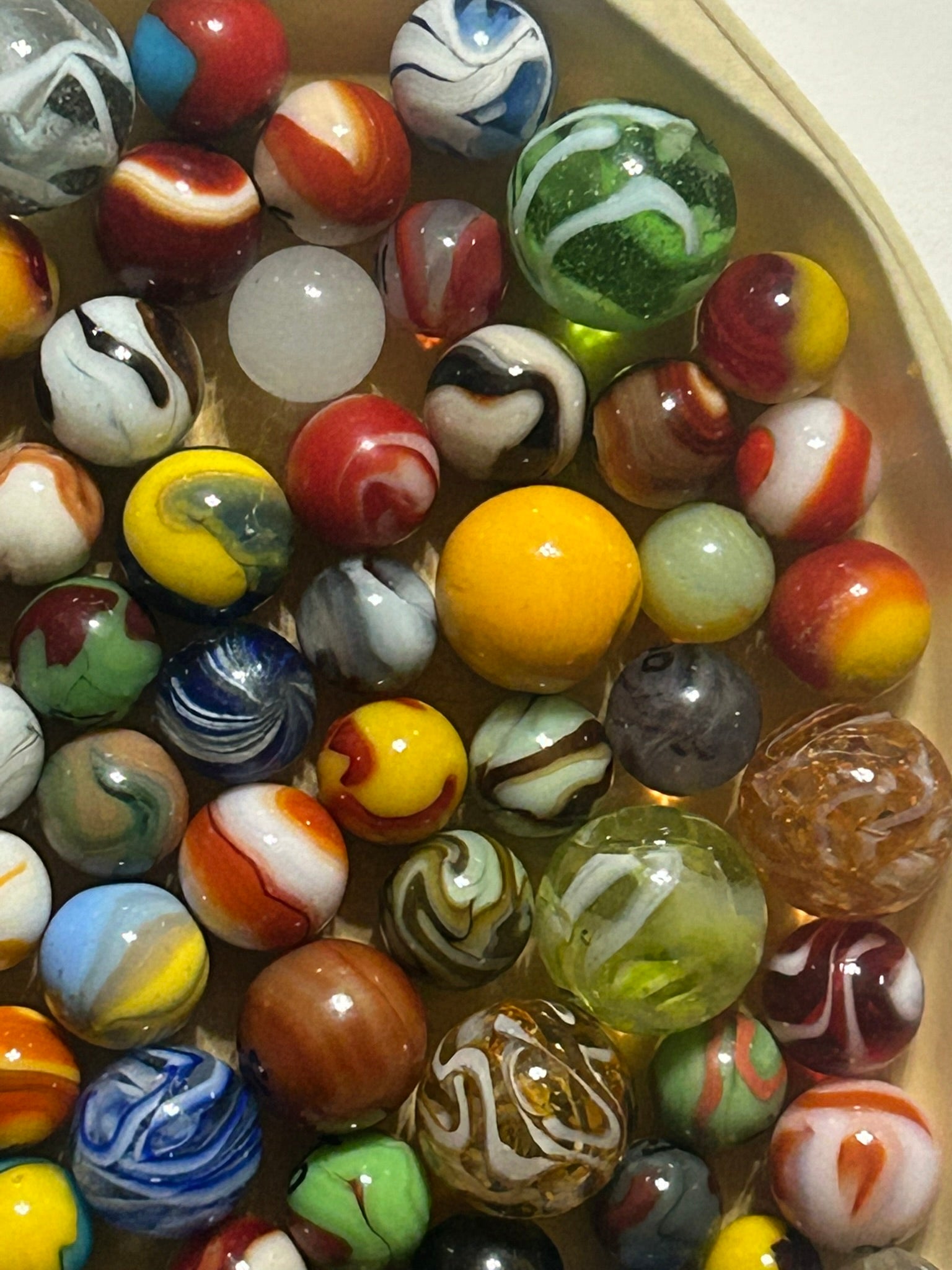 MARBLE COLLECTION OF VARIED SIZES AND TYPES 103 MARBLES ALL TOGETHER. CALL OR TEXT FOR MORE INFORMATION