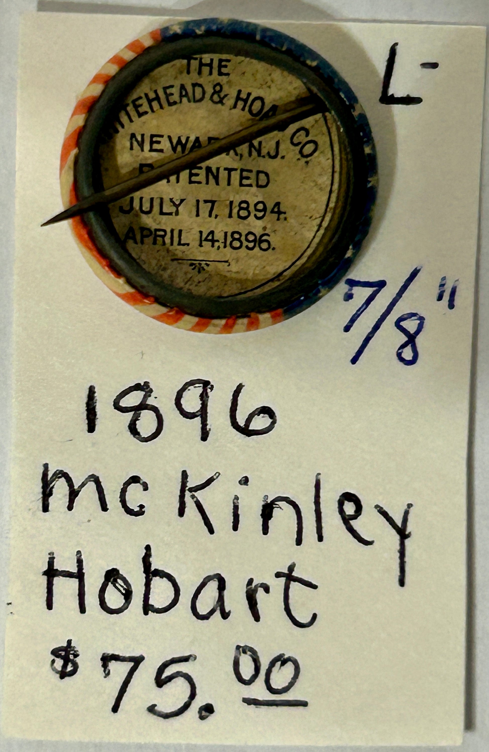 MCKINLEY HOBART 1896 JUGATE POLITICAL PIN BUTTON 7/8" DIAMETER. CALL OR TEXT FOR MORE INFORMATION