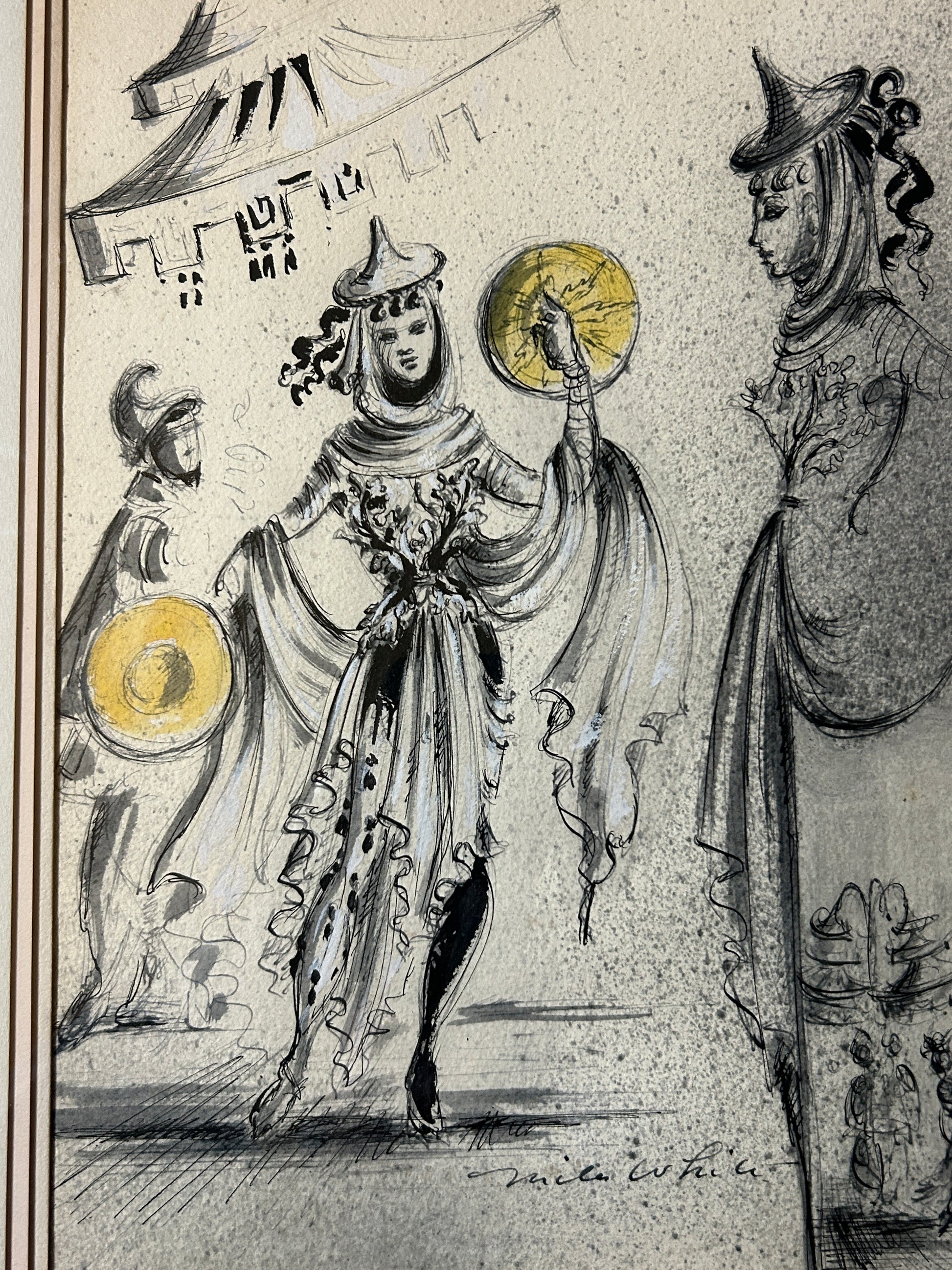 MILES WHITE FAMOUS COSTUME DESIGNER WATERCOLOR OF COSTUMES FOR RINGLING CIRCUS SHOWS IMAGE ONLY 13 1/2" TALL X 10 1/2" WIDE AND OVERALL WITH FRAME 21" TALL X 17 1/2" WIDE. SHIPPING IS EXTRA SO CALL OR TEXT TO FIND OUT HOW MUCH SHIPPING WILL COST