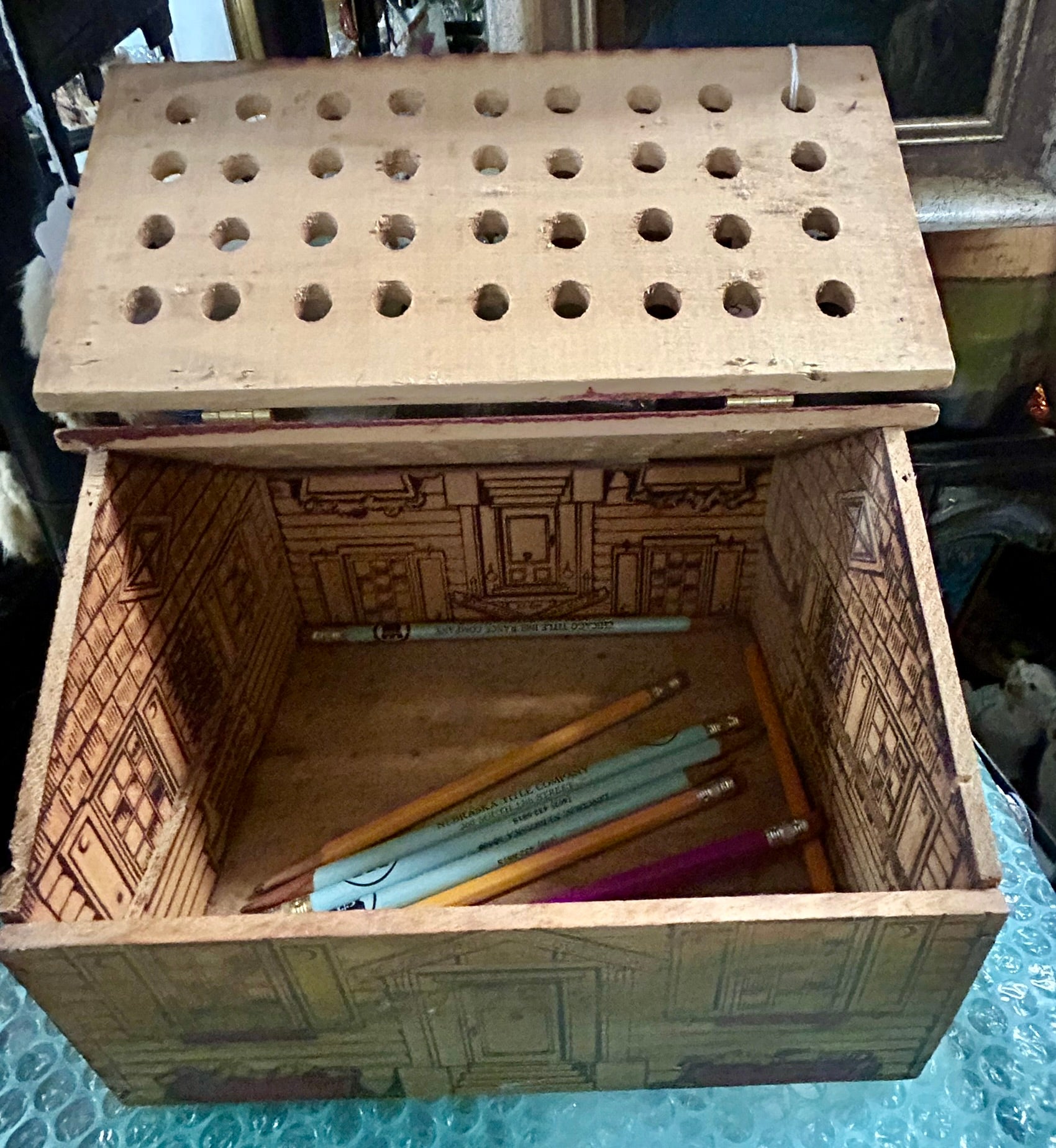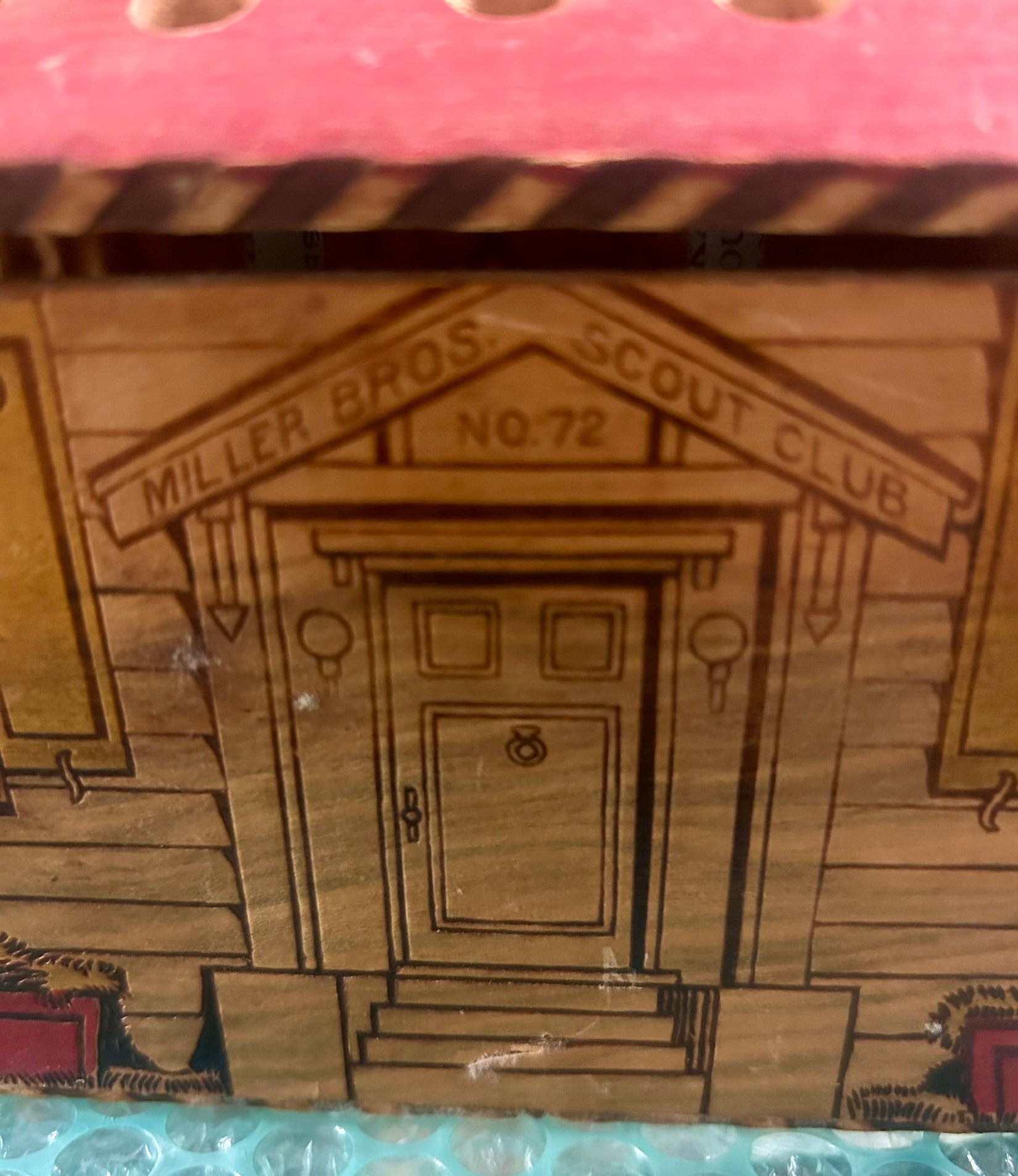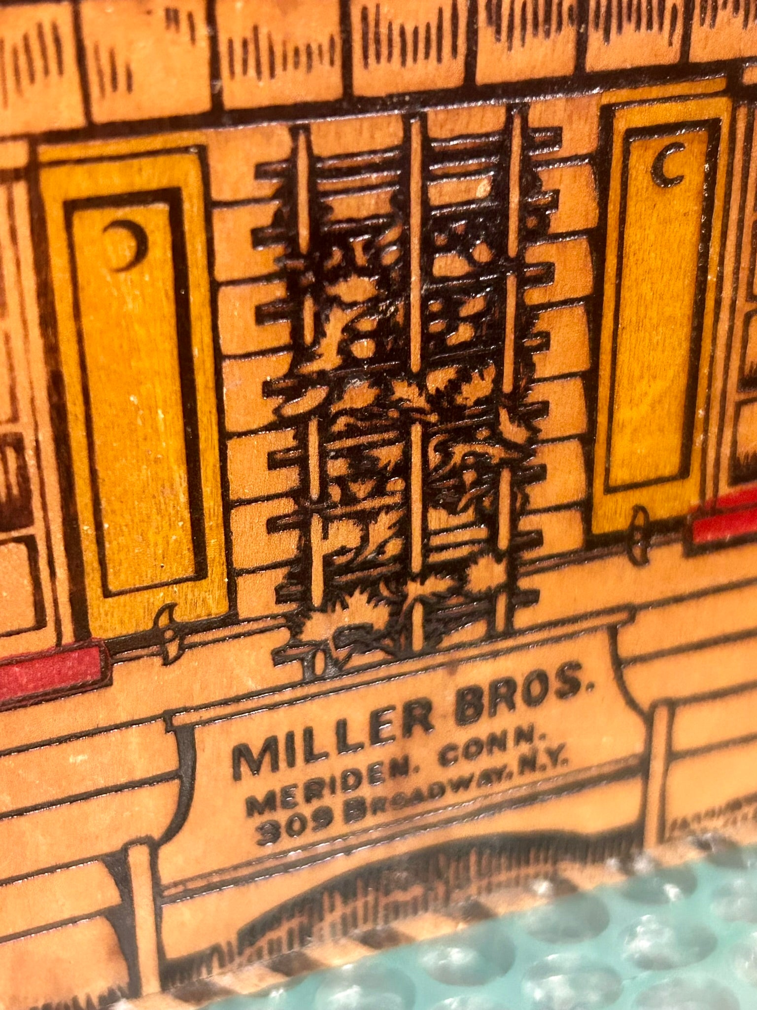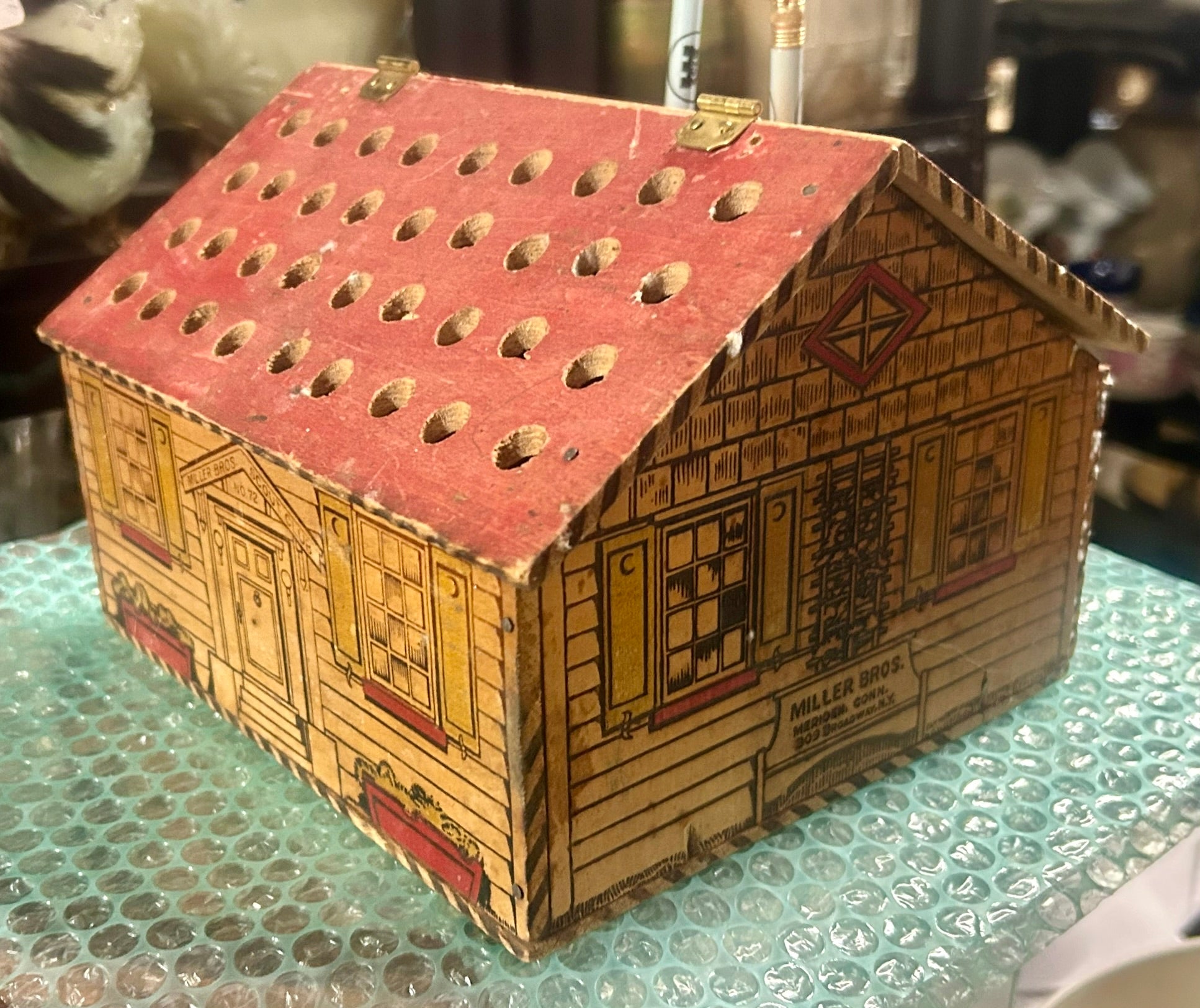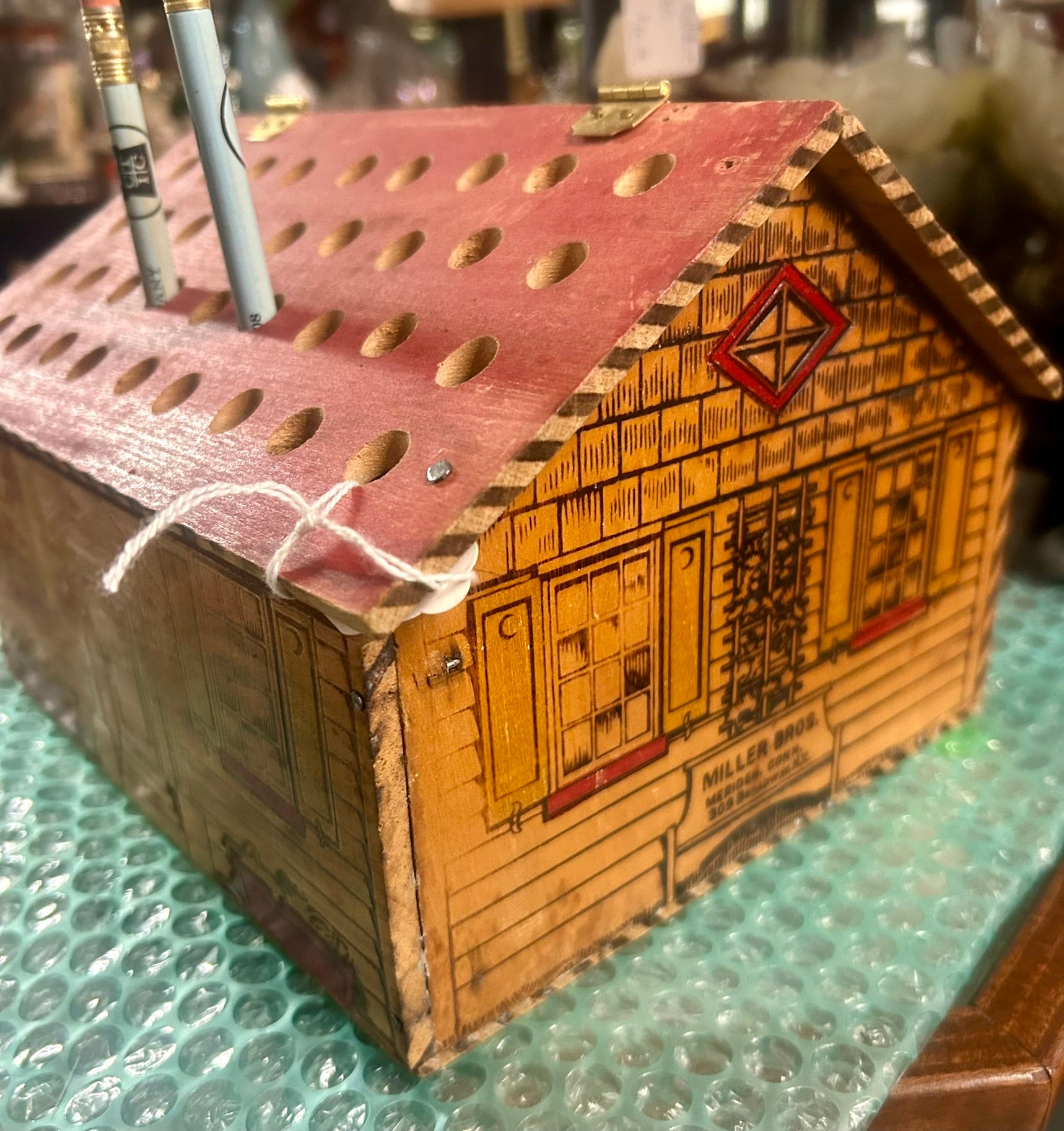 MILLER BROTHERS FIGURAL CABIN ANTIQUE ADVERTISING PENCIL DISPLAY 6" TALL X 9" WIDE X 7" DEEP. CALL OR TEXT FOR MORE INFORMATION