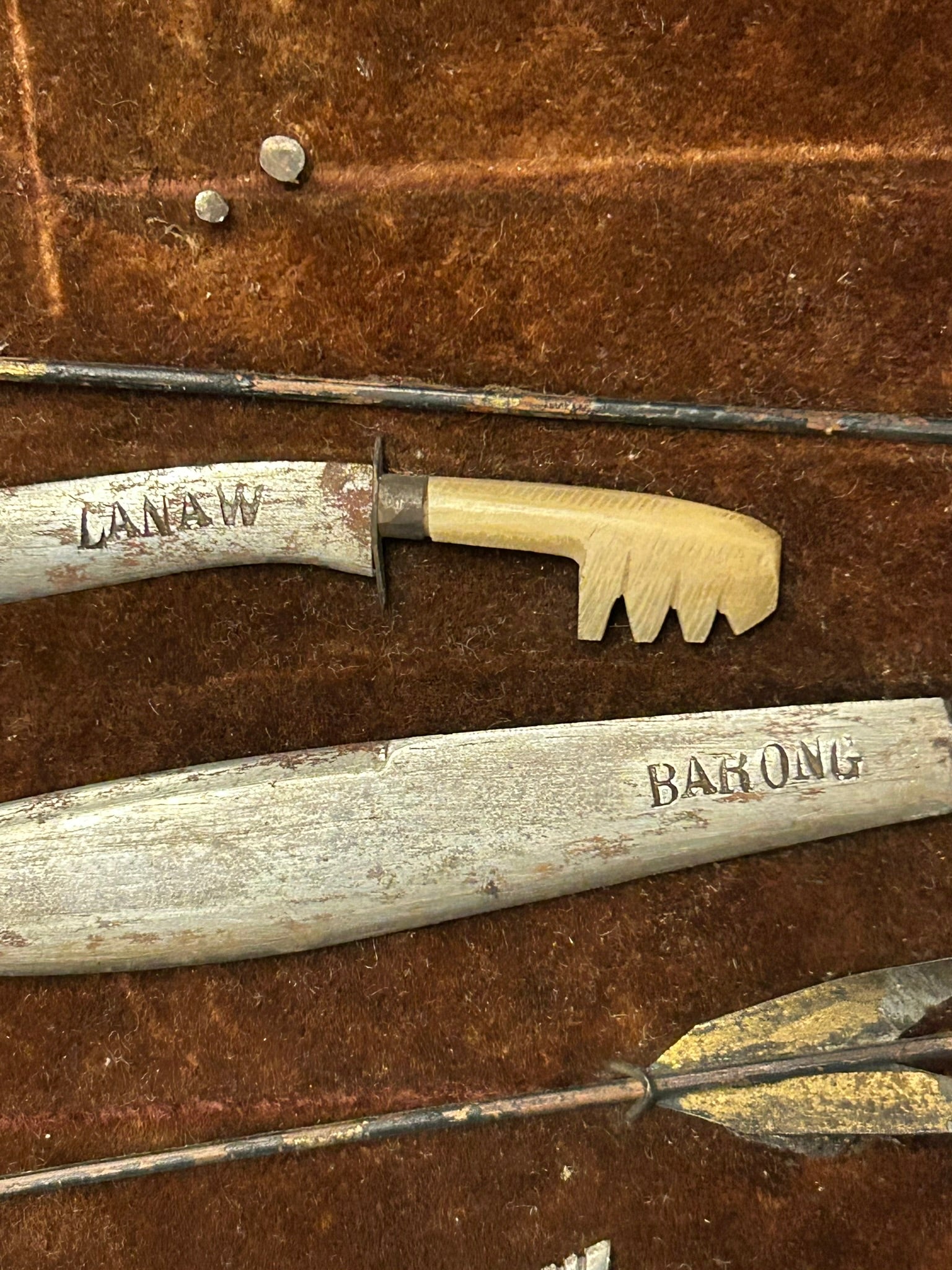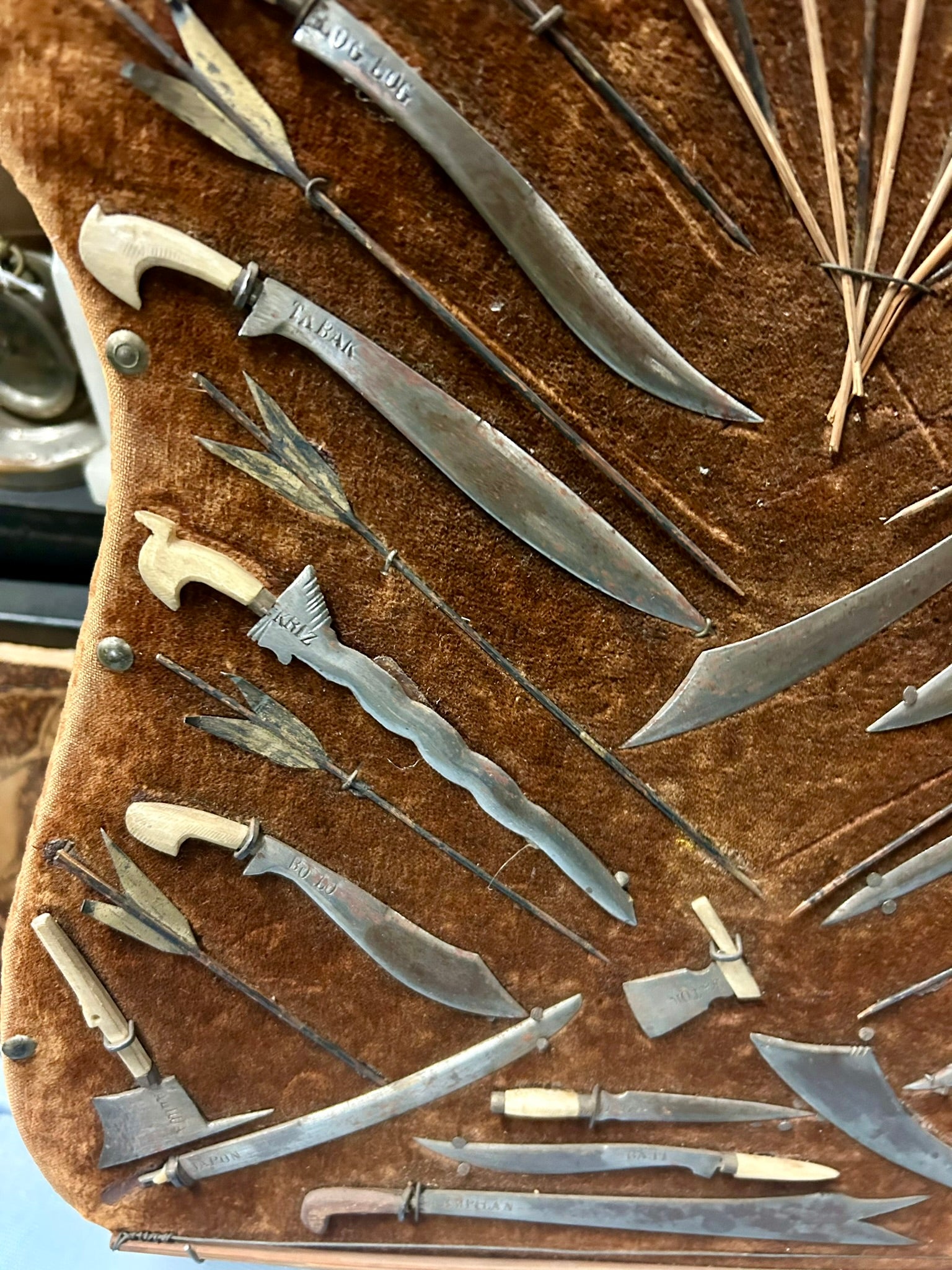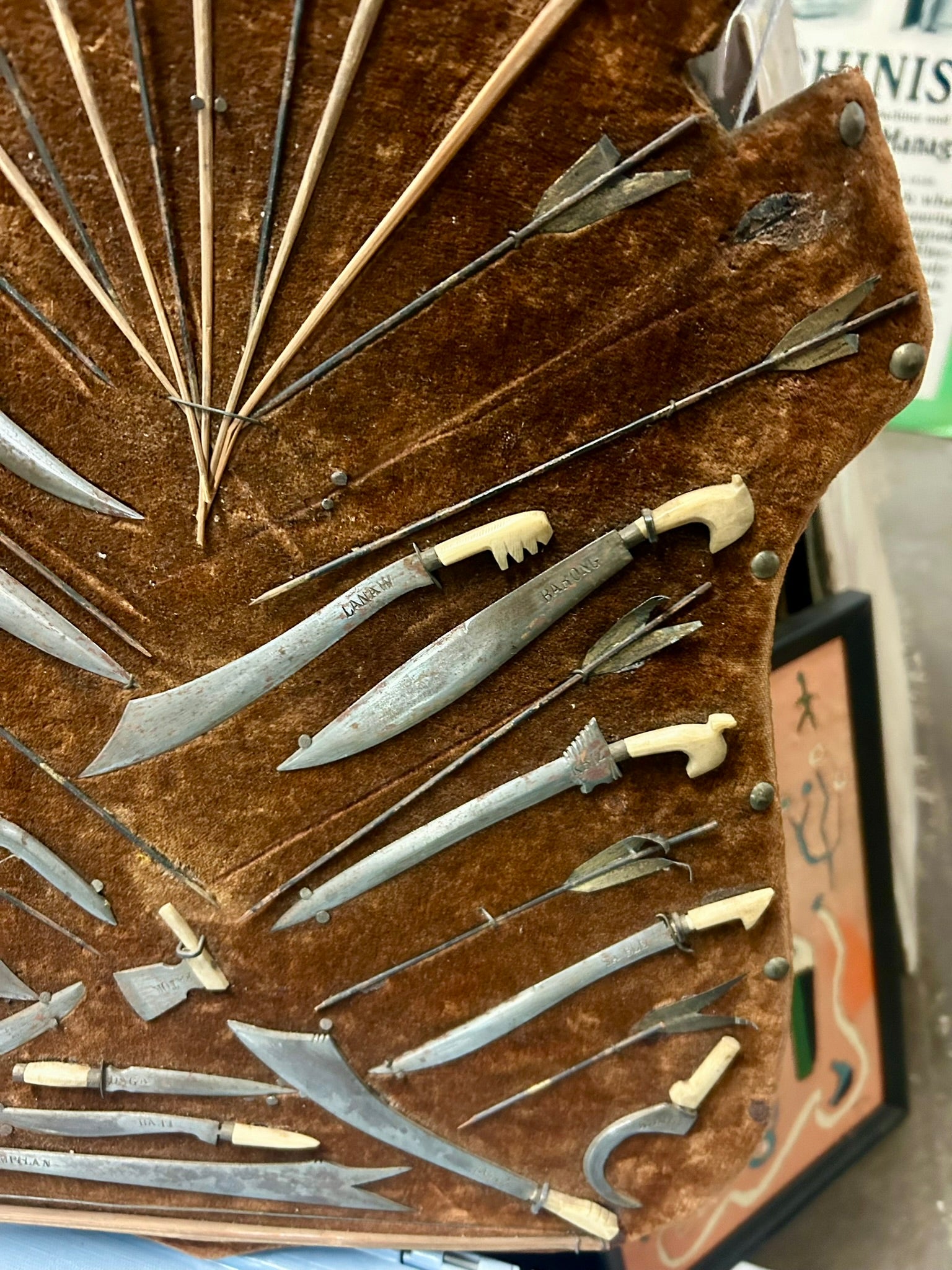MINI EDGED WEAPONS BROUGHT BACK BY SPANISH AMERICAN WAR AMERICAN SOLDIER IN LATE 1800'S, PENCIL INSCRIPTION ON BACK BY THE SOLDIER 18" X 14". CALL OR TEXT FOR MORE INFORMATION