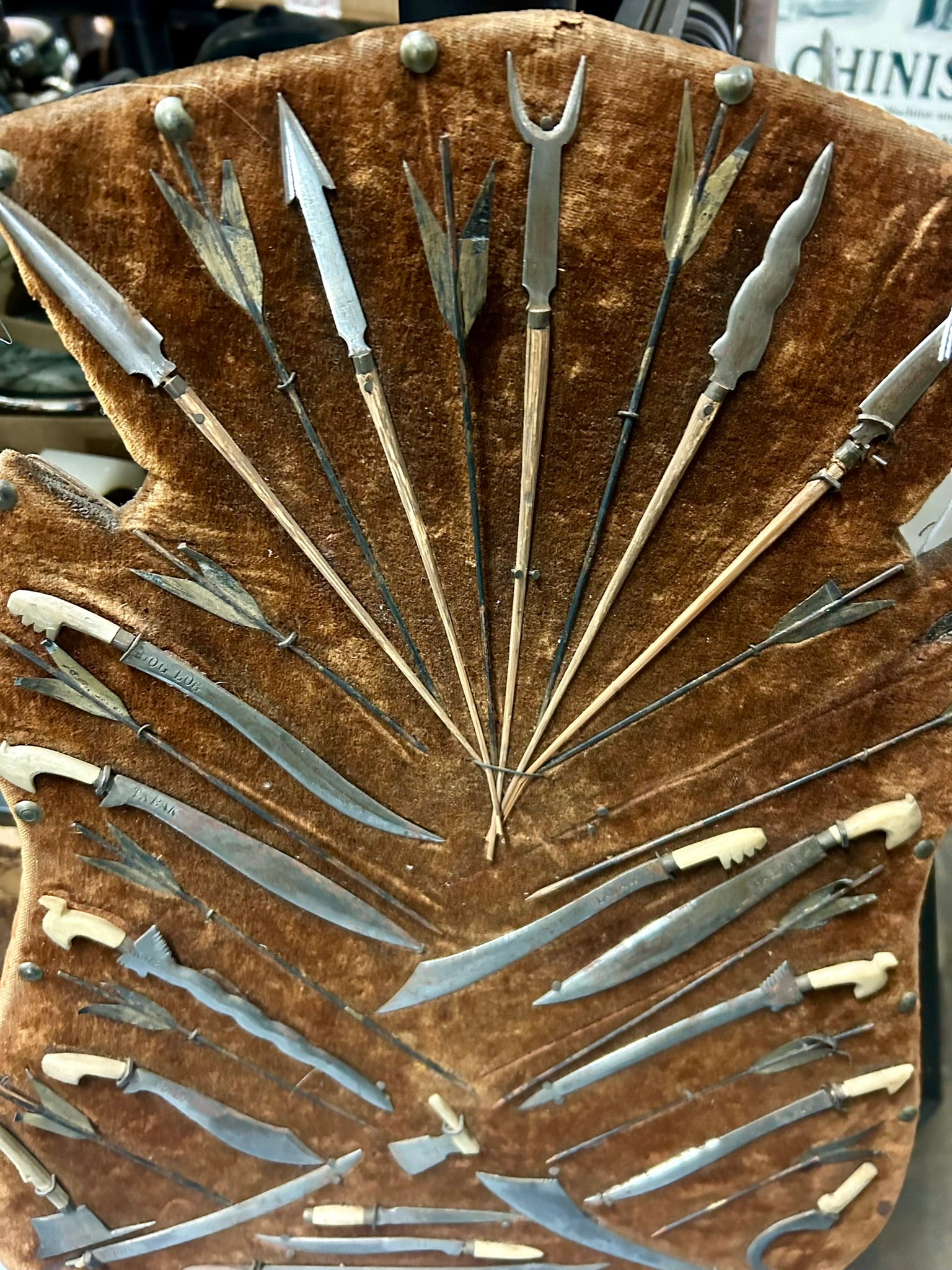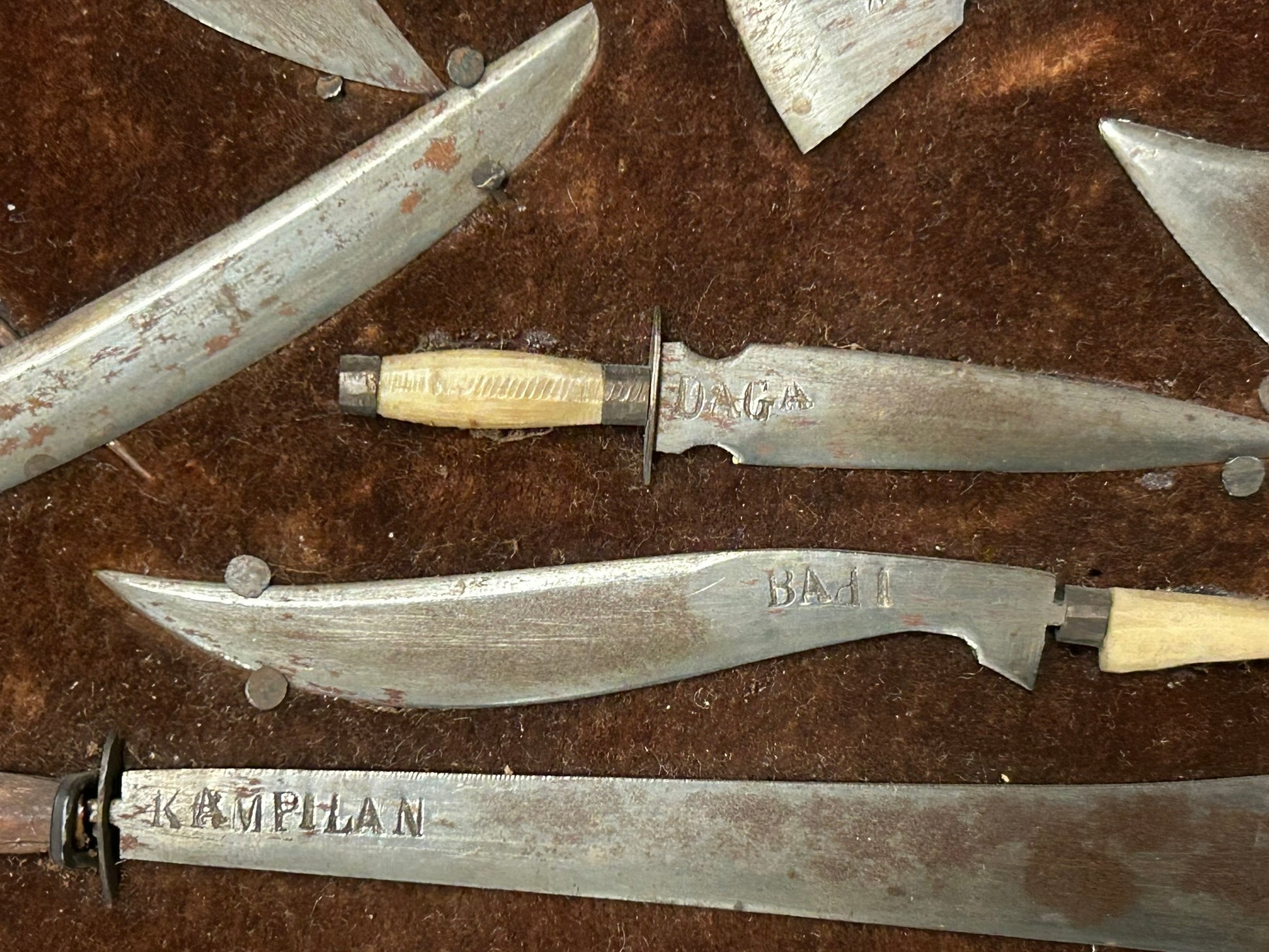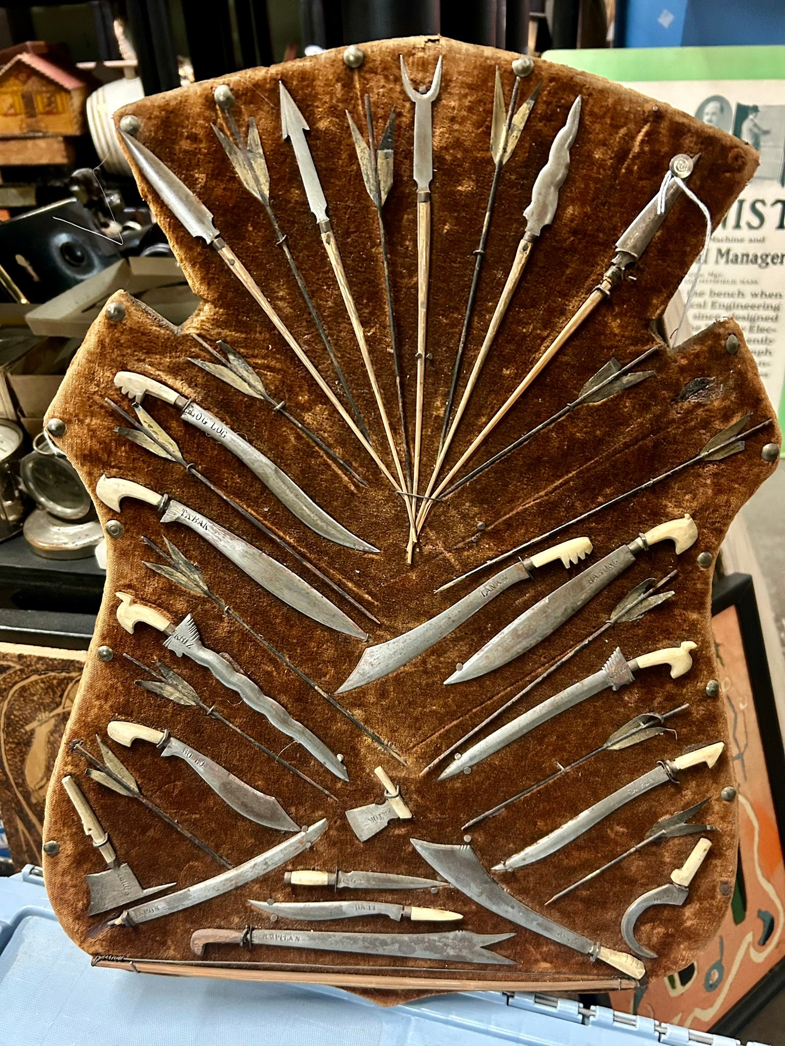 MINI EDGED WEAPONS BROUGHT BACK BY SPANISH AMERICAN WAR AMERICAN SOLDIER IN LATE 1800'S, PENCIL INSCRIPTION ON BACK BY THE SOLDIER 18" X 14". CALL OR TEXT FOR MORE INFORMATION