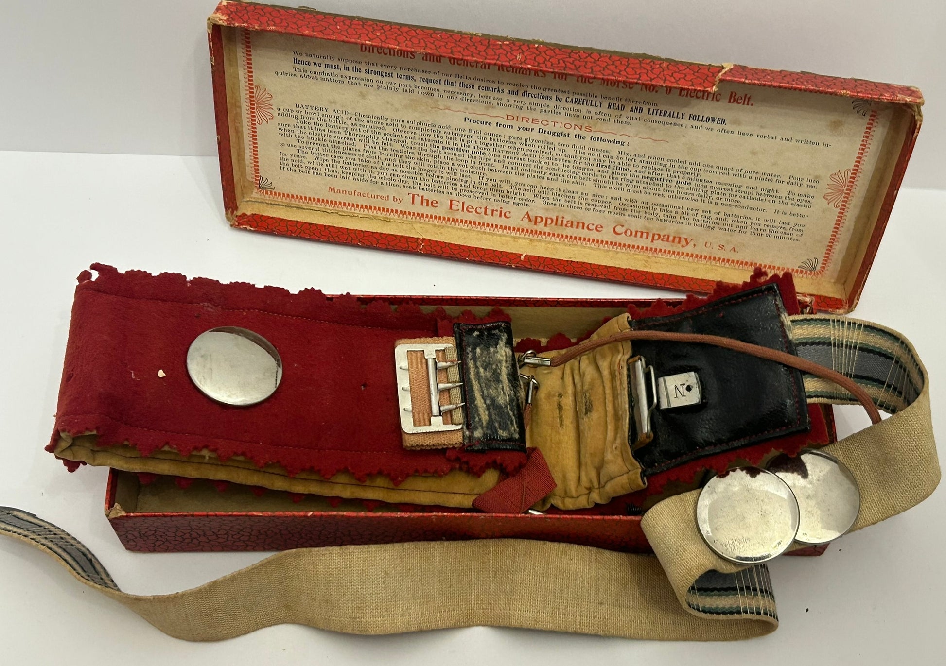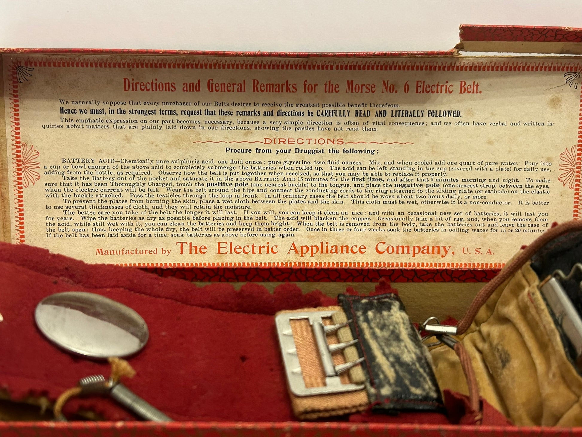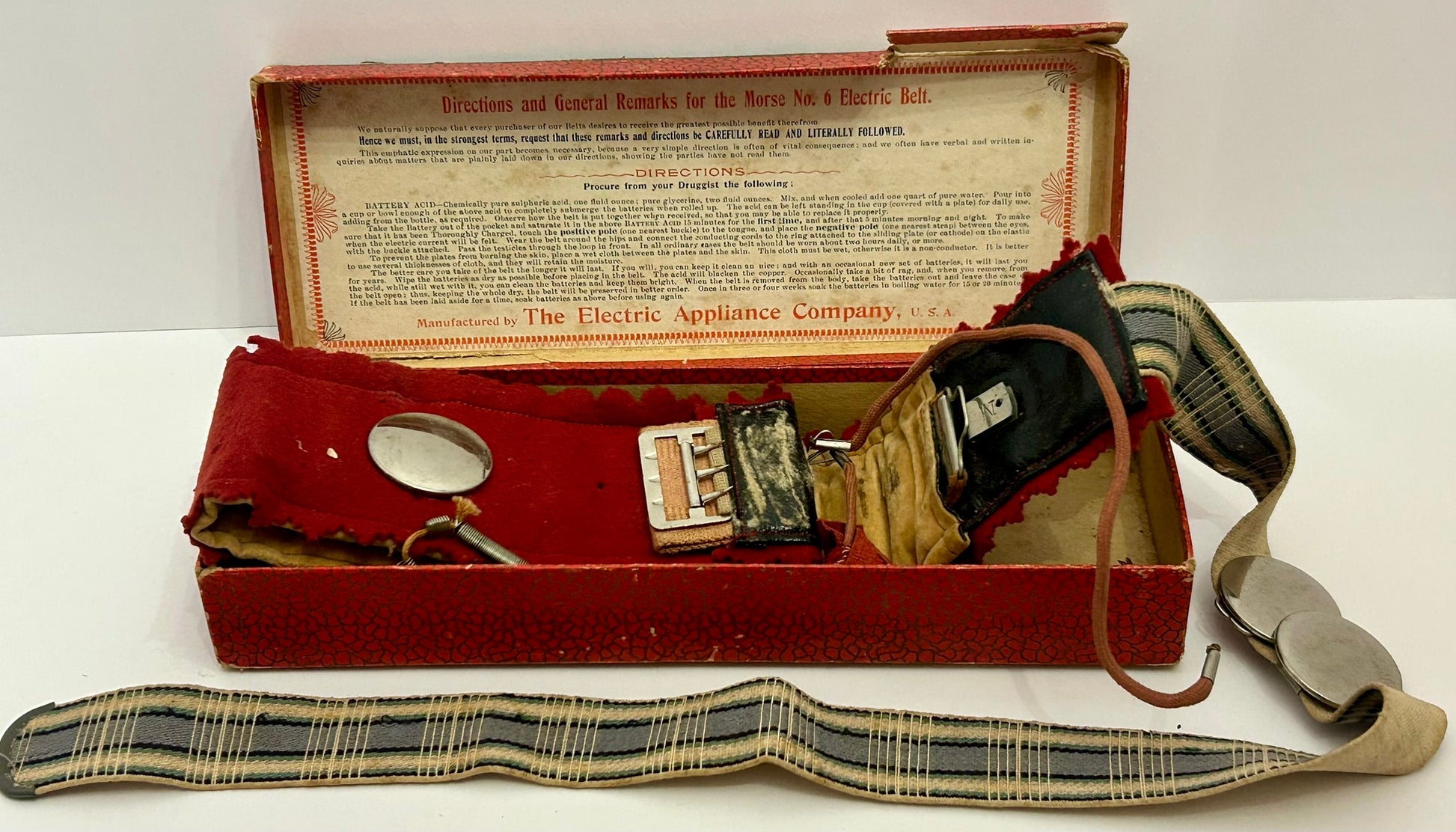MORSE ELECTRIC BELT WITH ORIGINAL BOX AND INSTRUCTIONS IN LID QUACK MEDICAL DEVICE FROM EARLY 1900'S 11 1/2" X 4" DEEP. CALL OR TEXT FOR MORE INFORMATION