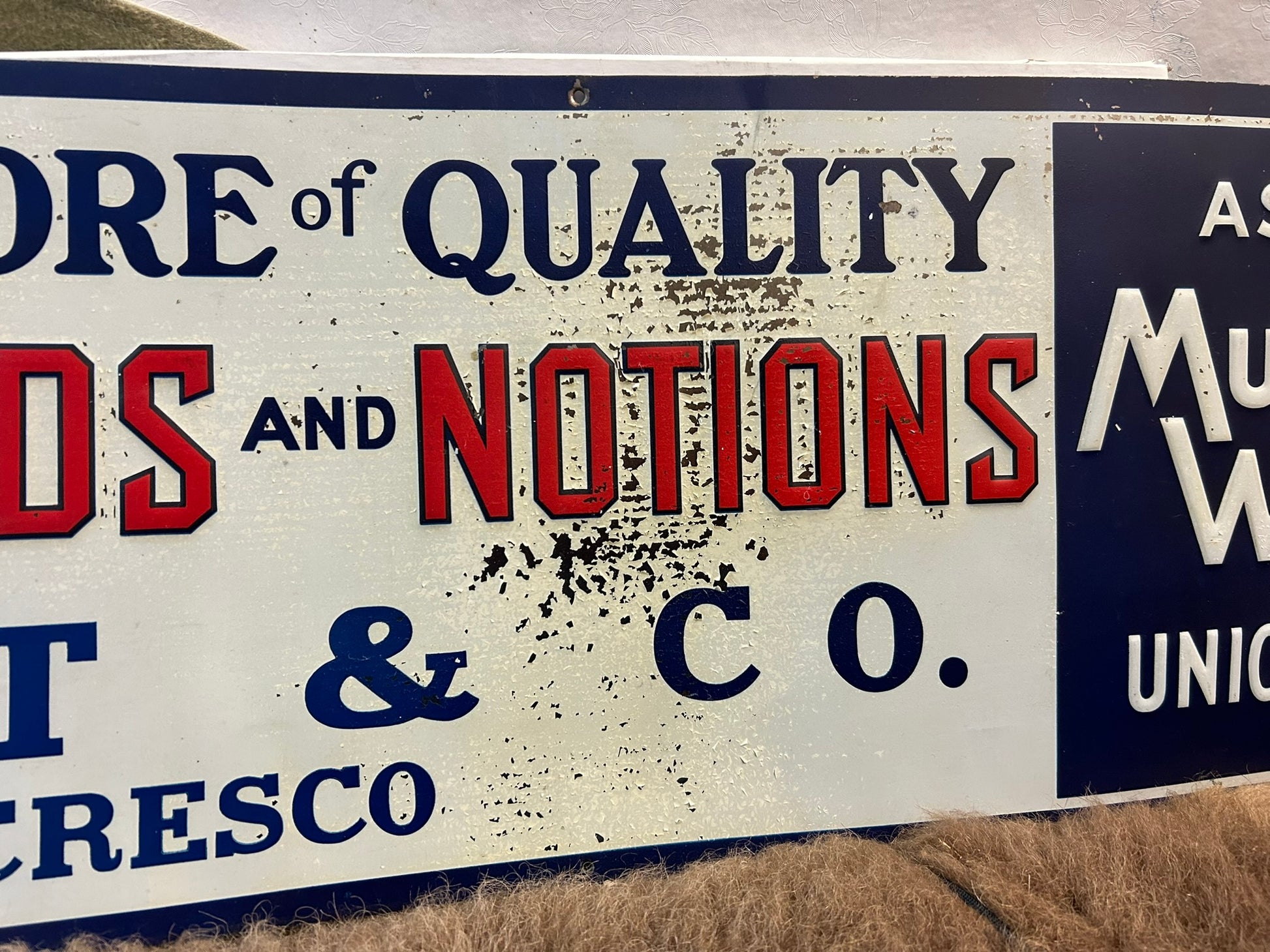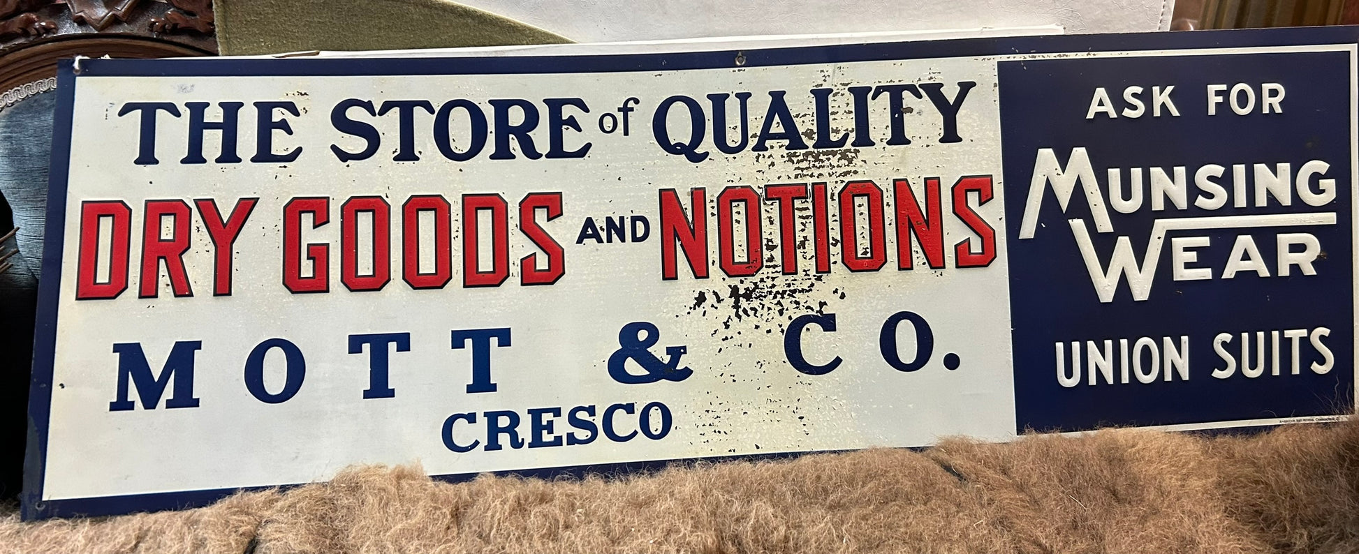 ANTIQUE TIN MUNSING WEAR UNION SUITS ADVERTISING SIGN FOR MOTT & CO. CRESCO 11 1/2" X 26". CALL, TEXT, OR E-MAIL FOR MORE INFORMATION