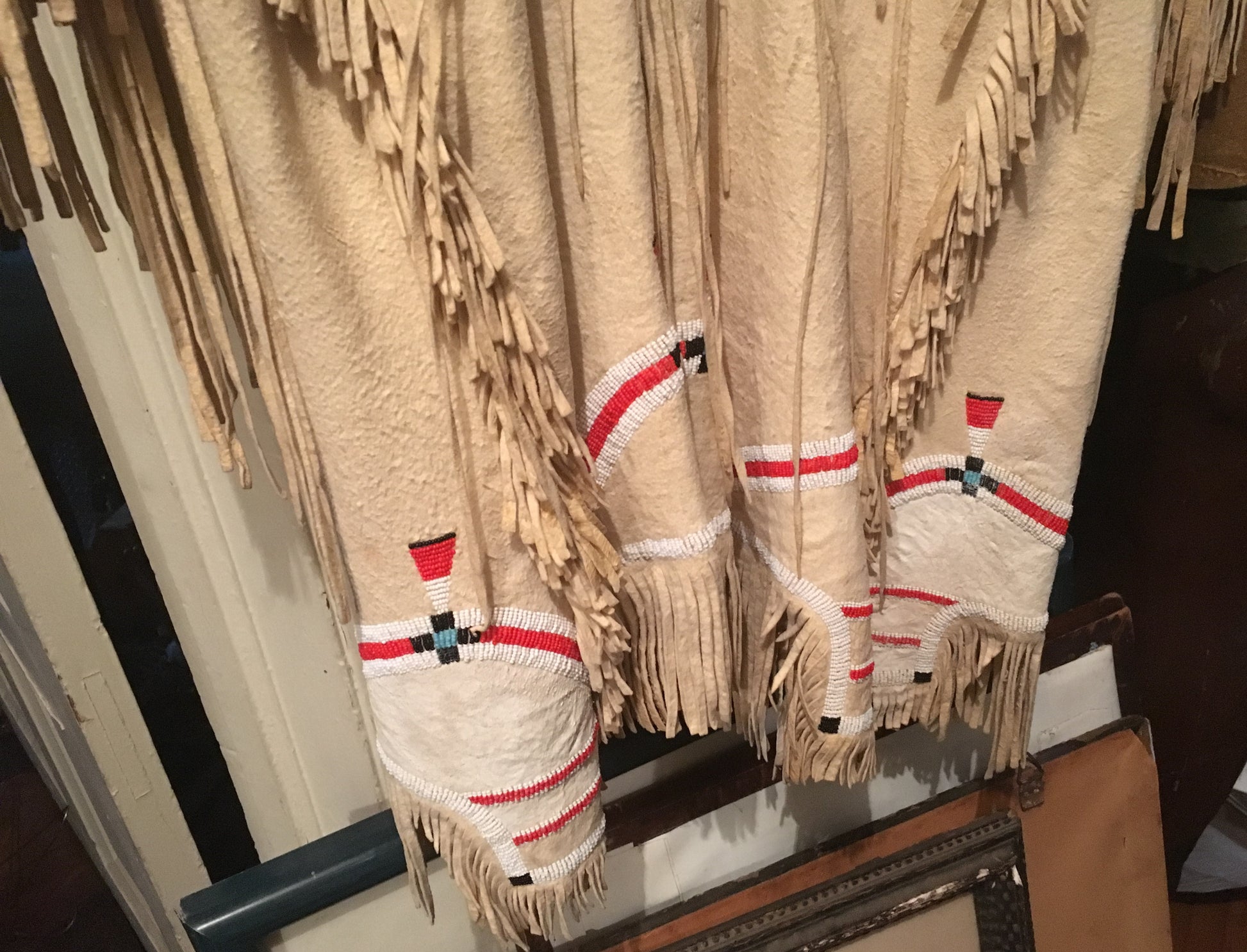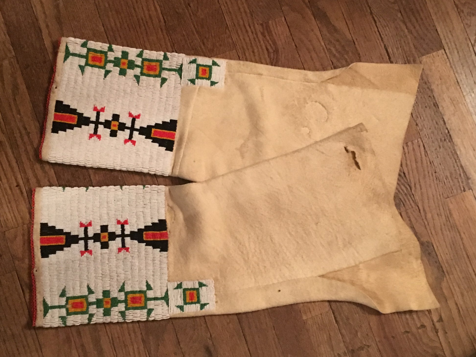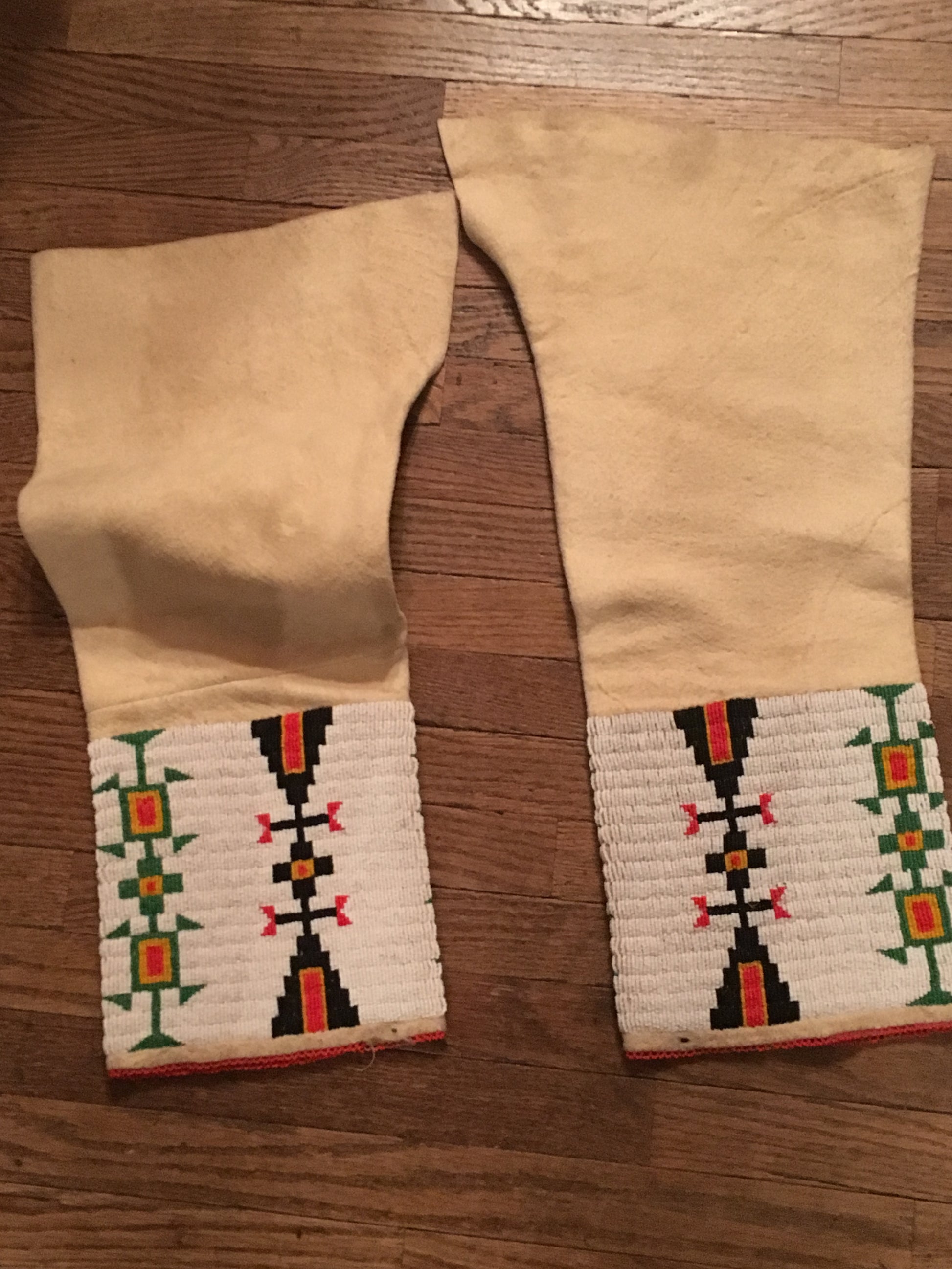 NATIVE AMERICAN CHEROKEE BEADED SINEW SEWN BRAIN TANNED BUCKSKIN BEADED DRESS AND LEGGINGS CIRCA 1930's FROM KANSAS.