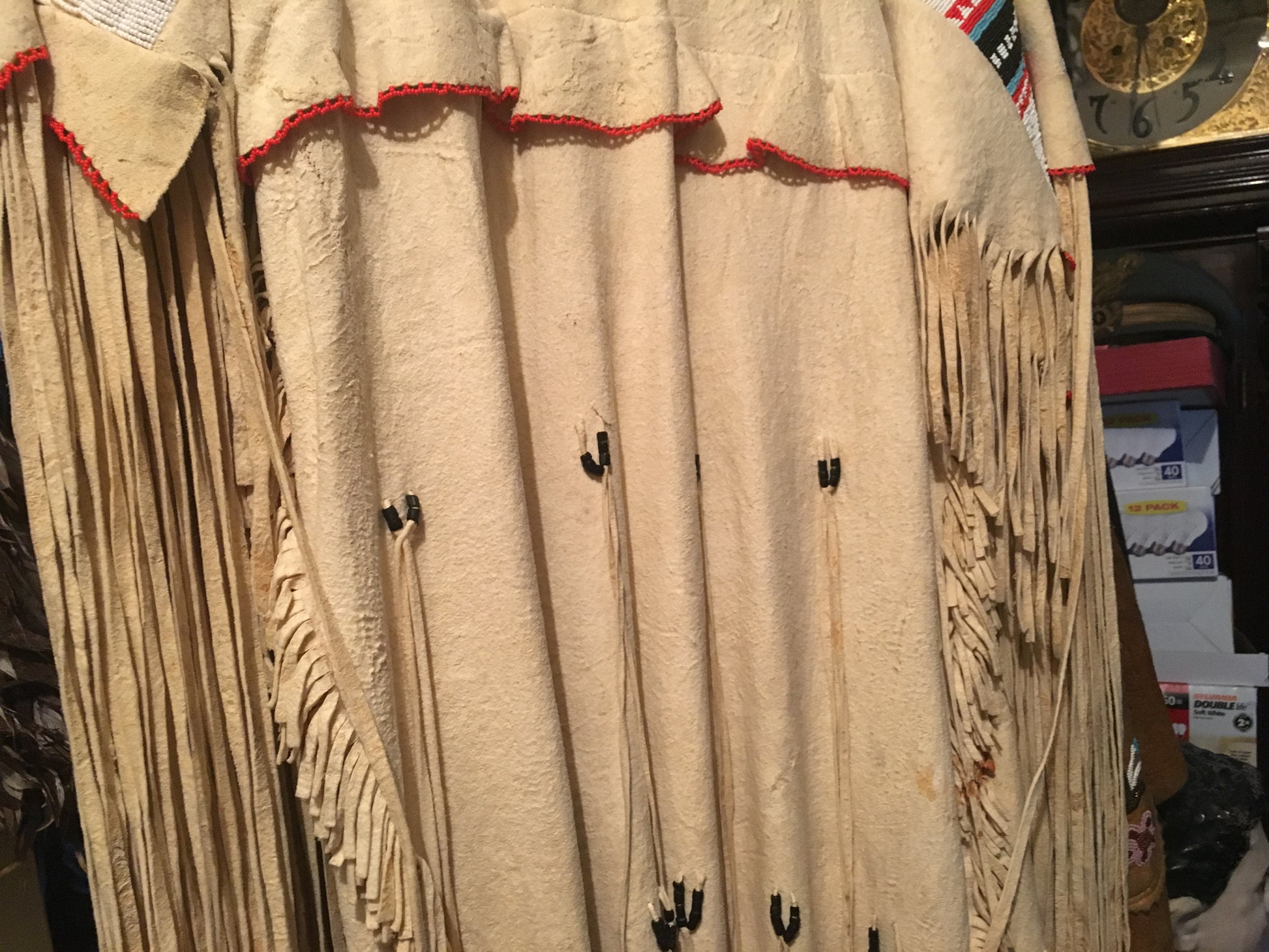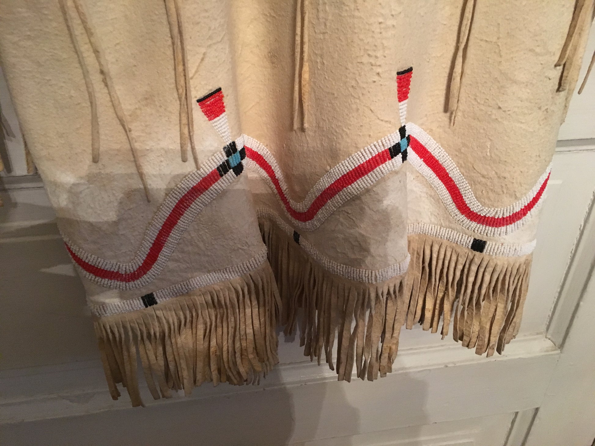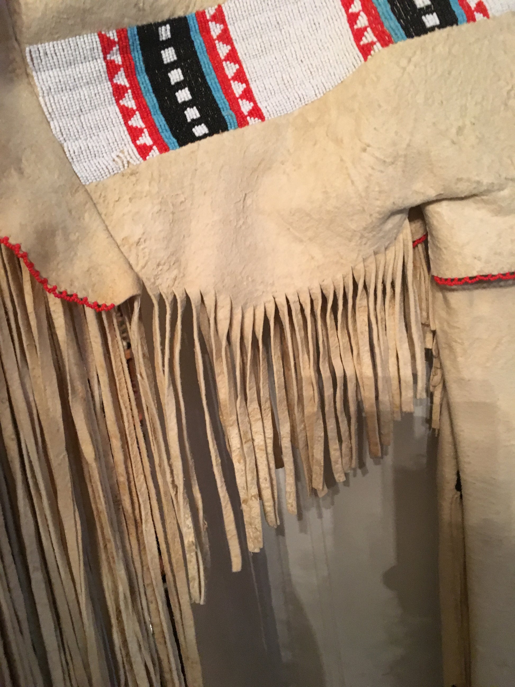 NATIVE AMERICAN CHEROKEE BEADED SINEW SEWN BRAIN TANNED BUCKSKIN BEADED DRESS AND LEGGINGS CIRCA 1930's FROM KANSAS.