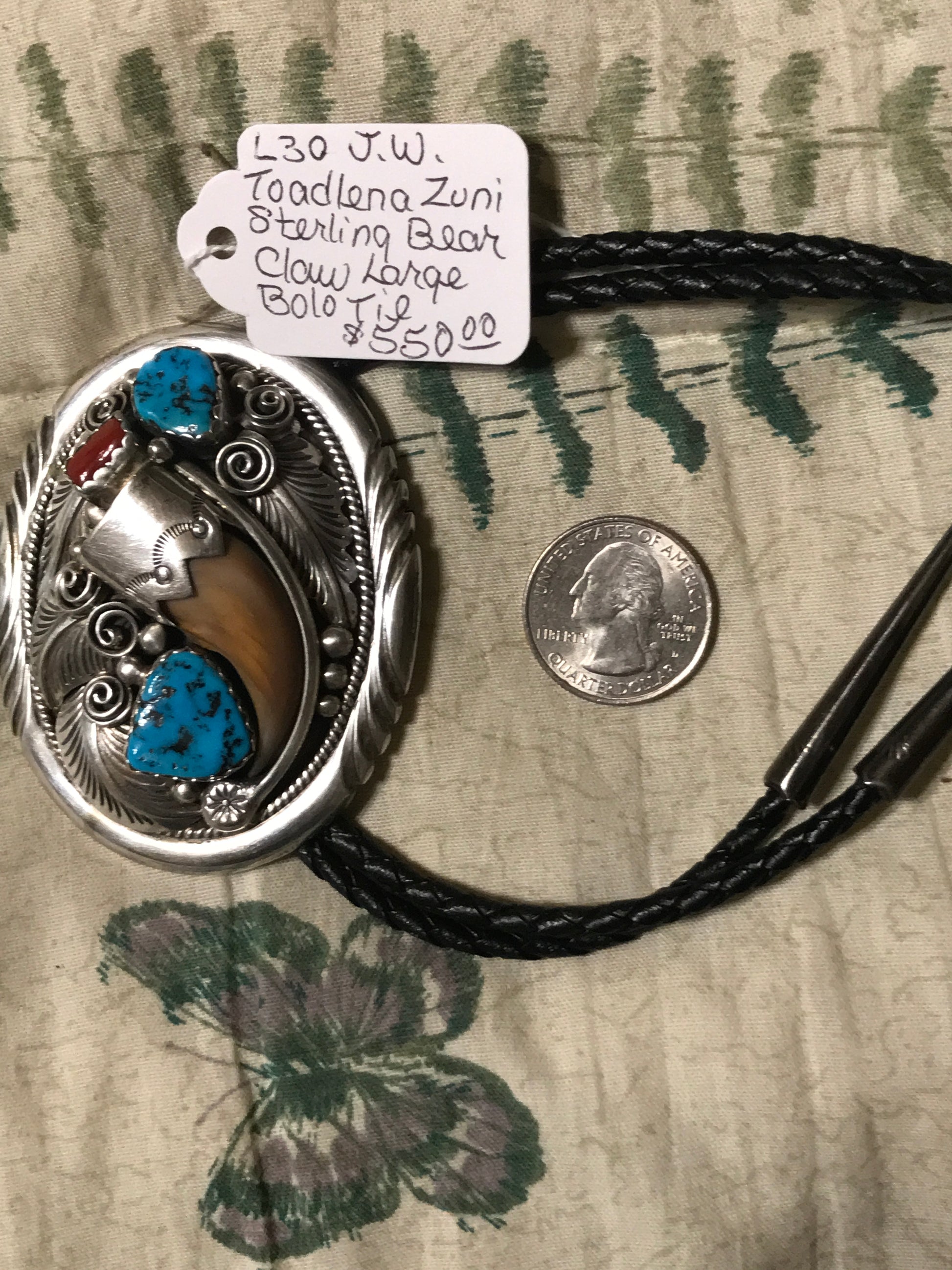 Native American J.W. Toadlena Zuni sterling large bear claw bolo tie. CALL OR TEXT FOR MORE INFORMATION