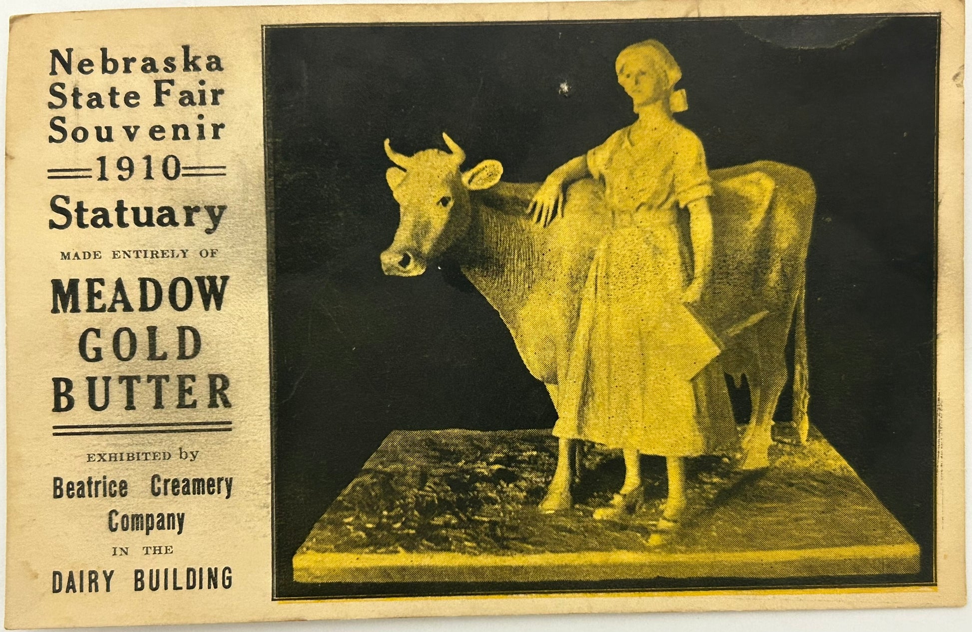 NEBRASKA STATE FAIR POSTCARD 1910 OF STATUE OF WOMAN AND COW MADE OF MEADOW GOLD BUTTER