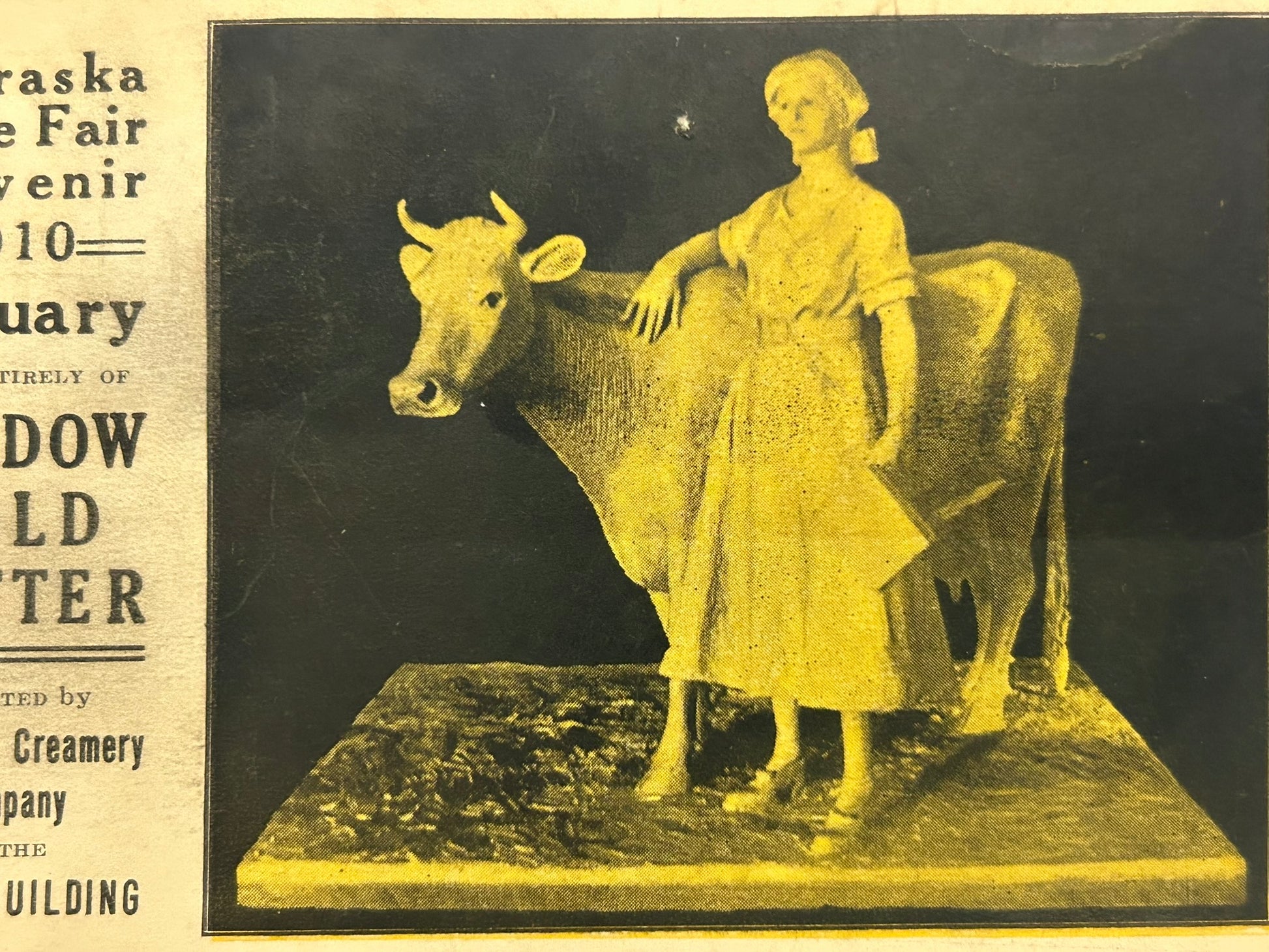 NEBRASKA STATE FAIR 1910 POSTCARD OF WOMAN AND COW MADE OF MEADOW GOLD BUTTER. CALL OR TEXT FOR MORE INFORMATION