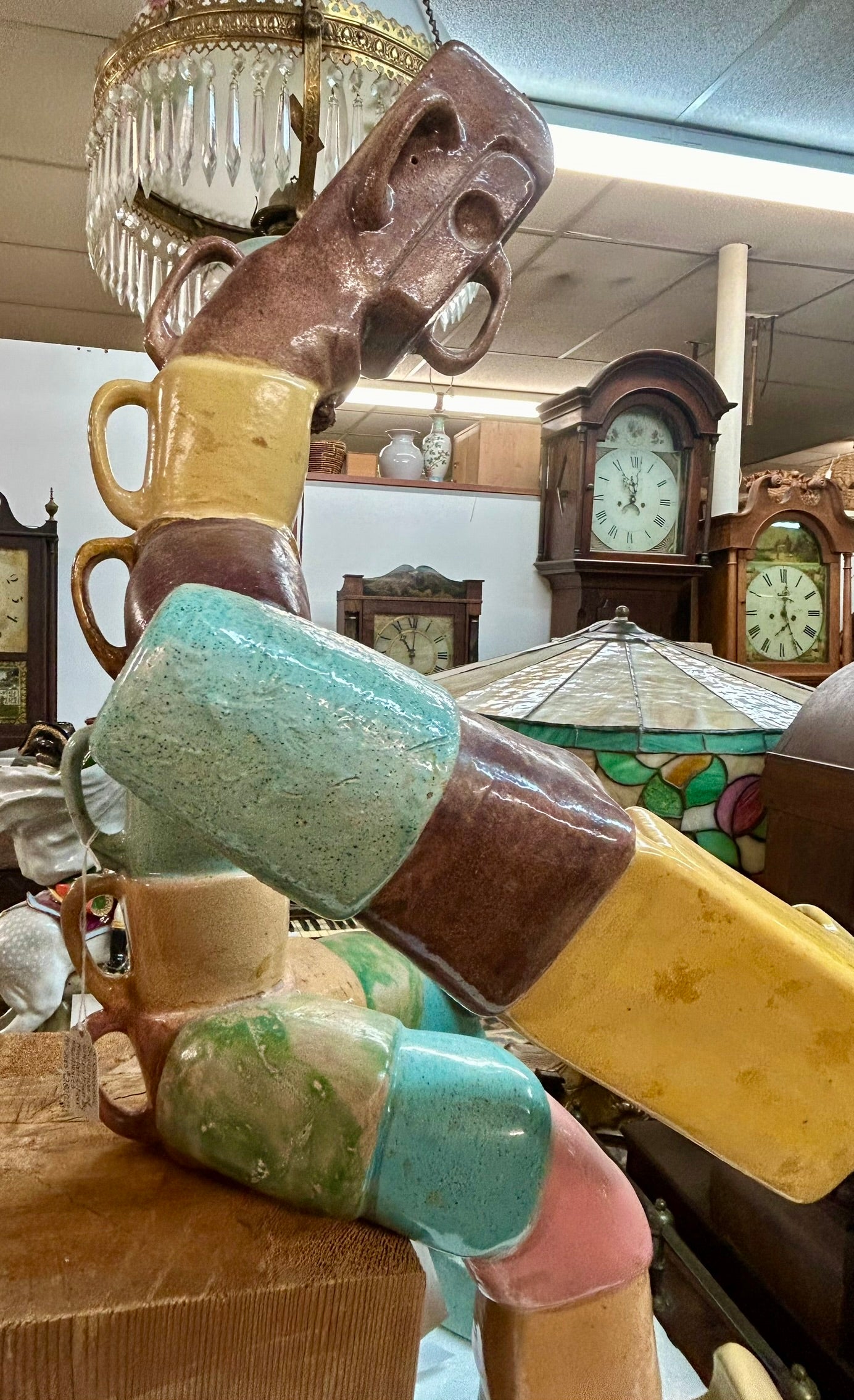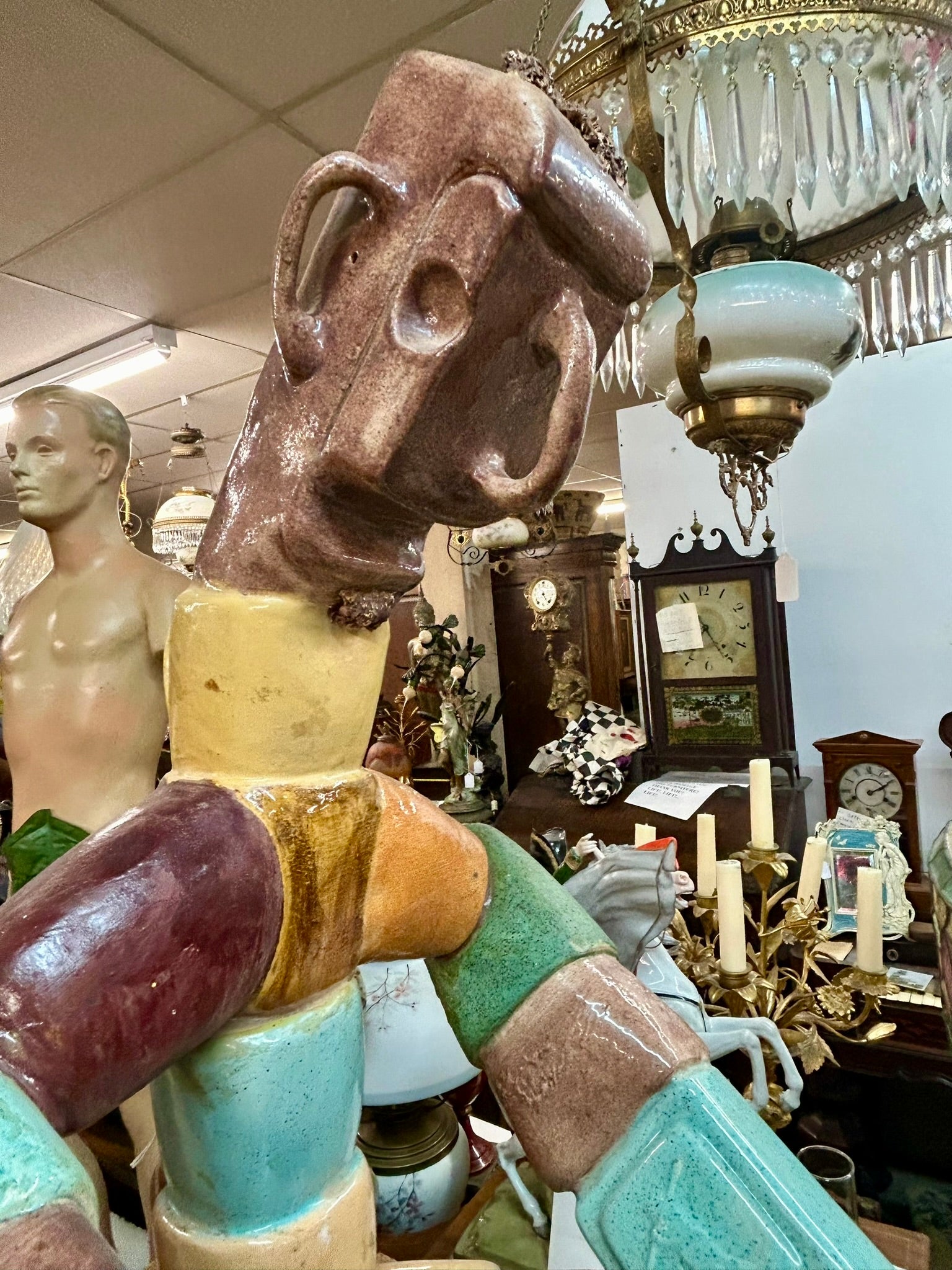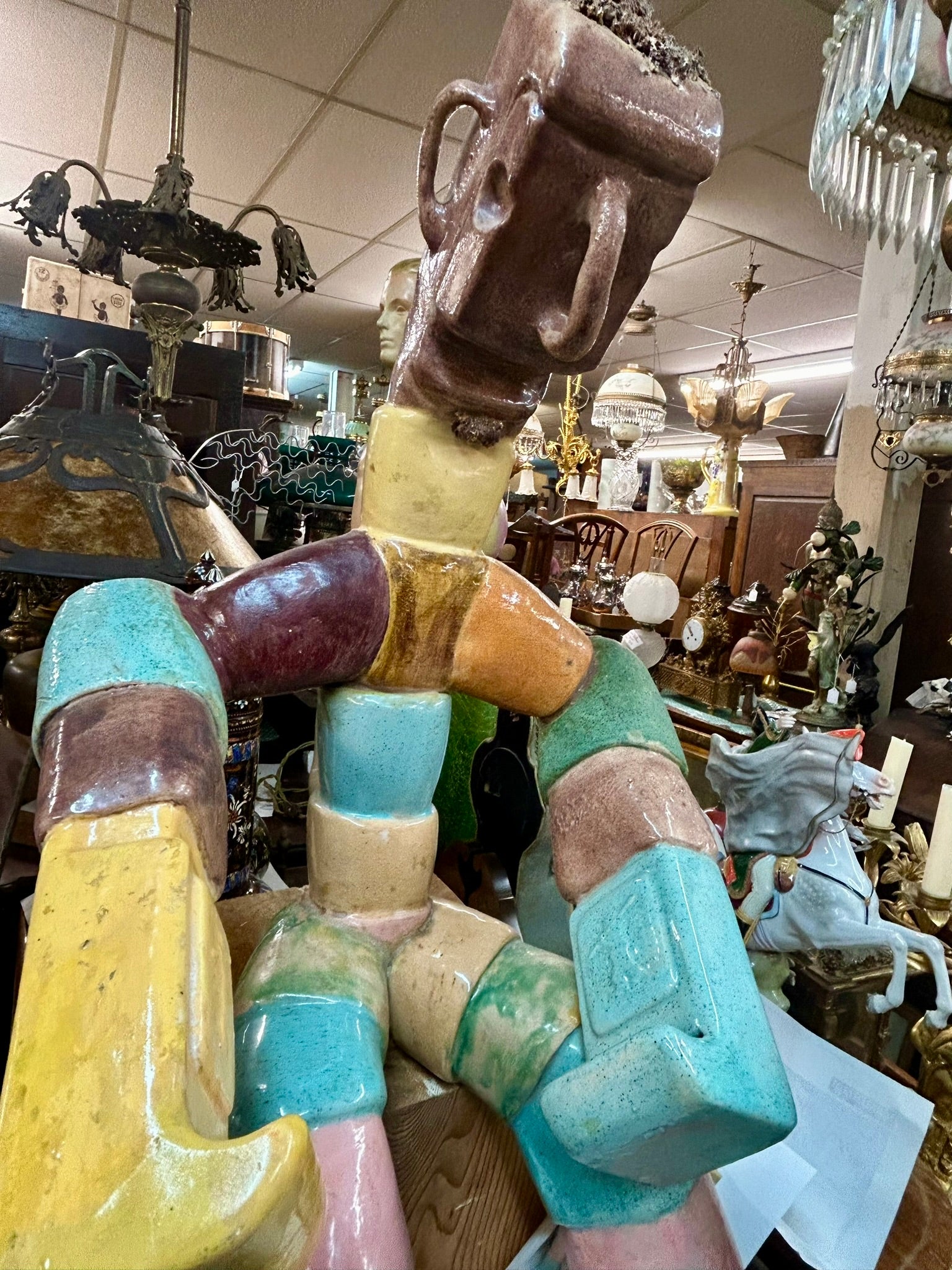 NEW MEXICO ARTIST HARLAN LIZER BORN 1911 & DIED 2003 CERAMIC SCULPTURE OF SITTING MAN MADE TO RESEMBLE BEING MADE FROM CUPS AND MATCH HOLDERS, 28" TALL. CALL, TEXT, OR E-MAIL FOR MORE INFORMATION