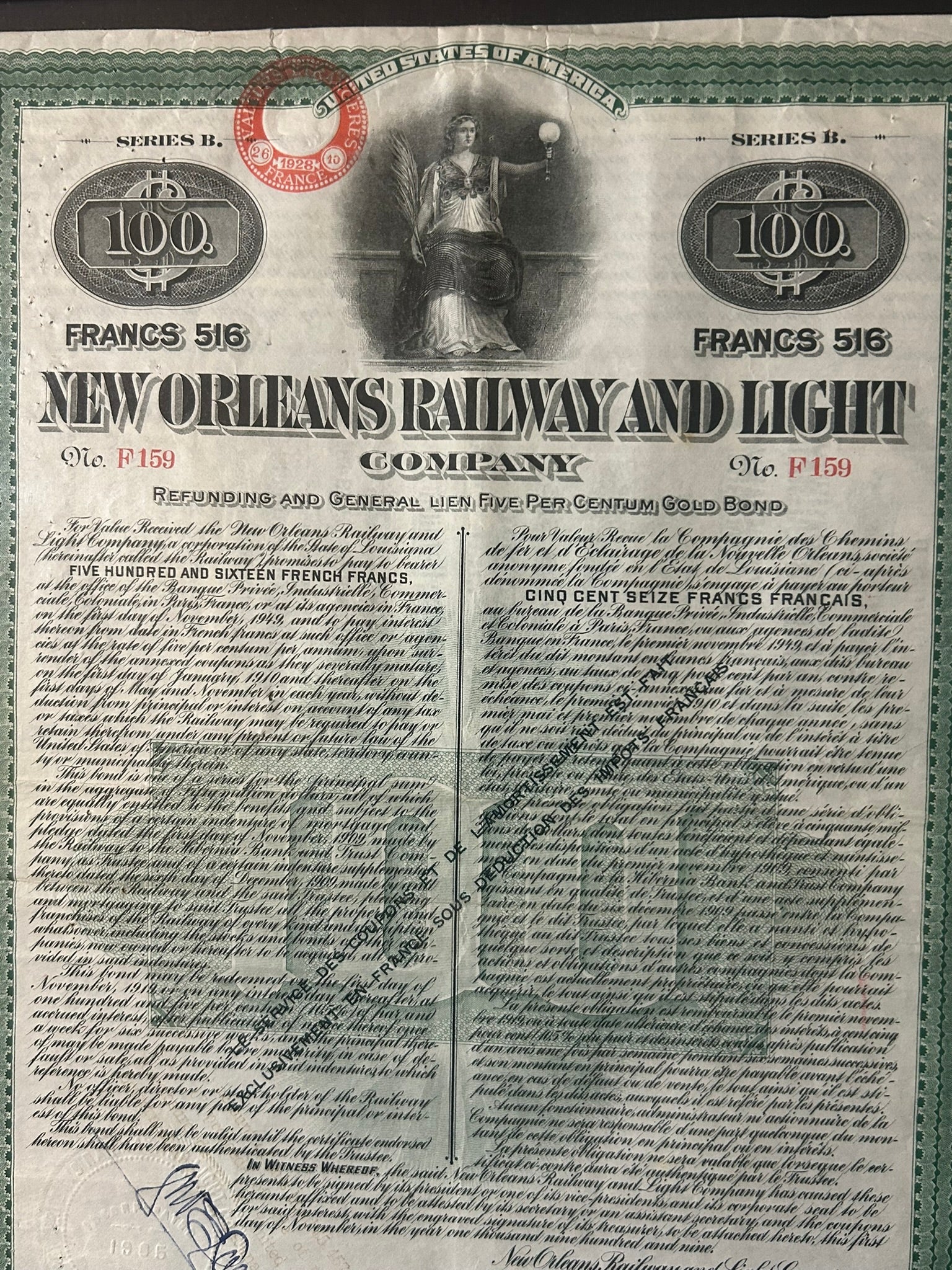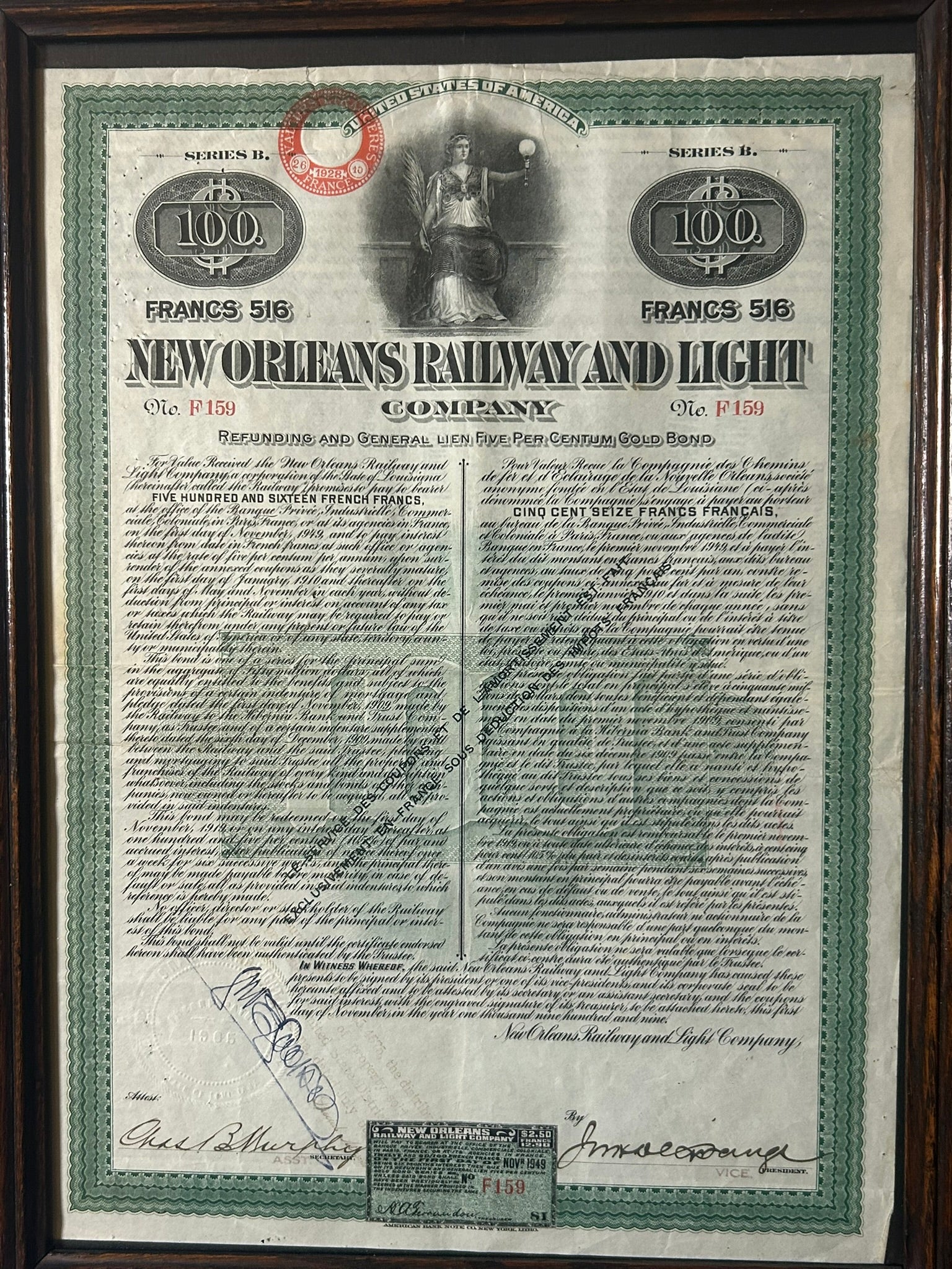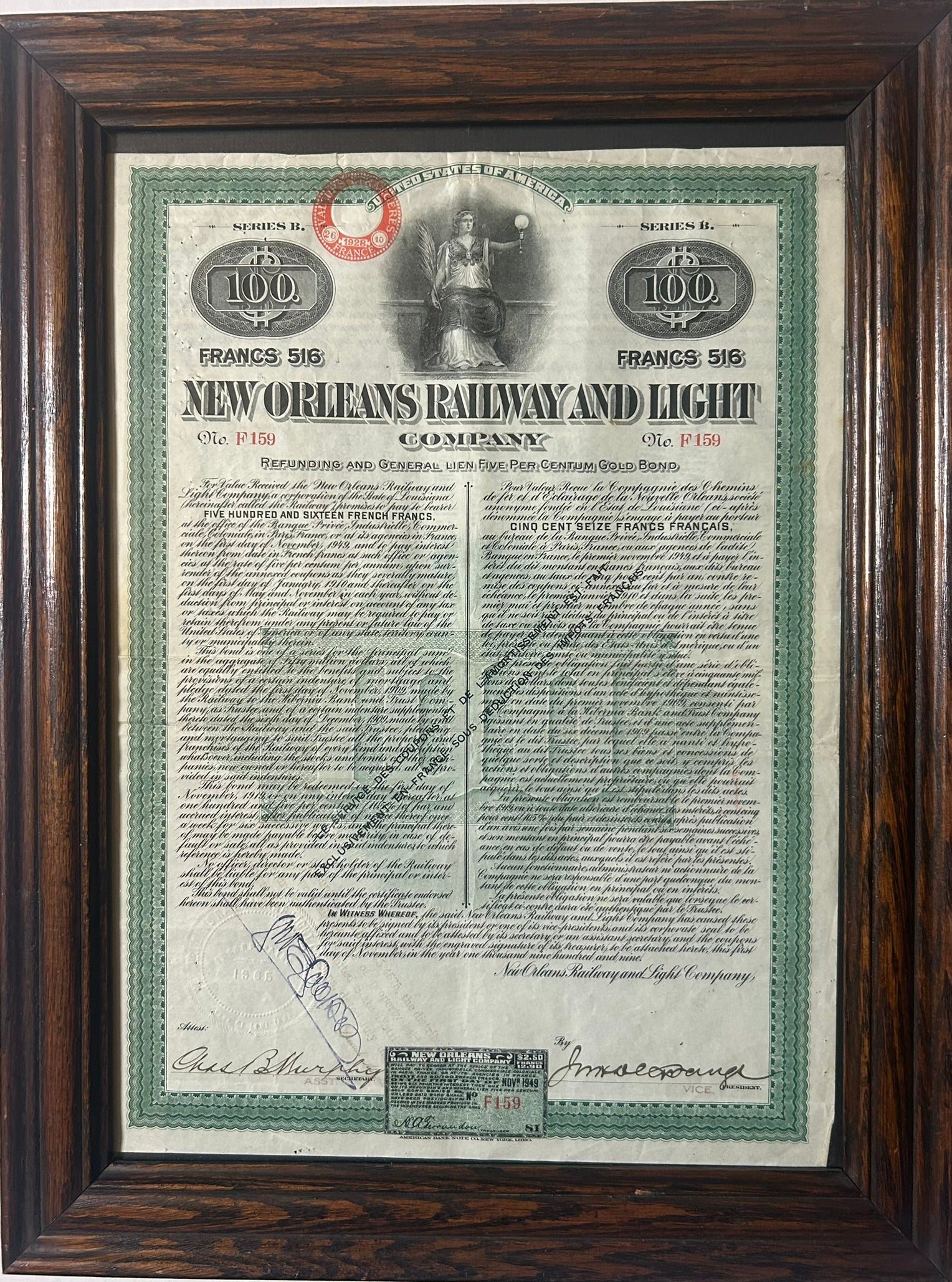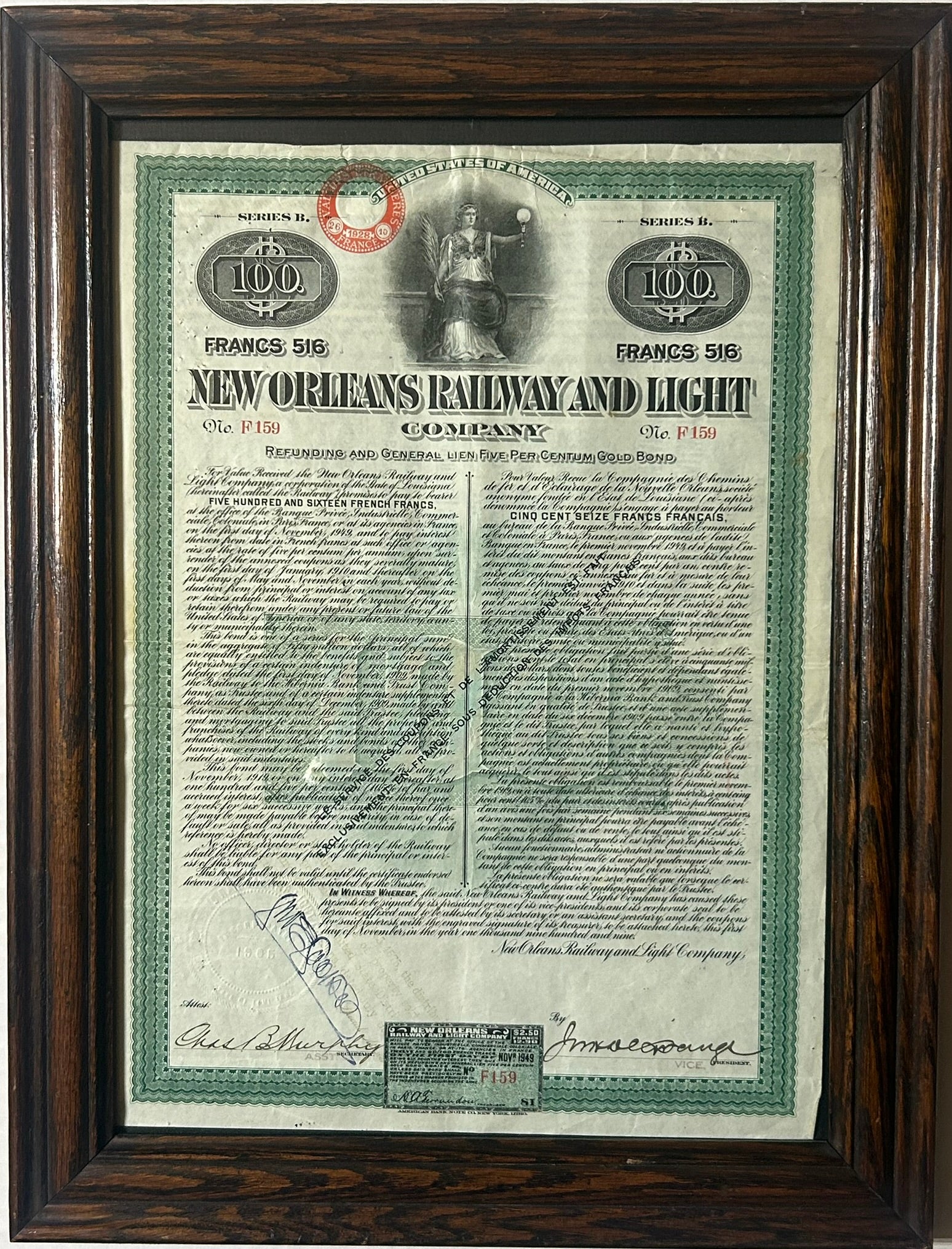 NEW ORLEANS RAILWAY & LIGHT CO, 1905 STOCK CERTIFICATE 13 1/4" X 9 1/2" WITHOUT FRAME SIZE. CALL OR TEXT FOR MORE INFORMATION