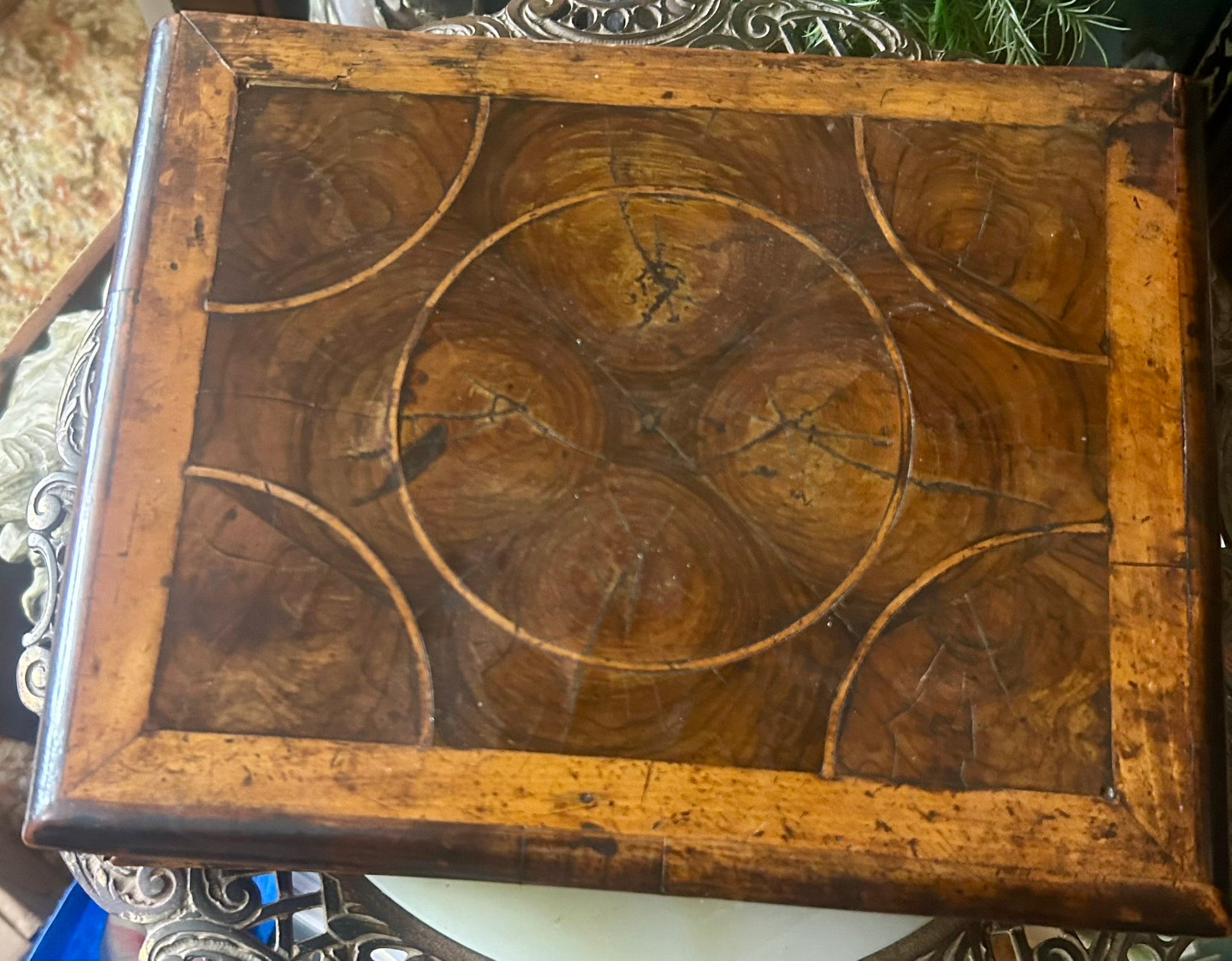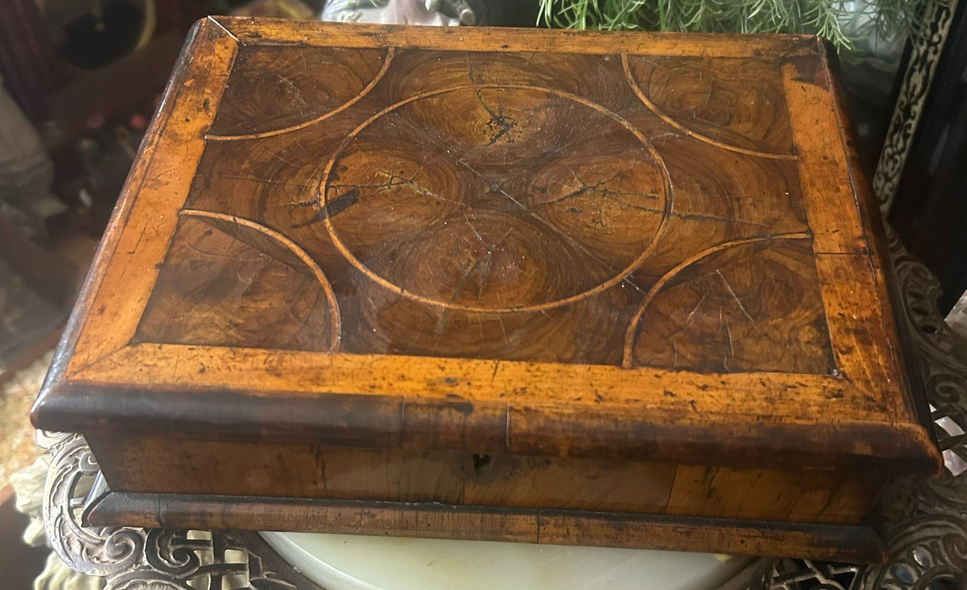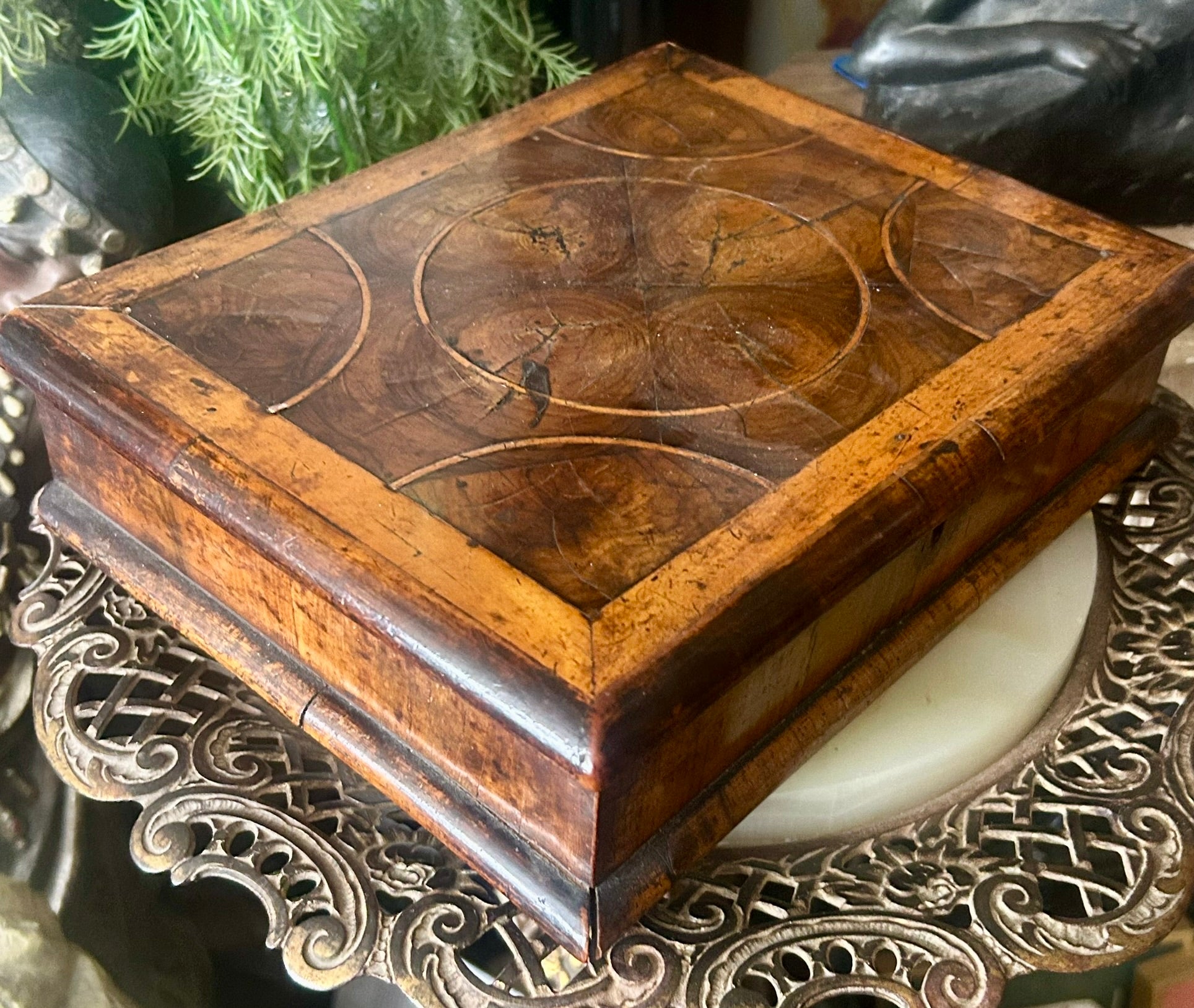 OYSTERWOOD CIRCA 1700 INLAID WOOD BOX FOR HOLDING LACE 11" WIDE X 8" DEEP X 3" HIGH. CALL OR TEXT FOR MORE INFORMATION