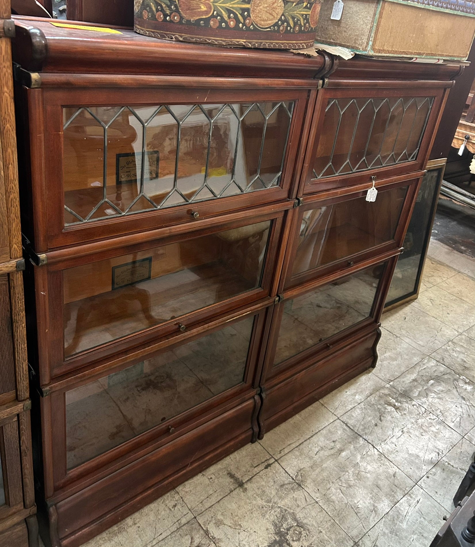 ANTIQUE PAIR OF 3/4 SIZE TRIPLE STACK MAHOGANY BARRISTER BOOKCASES WITH LEADED TOP SECTIONS, EACH STACK 46" TALL X 26" WIDE X 9 1/2" DEEP AND WITH GOOD ORIGINAL FINISH. CALL, TEXT, OR E-MAIL FOR MORE INFORMATION