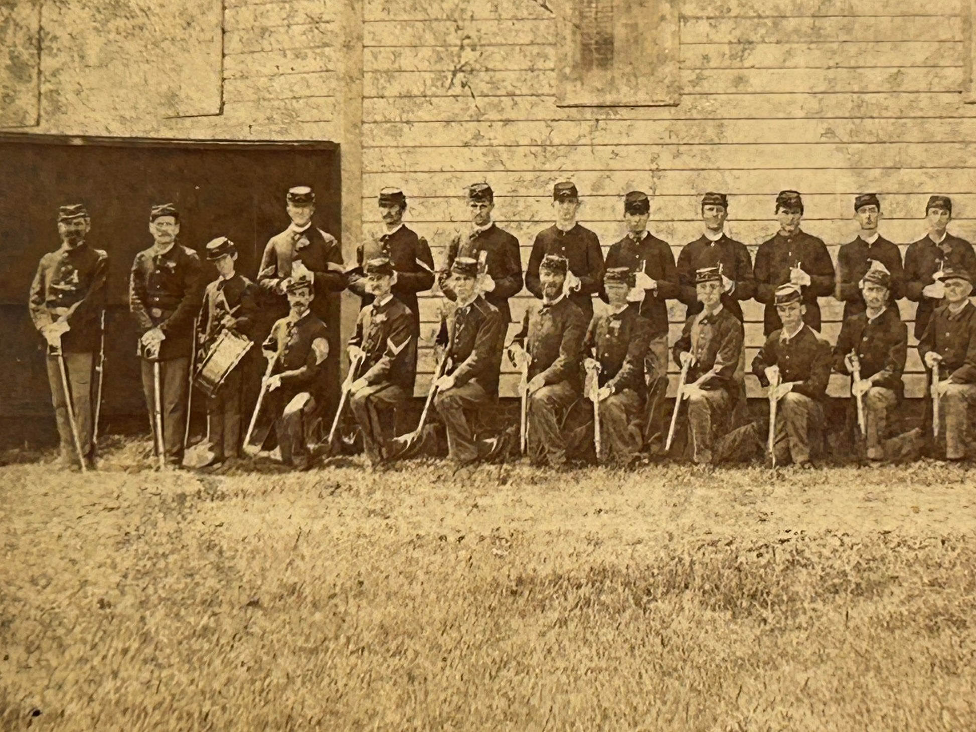 CABINET CARD PHOTO OF LARGE GROUP OF 1870'S SOLDIERS IN FRONT OF A FORT BUILDING 4" X 7". CALL OR TEXT FOR MORE INFORMATION. ON HOLD