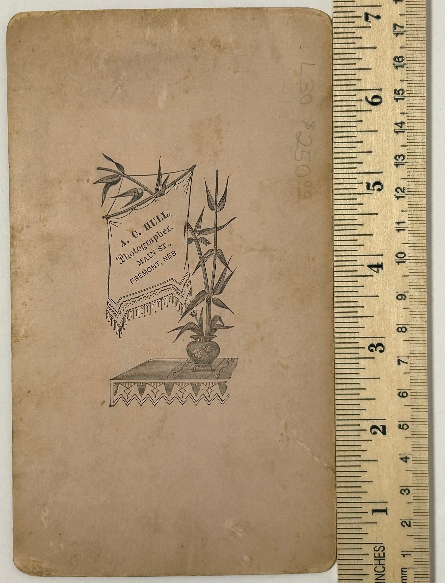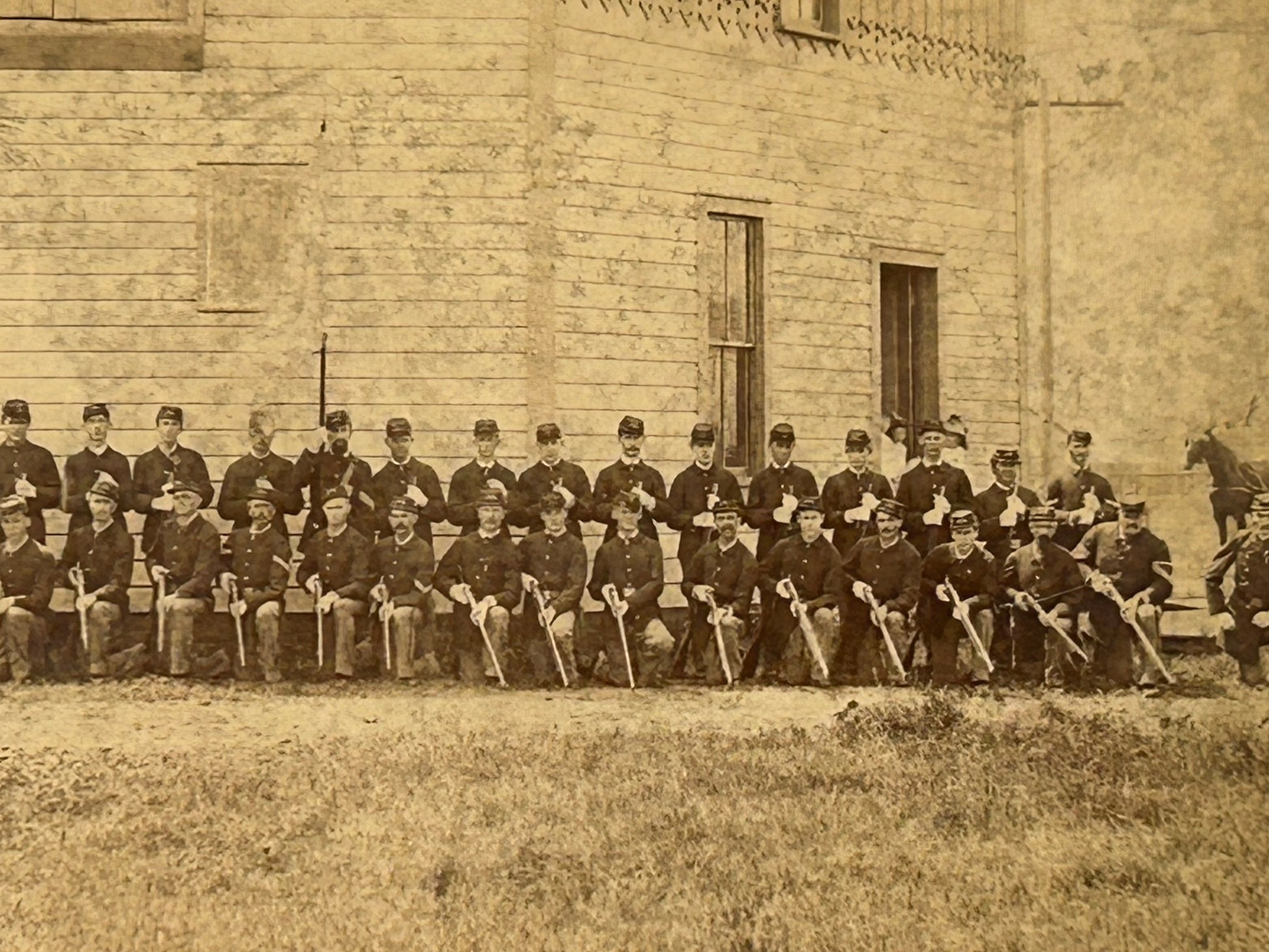 ON HOLD AND NOT SOLD YET. LARGE GROUP OF SOLDIERS IN FRONT OF FORT BUILDING BY FREMONT NEBR. PHOTOGRAPHER A. C. HULL