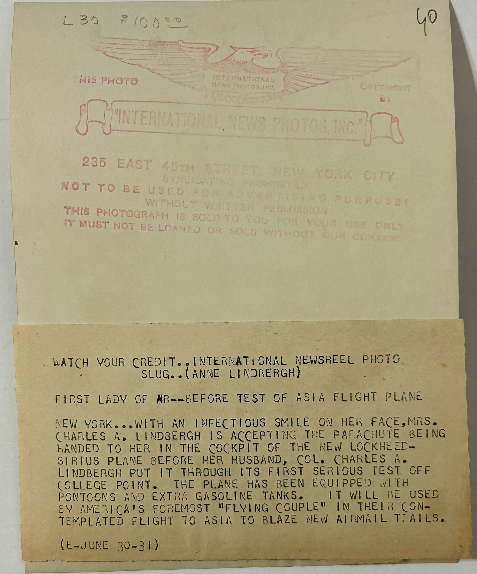 WIRE SERVICE PHOTOGRAPH OF MRS. CHARLES LINDBERGH IN COCKPIT RECEIVING A PARACHUTE IN 1931 8" X 6". SHIPPING IS EXTRA SO CALL OR TEXT TO FIND OUT HOW MUCH SHIPPING WILL COST