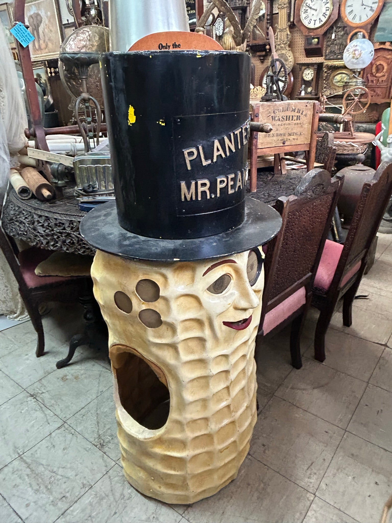 Planters Peanuts large Mr. Peanut advertising body and face mask out of hard paper mache in excellent shape and approximately 4 1/2' tall. Please call, text, or e-mail for more information.