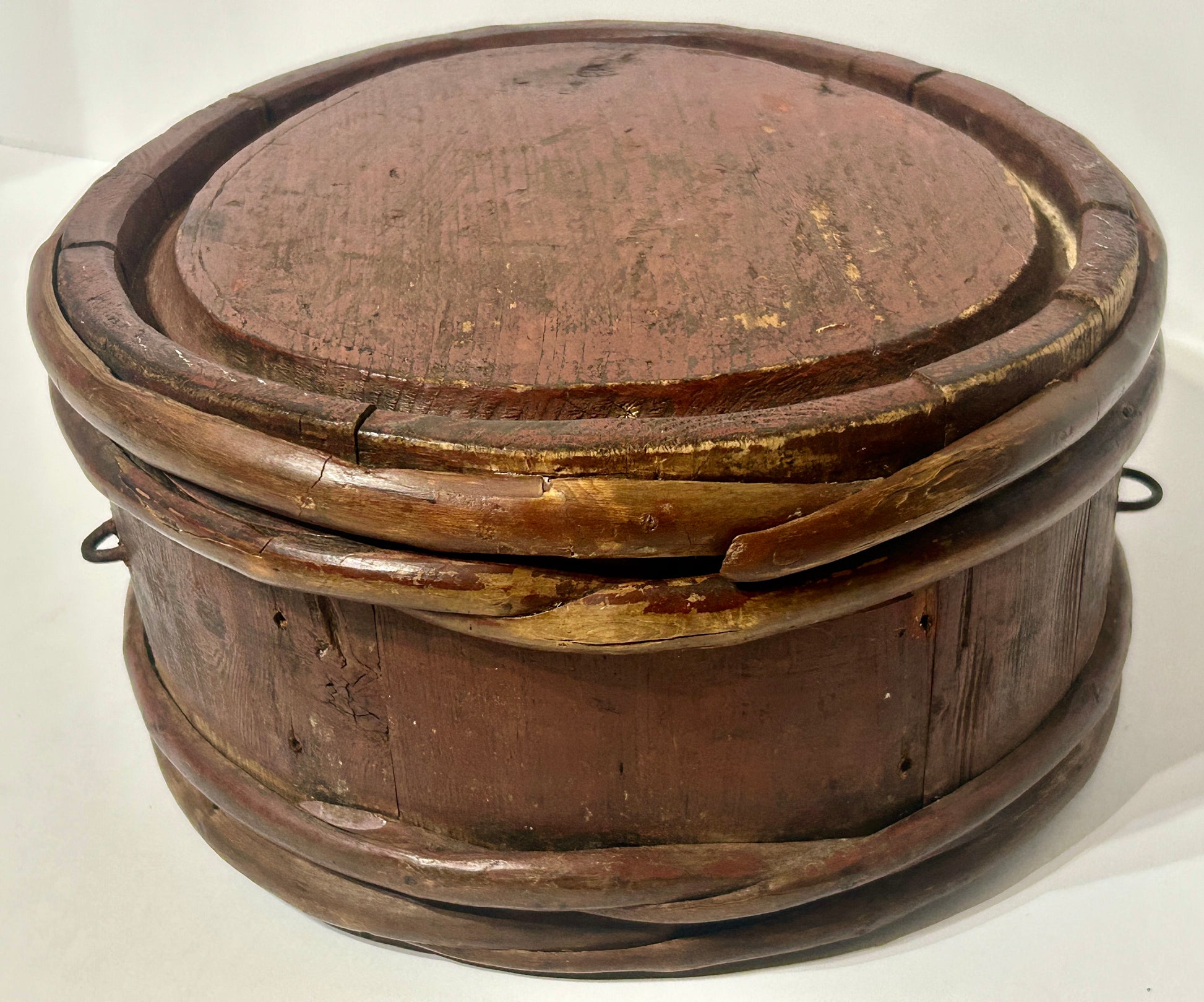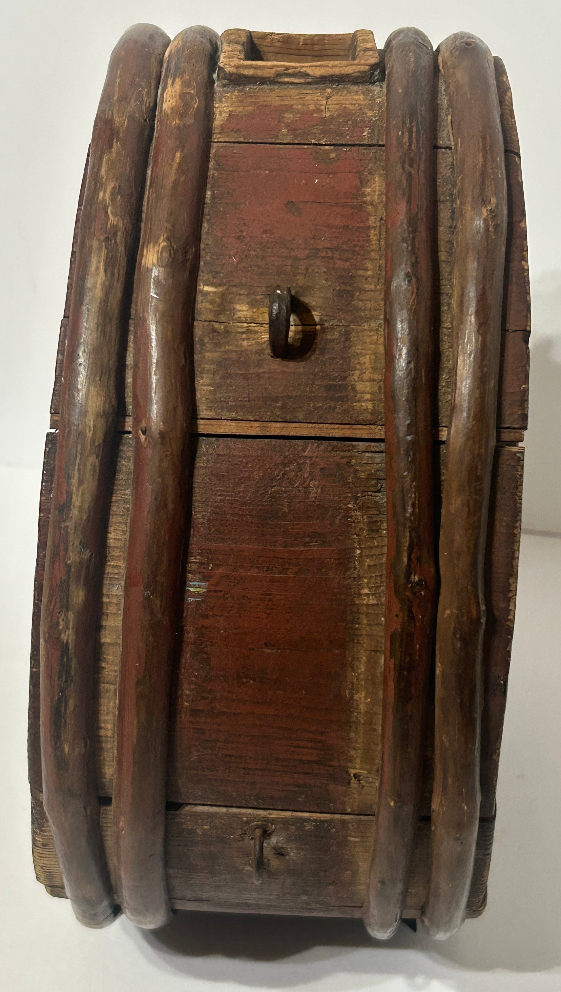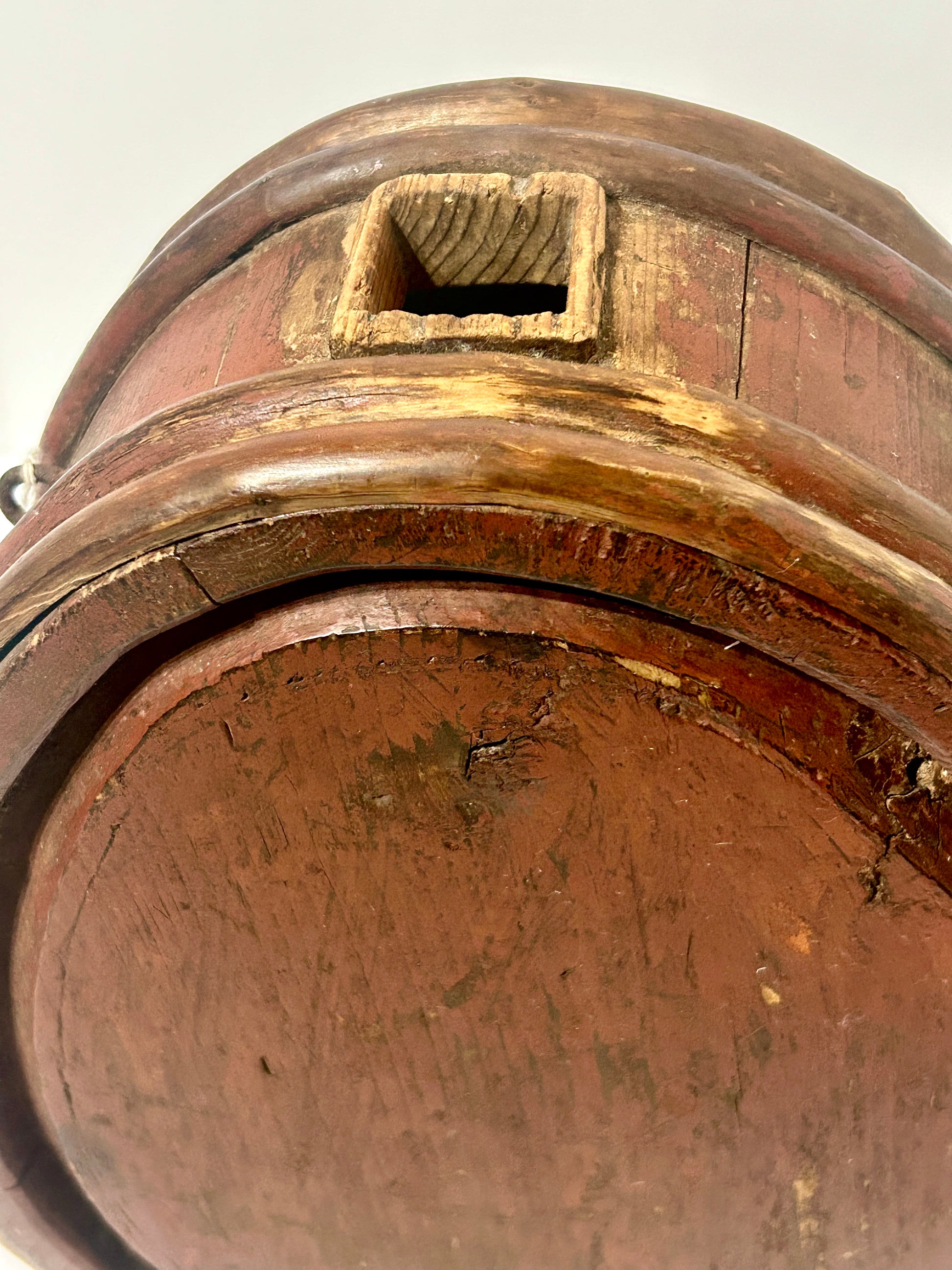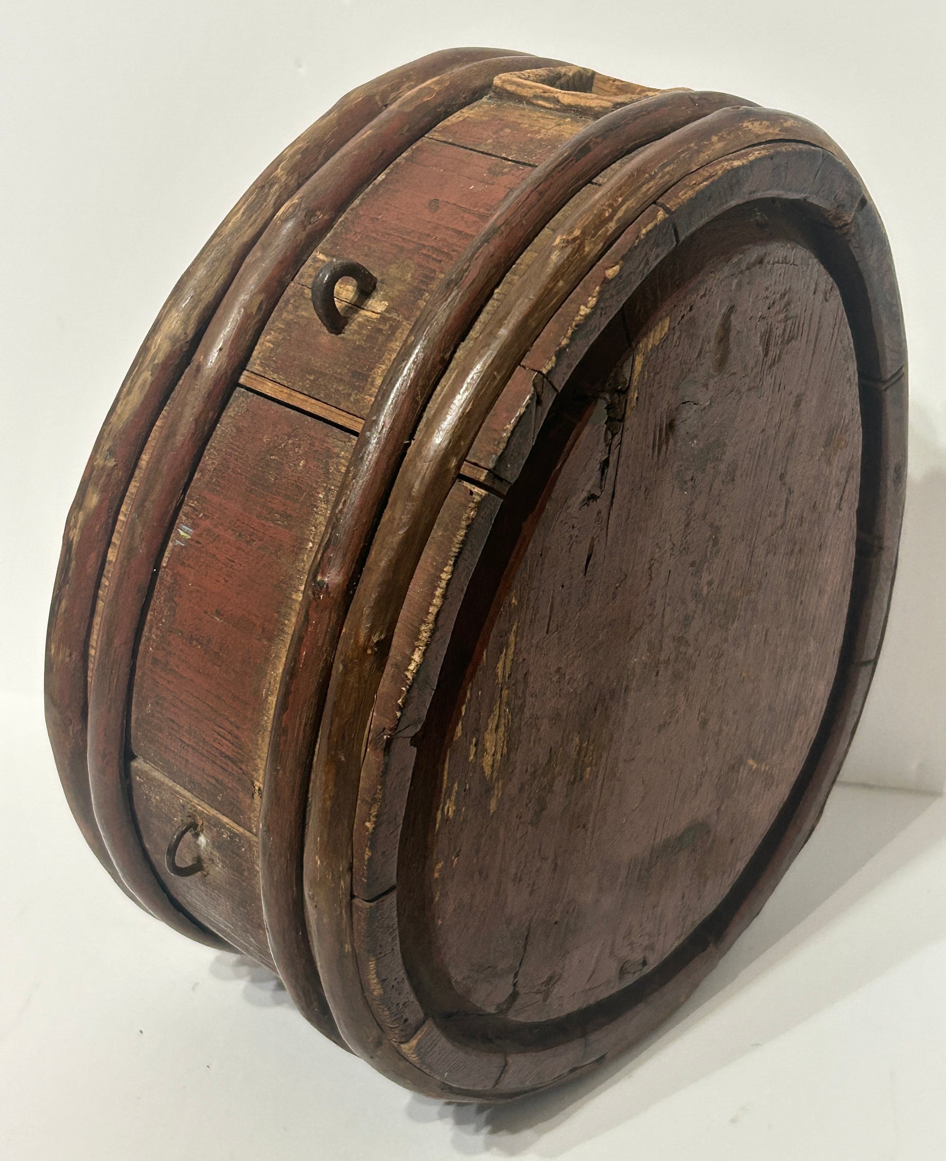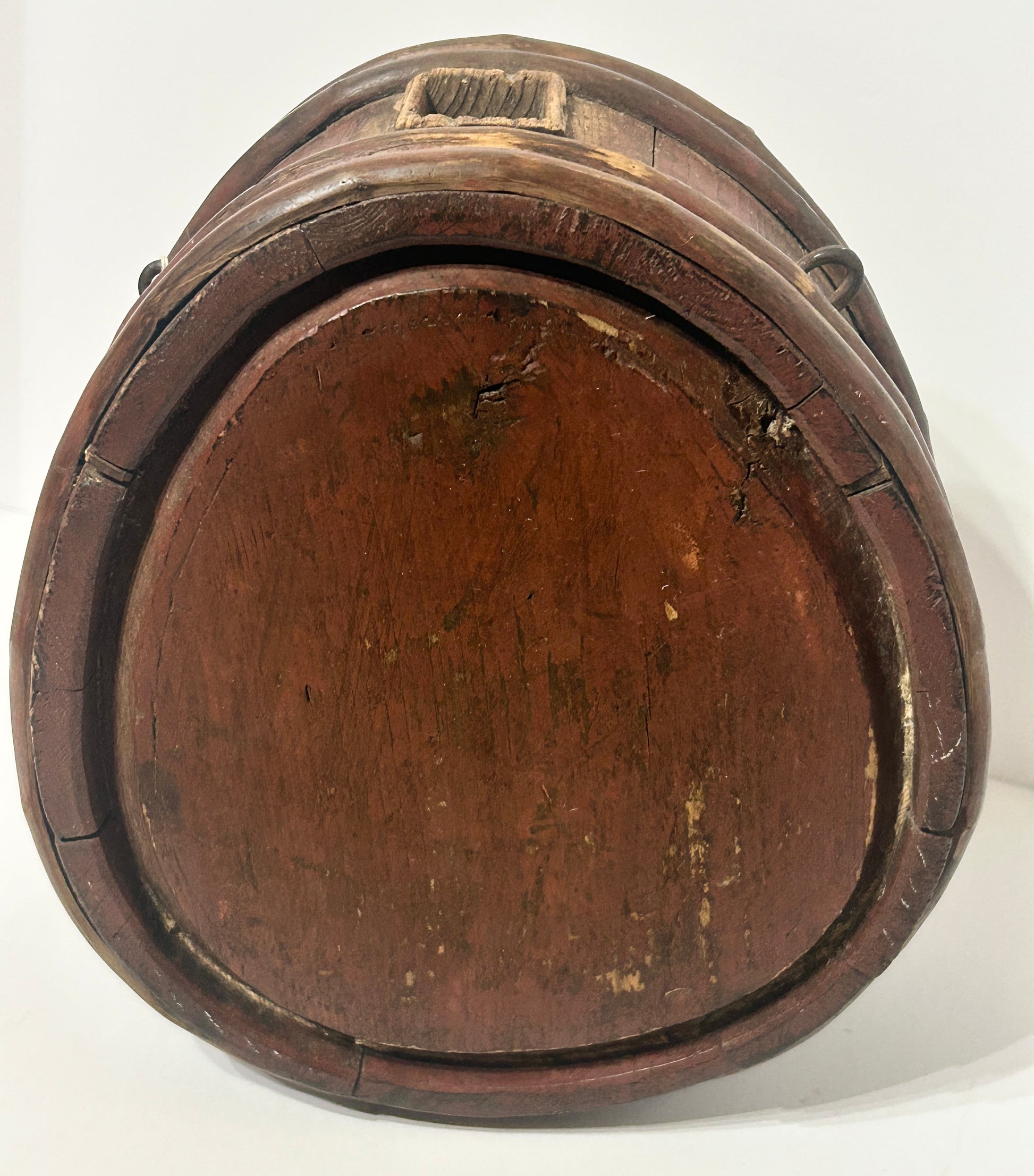 REDDISH BROWN PAINTED WOODEN POWDER KEG OR CANTEEN FROM REVOLUTIONARY WAR PERIOD 11" HIGH X 10" WIDE X 5" DEEP. CALL OR TEXT FOR MORE INFORMATION