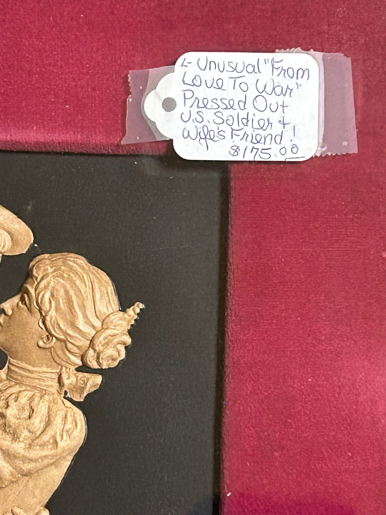 UNUSUAL ANTIQUE HEAVY PRESSED PAPER DESIGN OF U.S. SOLDIER AND WIFE OR GIRLFRIEND NICELY FRAMED AND MATTED ANTIQUE - 15" X 10 1/2" OVERALL. CALL OR TEXT FOR MORE INFORMATION