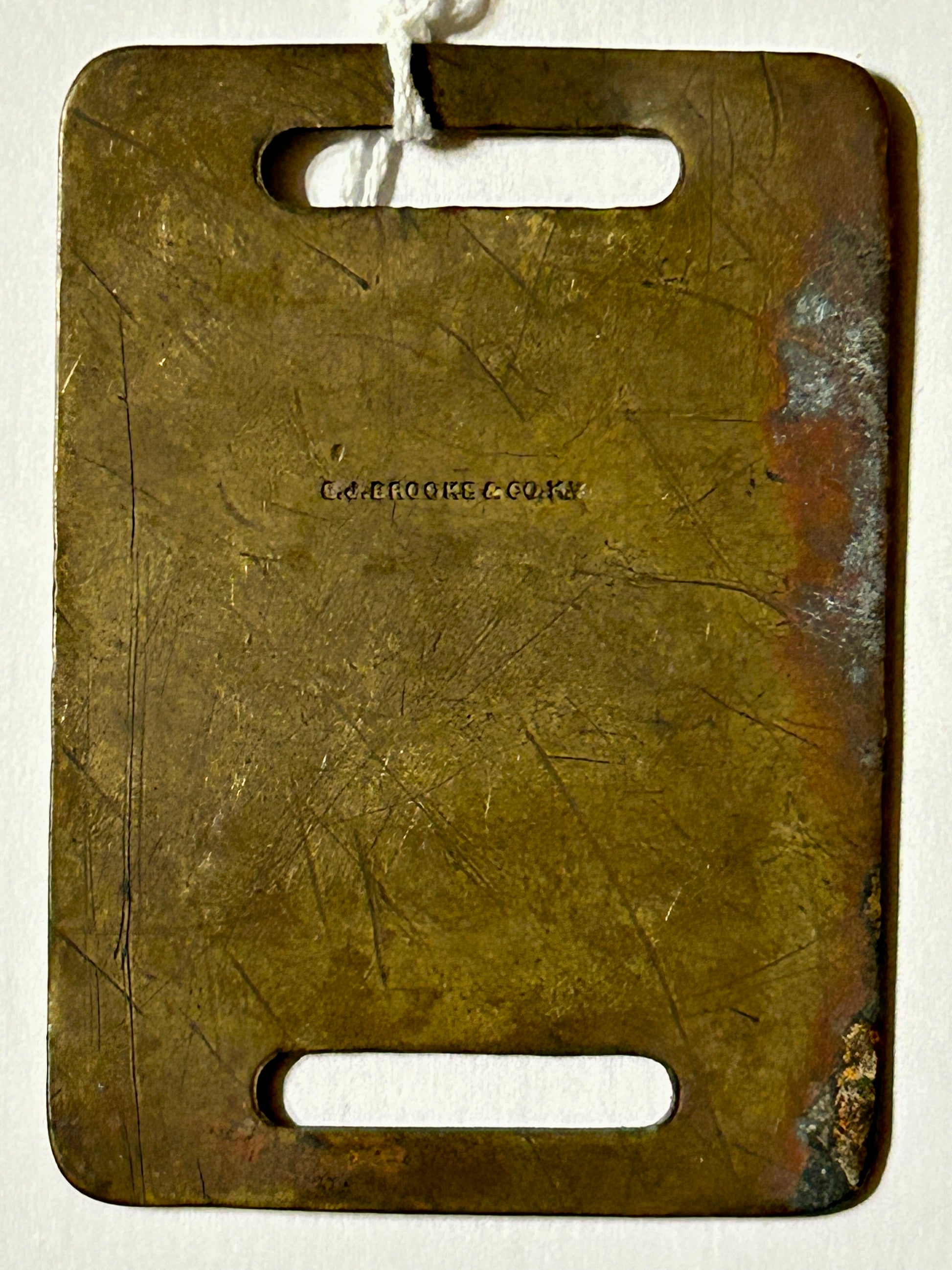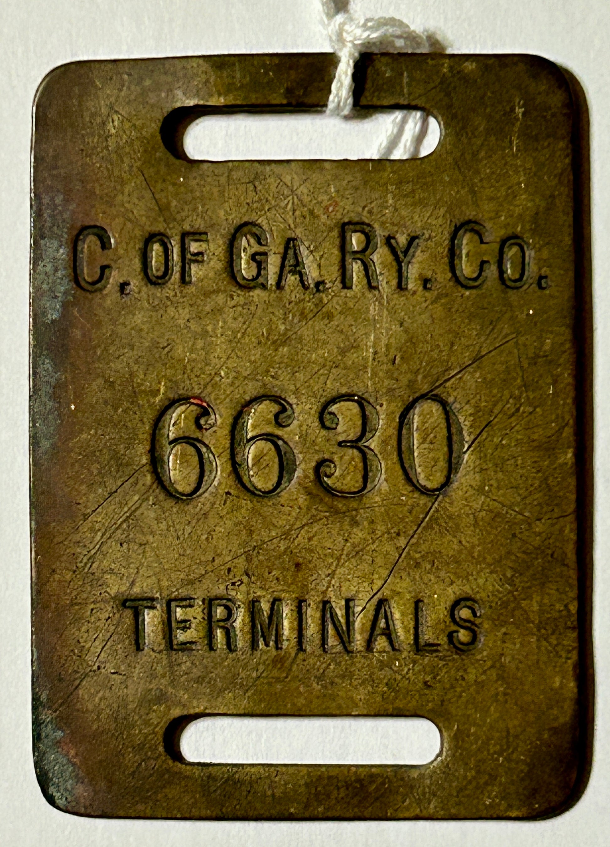 ANTIQUE BRASS LUGGAGE TAG FOR CENTRAL OF GEORGIA RAILROAD 3" X 2", HAVE SEVERAL ALL WITH DIFFERENT NUMBERS AND ALL OLD. PRICE IS EACH. CALL OR TEXT FOR MORE INFORMATION