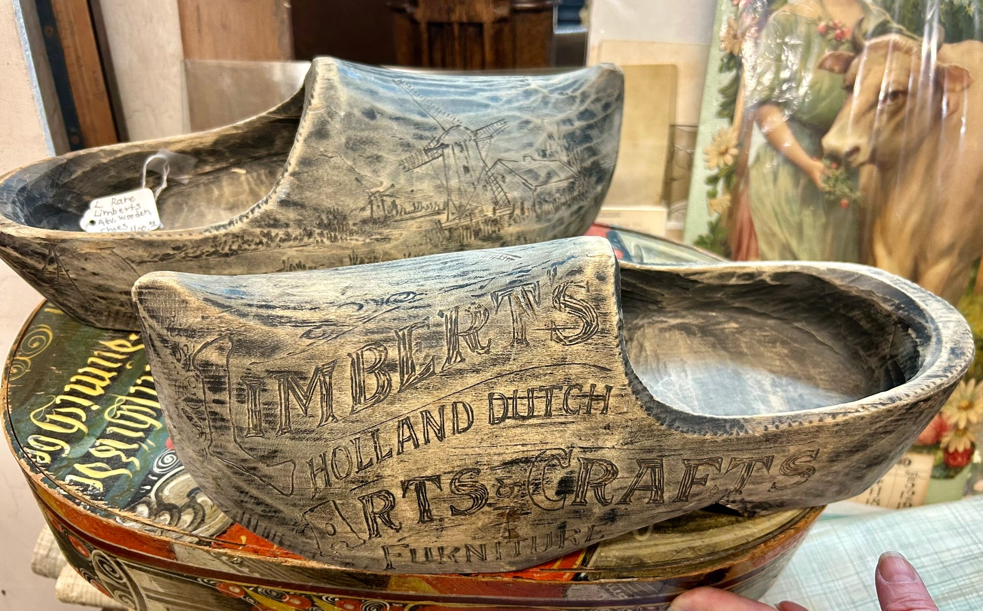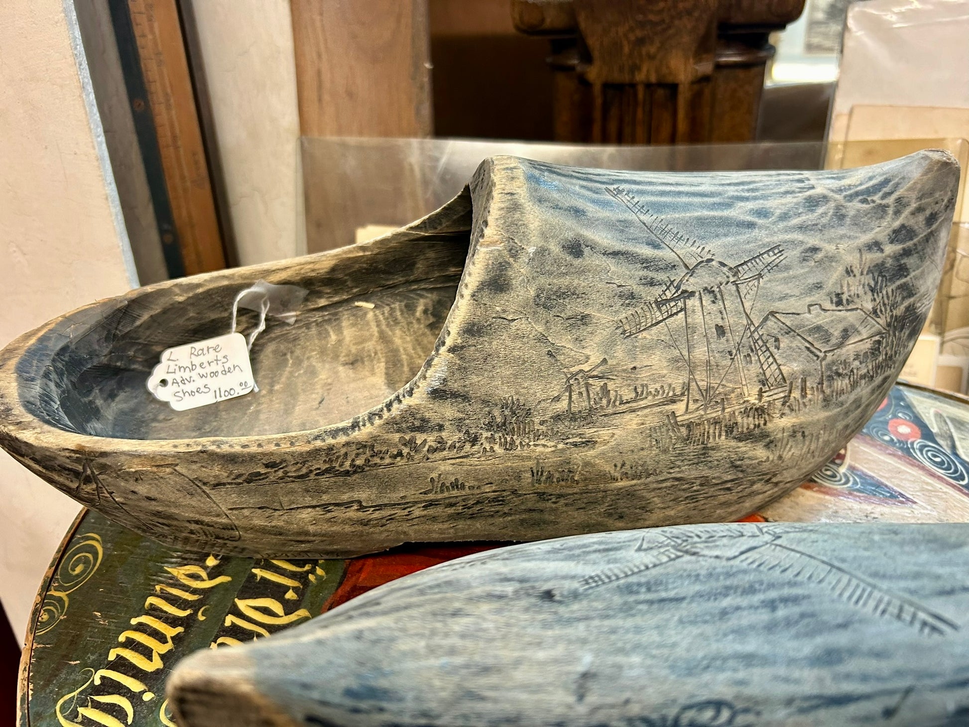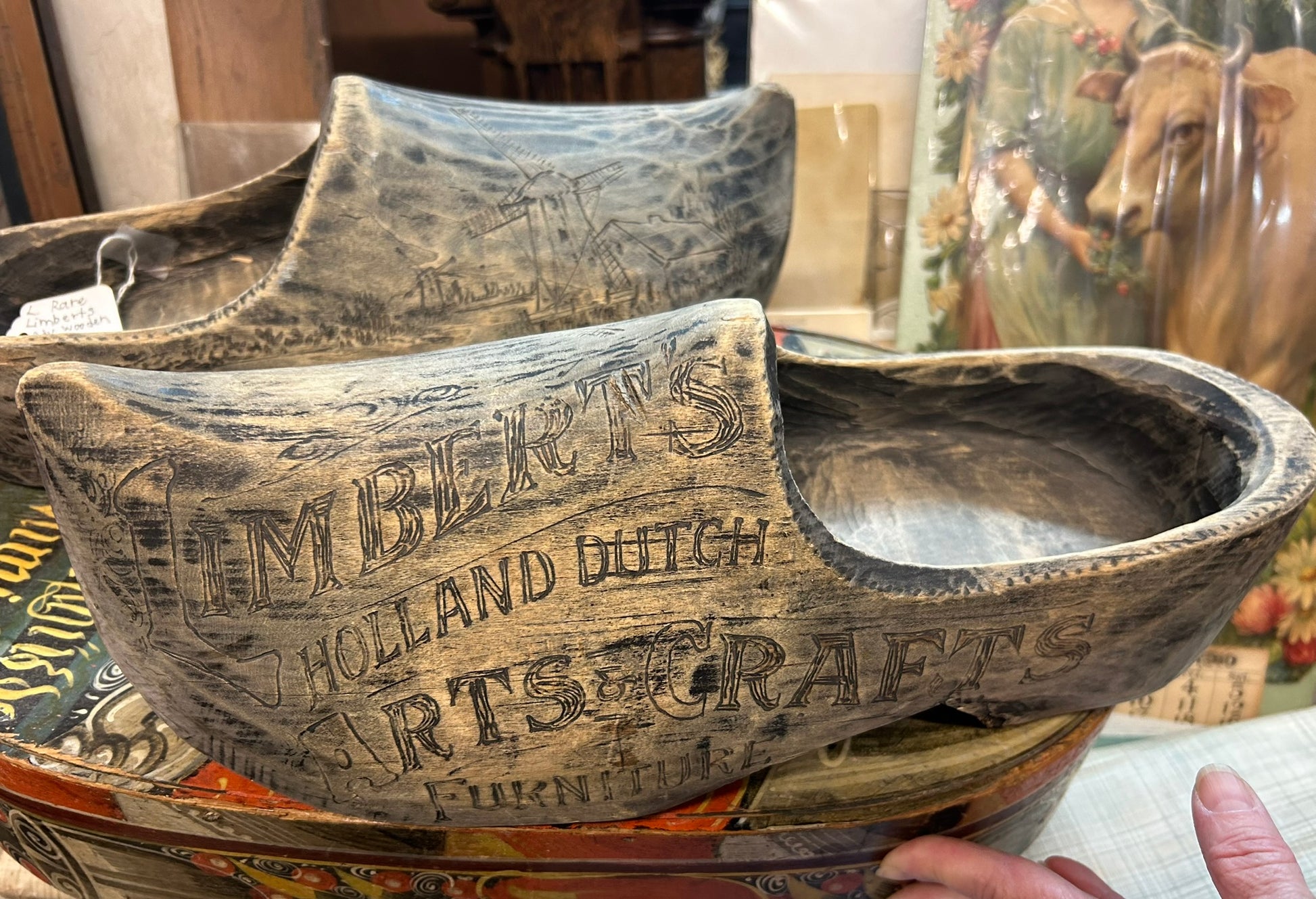 LIMBERT ARTS AND CRAFTS FURNITURE ADVERTISING LARGE WOODEN SHOES EACH 15" LONG. CALL, TEXT, OR E-MAIL FOR MORE INFORMATION