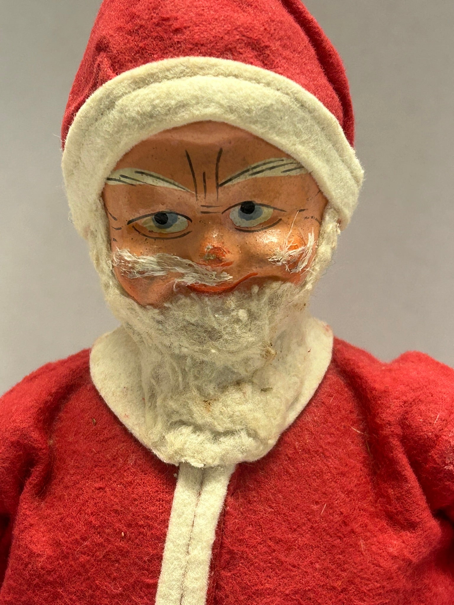 UNUSUAL ROLLY POLLY ANTIQUE SANTA WITH FELT CLOTHES AND NOISE CHIME 10 1/2" TALL. CALL OR TEXT FOR MORE INFORMATION