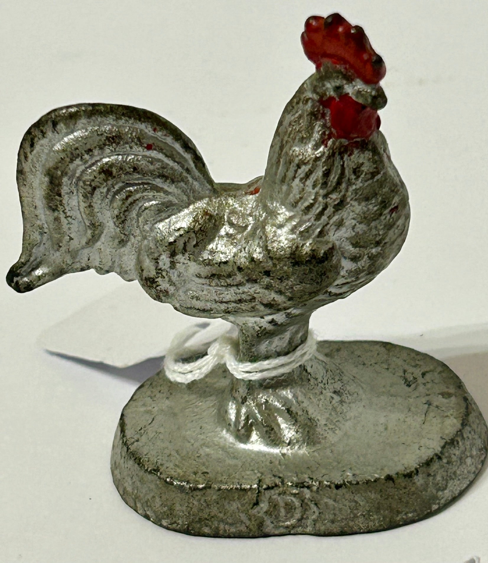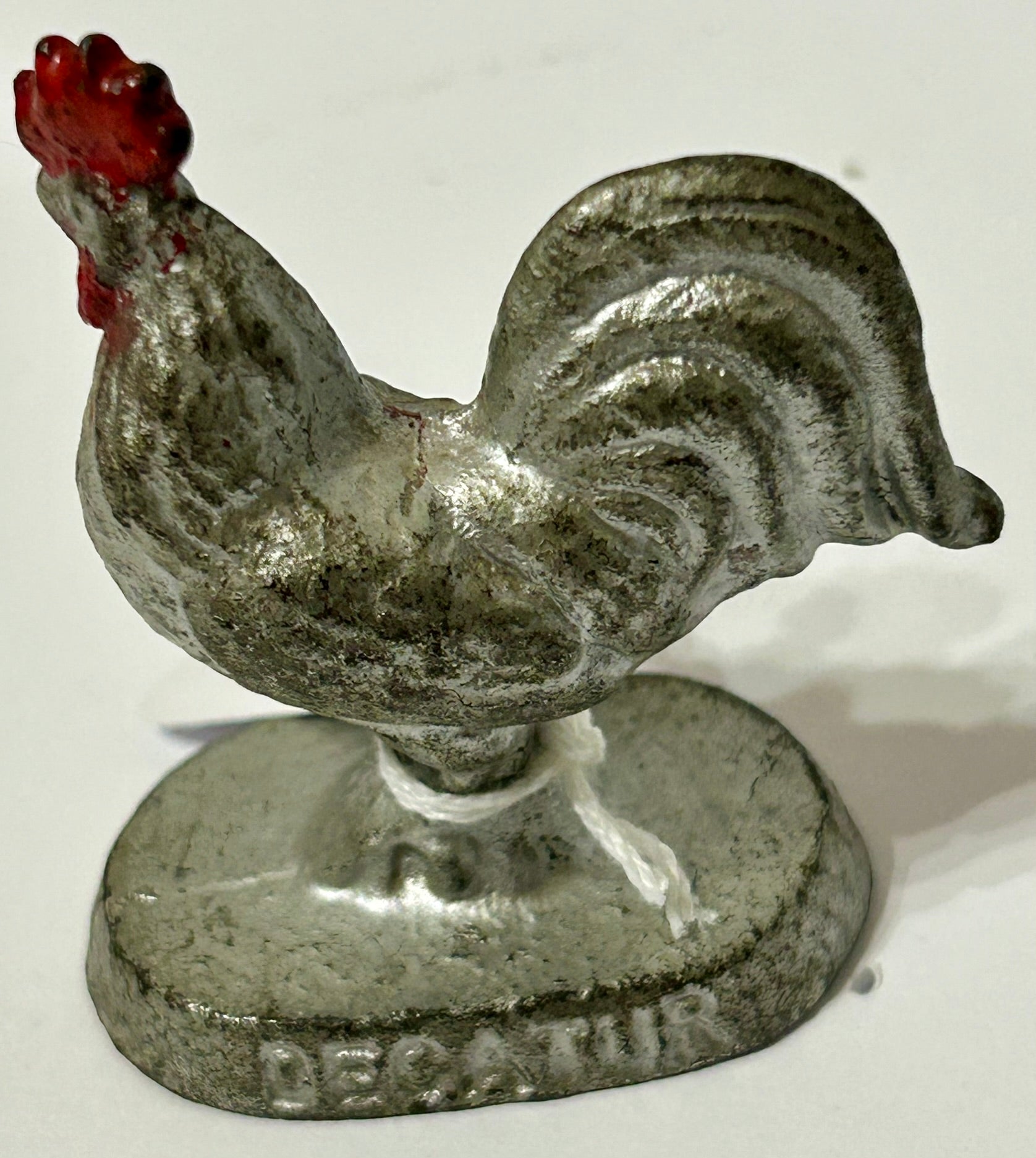 ANTIQUE CAST IRON ROOSTER ADVERTISING DECATUR ANTIQUE PAPERWEIGHT 2 1/4" HIGH. CALL OR TEXT FOR MORE INFORMATION