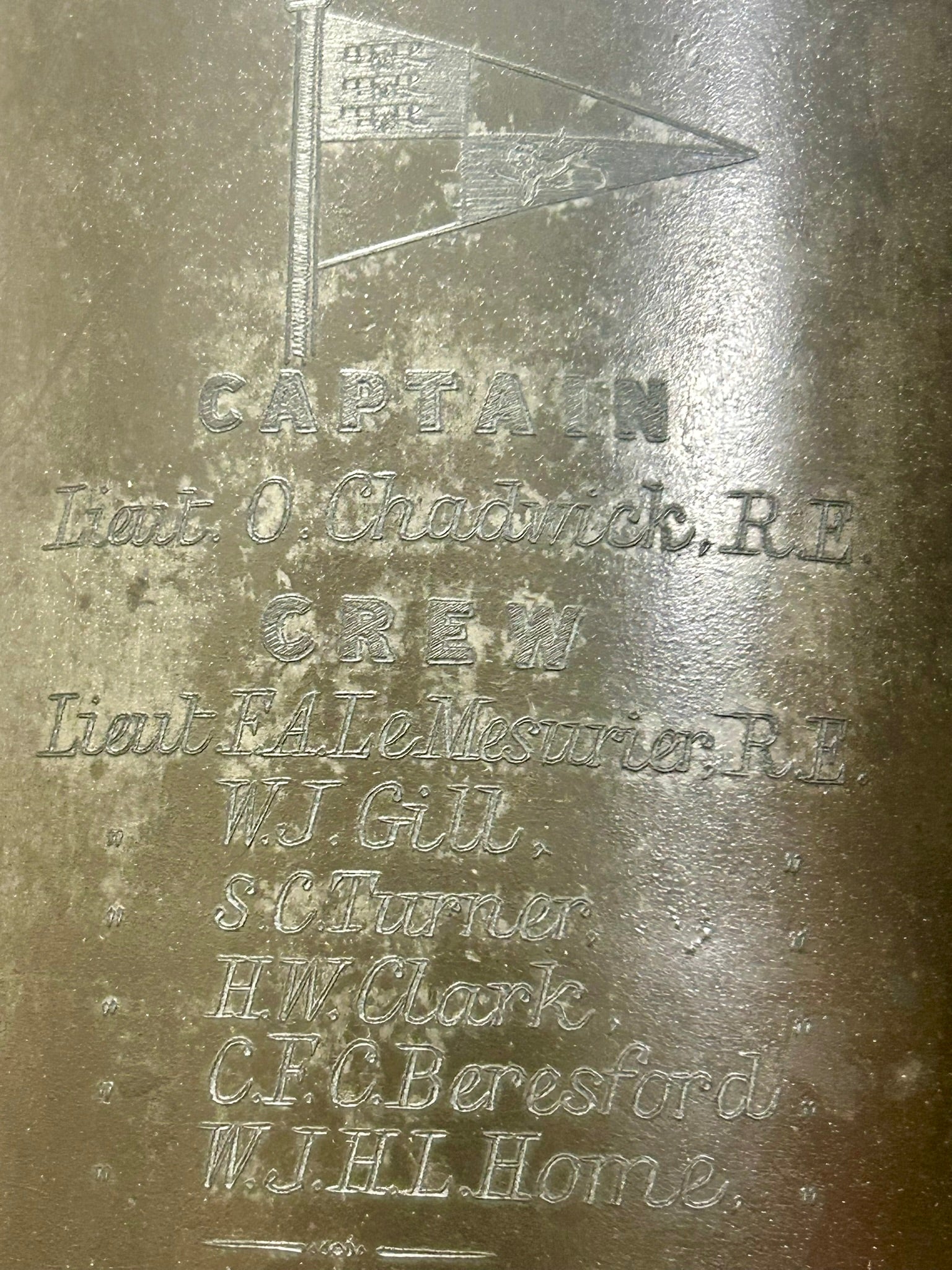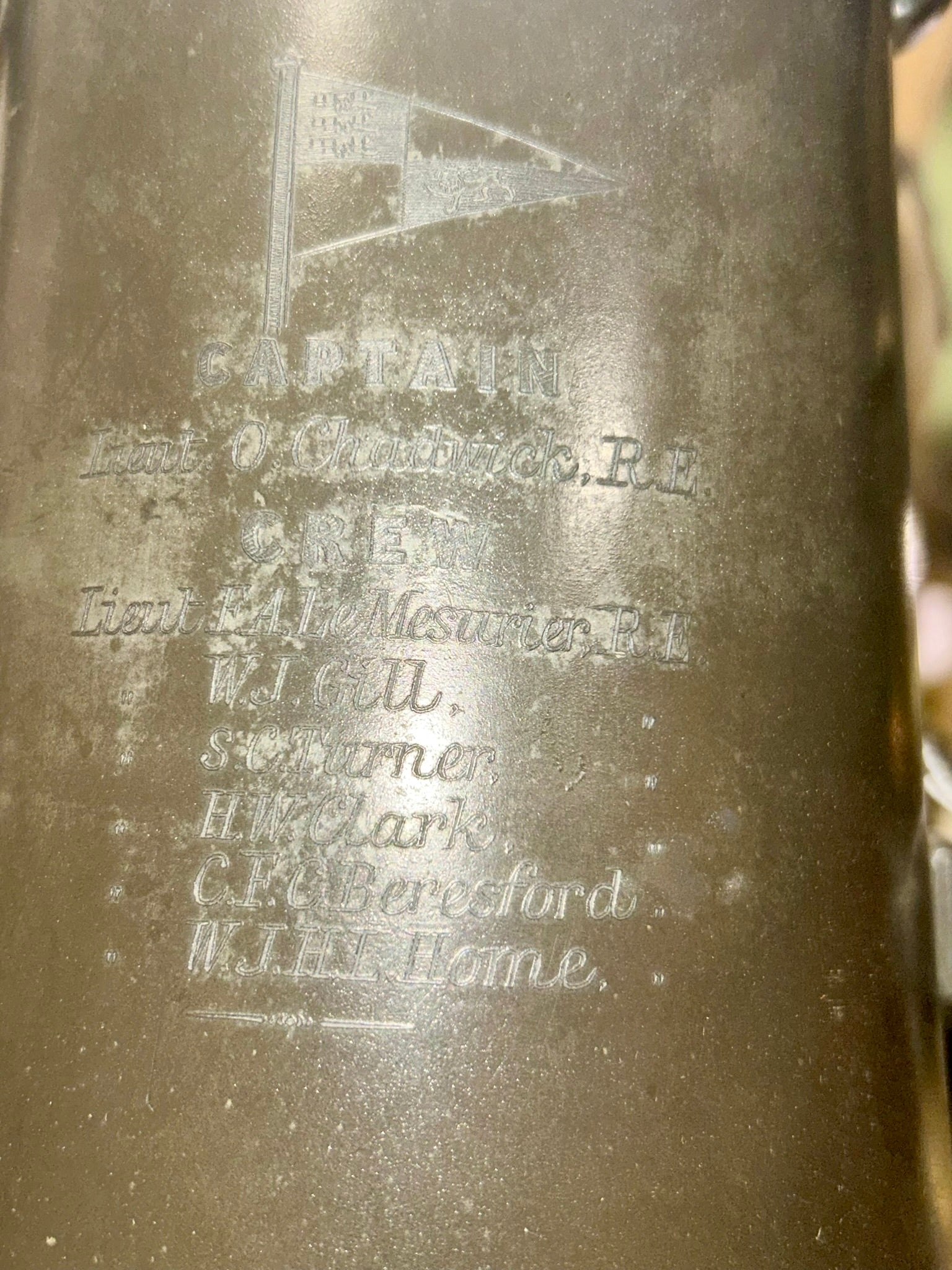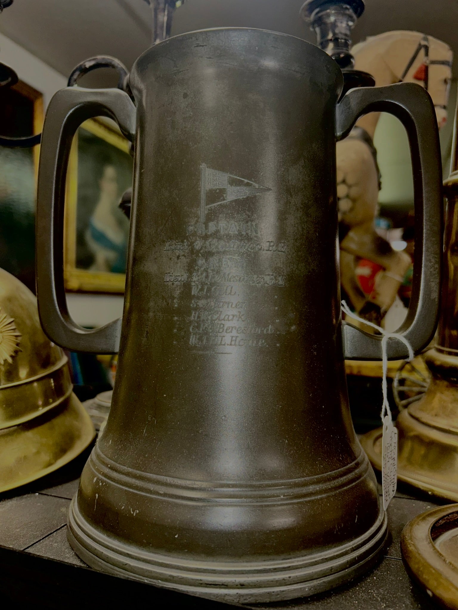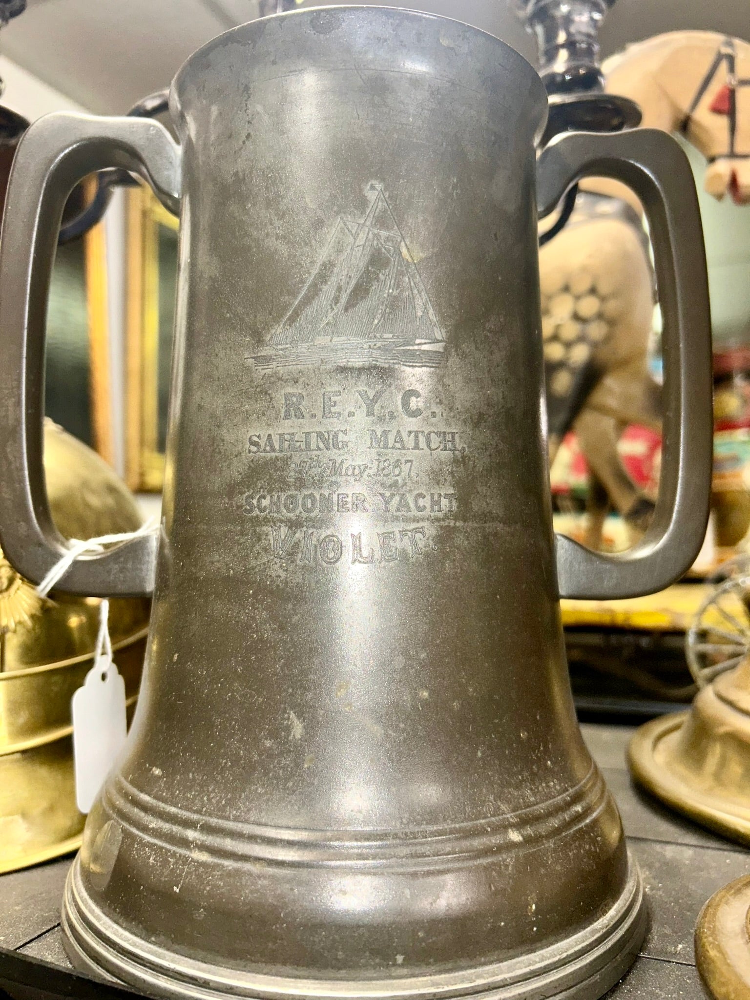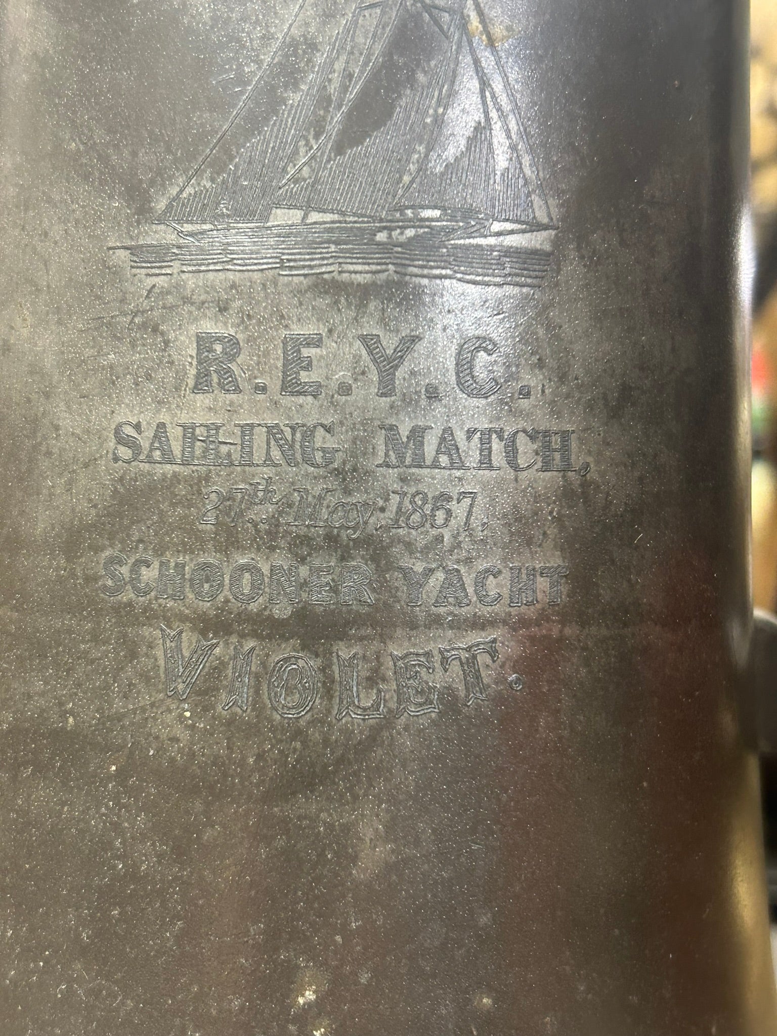 ROYAL ENGLISH YACHT CLUB PEWTER 1867 TROPHY FOR SCHOONER YACHT "VIOLET", LIST OF CREW ON ONE SIDE ALSO 9" TALL. CALL, TEXT, OR E-MAIL FOR MORE INFORMATION