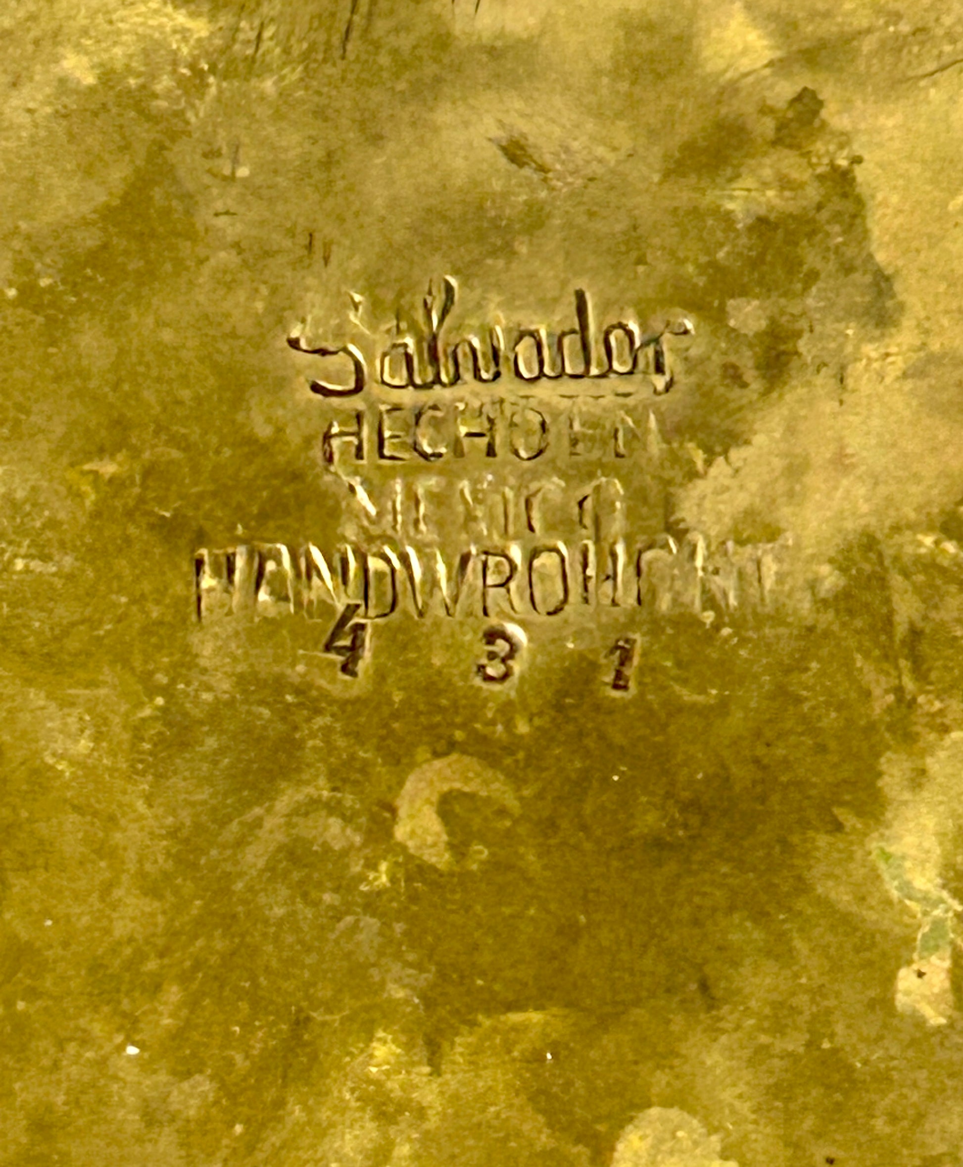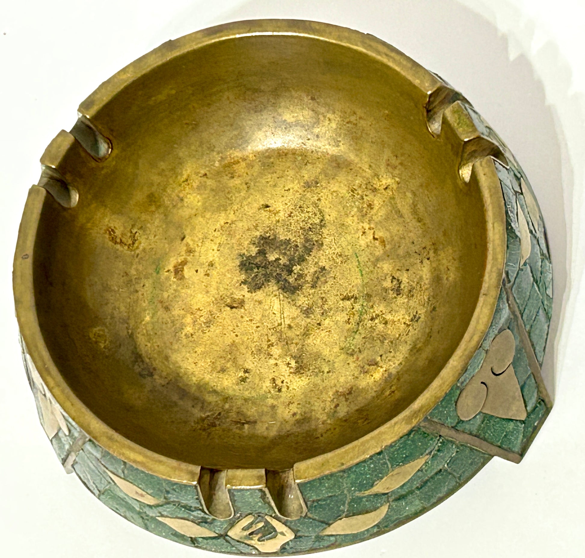 MEXICO HANDWROUGHT BRONZE ASHTRAY WITH GREEN INSET TILES MARKED SALVADOR HECHO EN 7" DIAMETER X 2 3/4" TALL. SHIPPING IS EXTRA SO BE SURE TO CALL OR TEXT TO FIND SHIPPING COST TO YOUR AREA