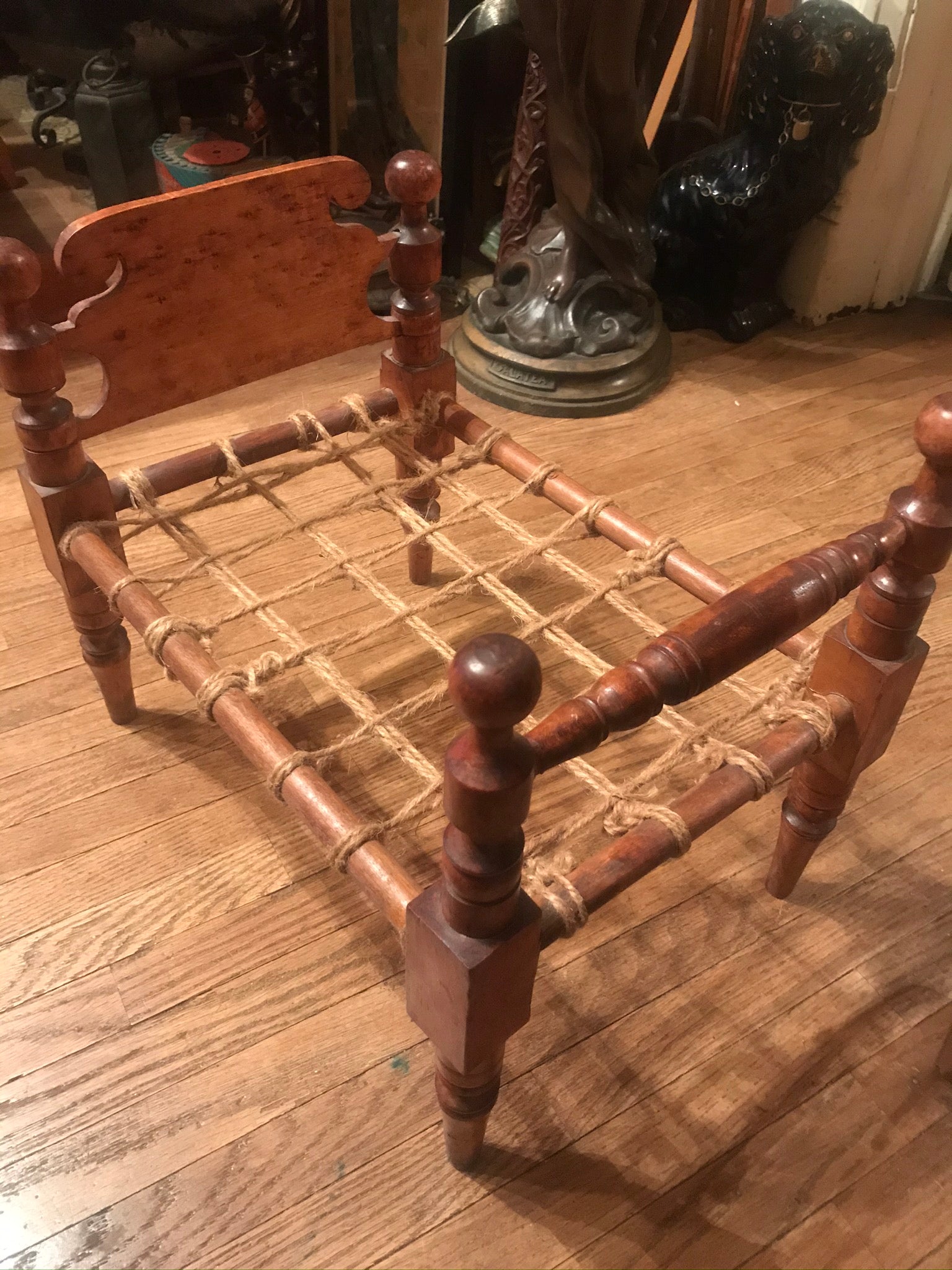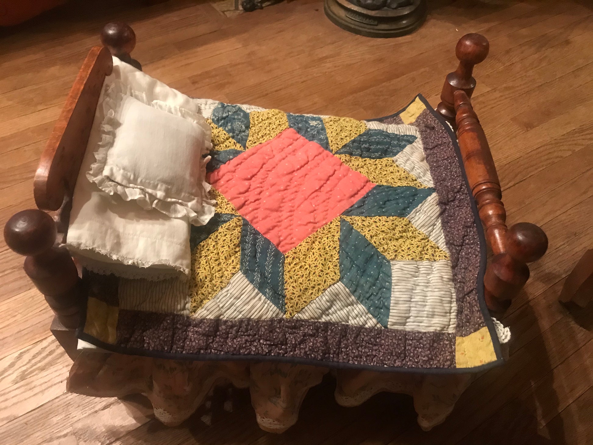 SAMPLE ANTIQUE MID 1800's BED COMPLETE WITH MATTRESS AND COVERINGS. 14" LONG A BEAUTIFUL PIECE. CALL OR TEXT FOR MORE INFORMATION
