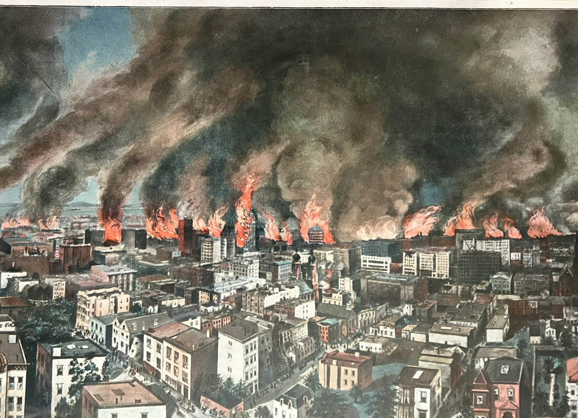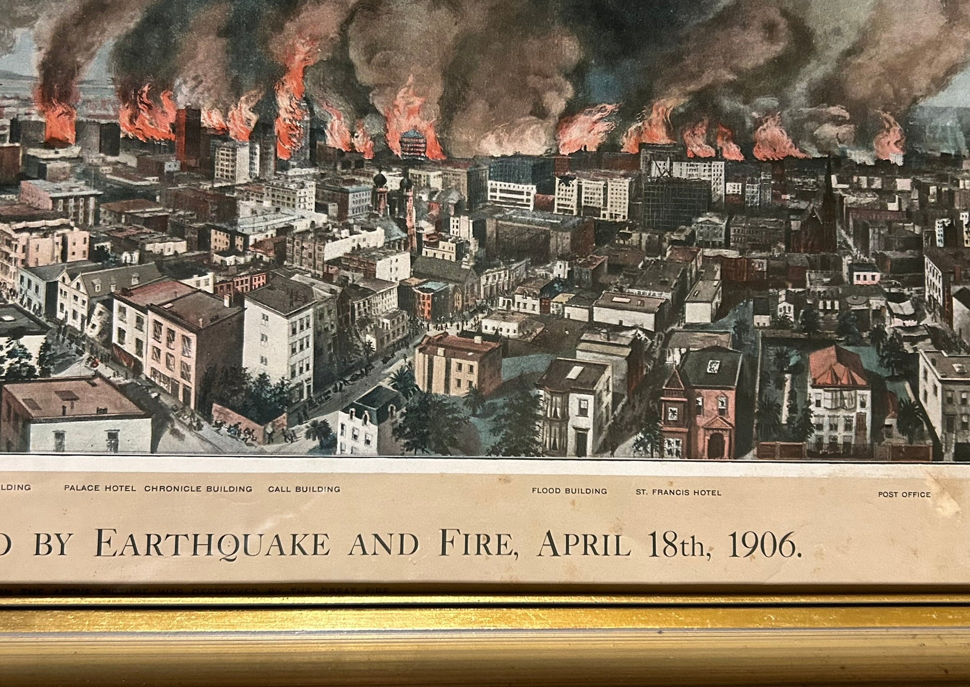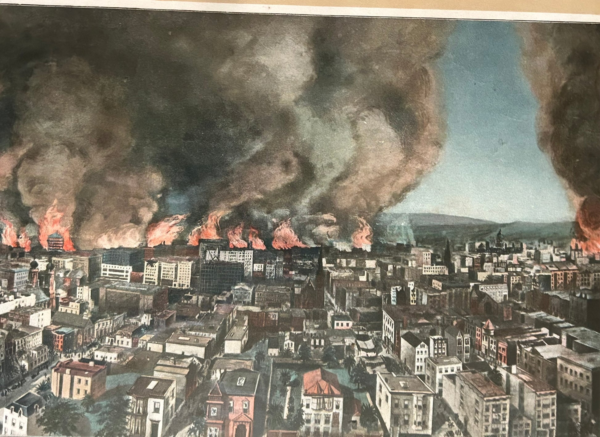 DESTRUCTION OF SAN FRANCISCO BY EARTHQUAKE AND FIRE 1906 PRINT BY LOUIS ROESCH CO. SAN FRANCISCO, 16 1/2" X 41". CALL OR TEXT FOR MORE INFORMATION