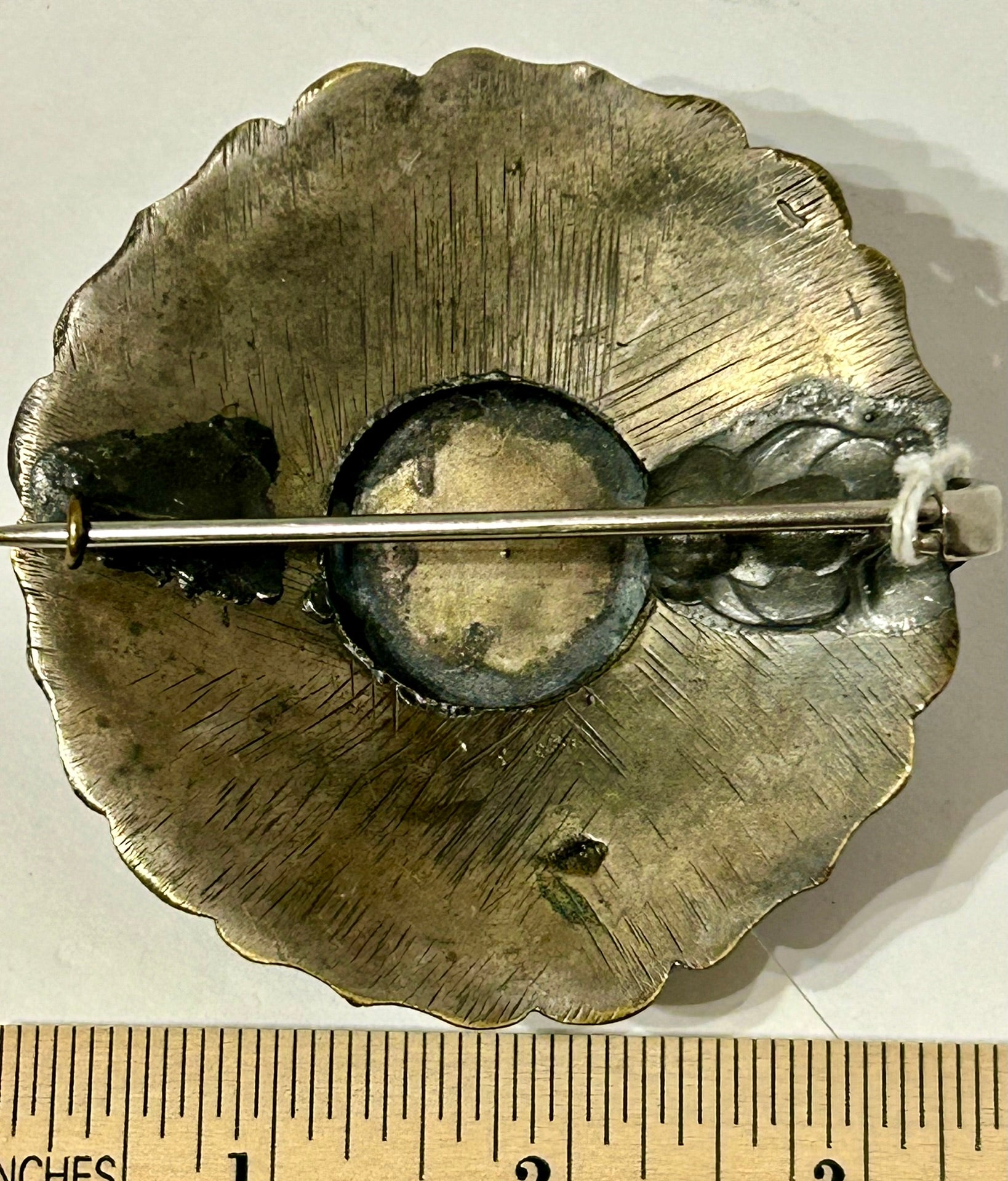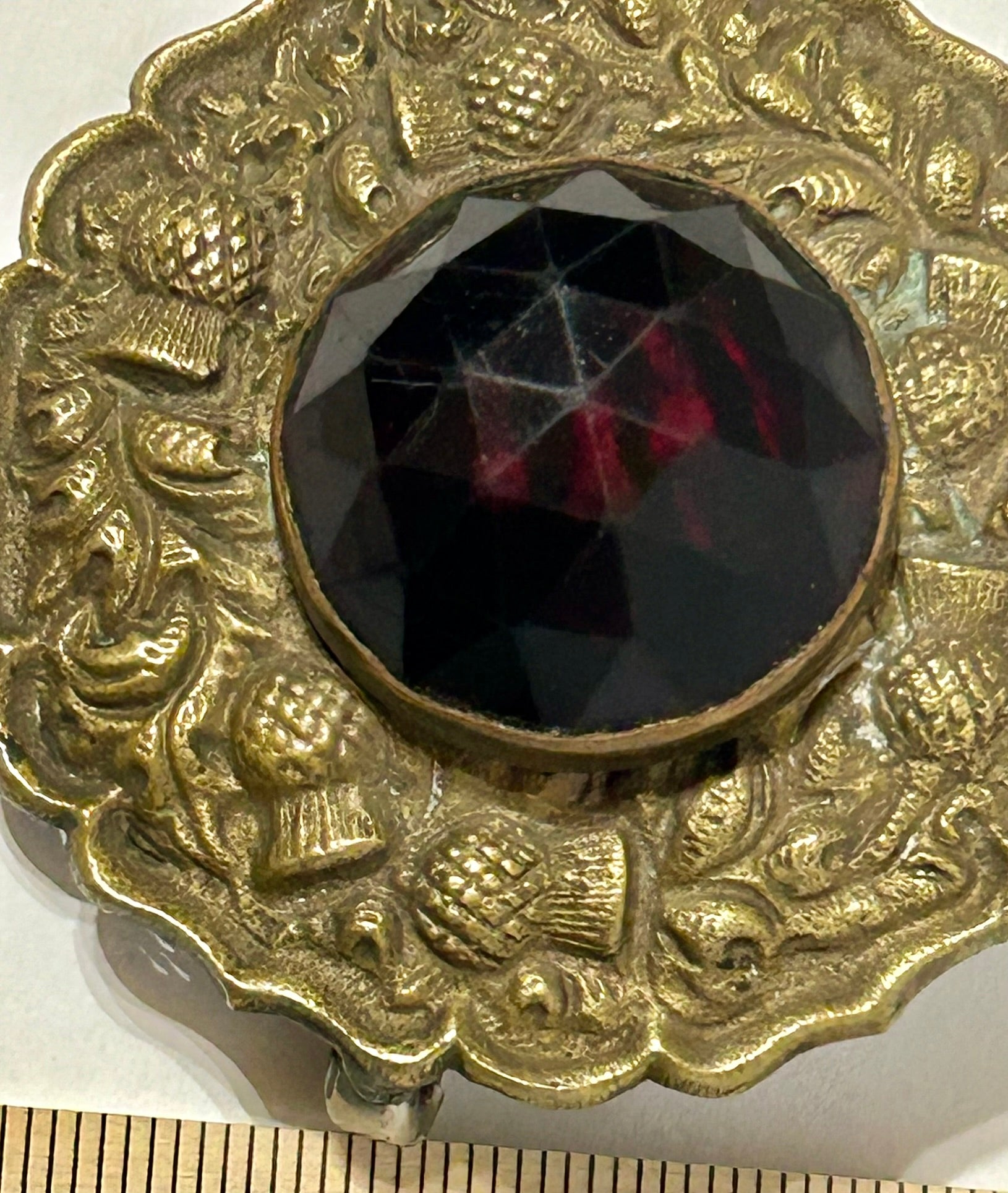 ANTIQUE LARGE SCOTTISH KILT PIN WITH DARK RED GLASS STONE 3 1/2" DIAMETER. CALL OR TEXT FOR MORE INFORMATION