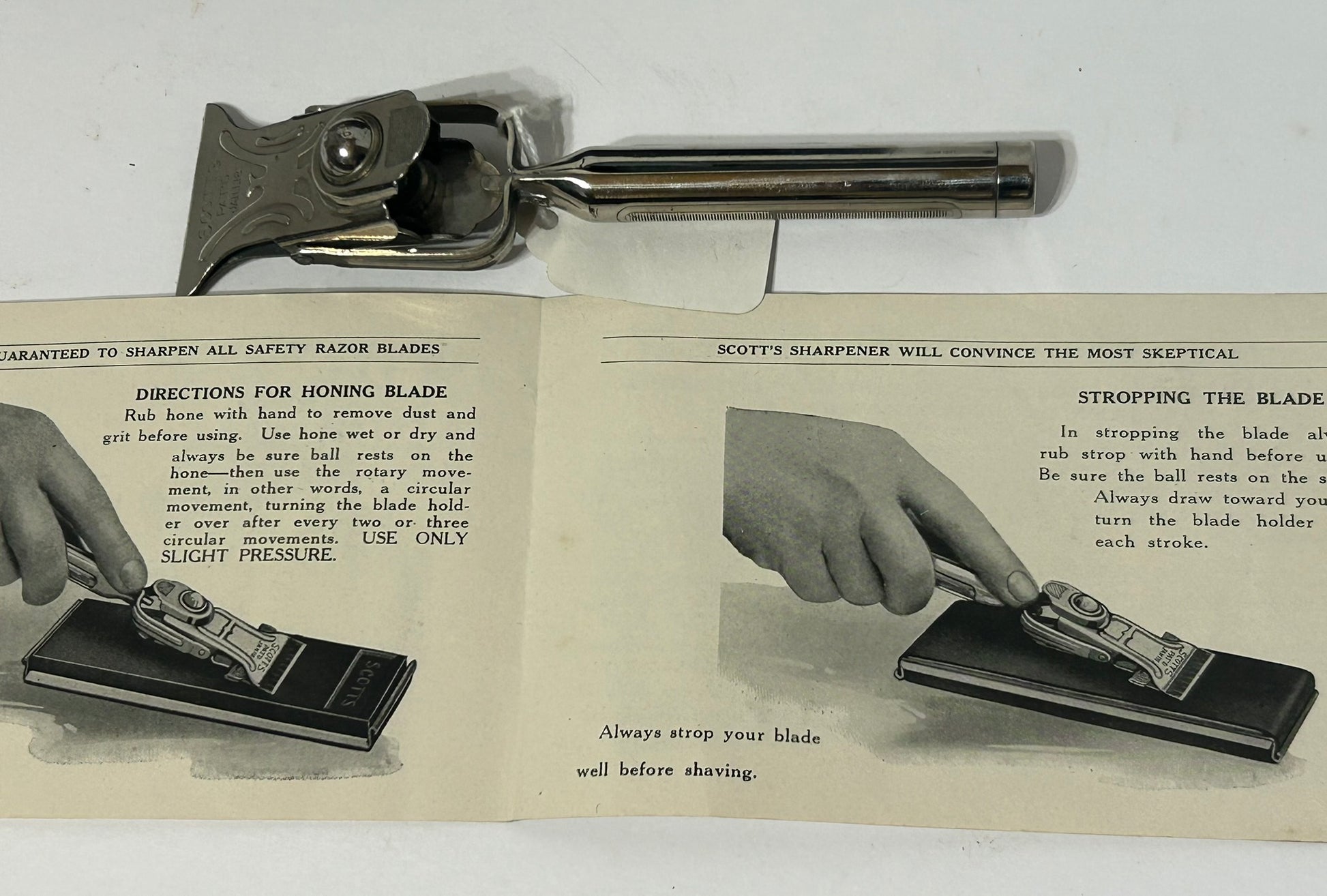 SCOTTS BALL BEARING RAZOR BLADE SHARPENER WITH ORIGINAL BOX AND SHARPENING STONE AND INSTRUCTIONS 6" LONG