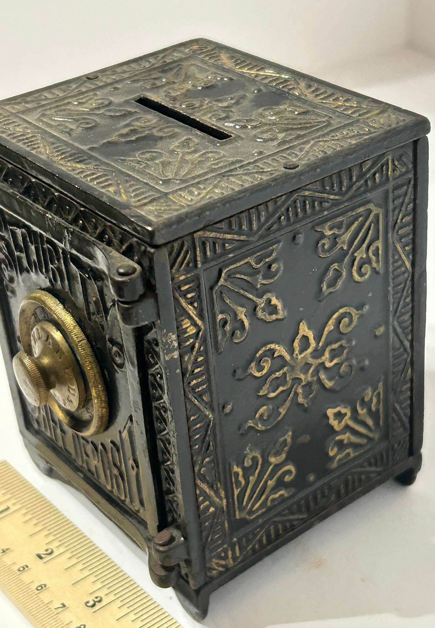 SECURITY SAFE DEPOSIT ANTIQUE BANK IN NEAR MINT CONDITION 5" TALL. CALL OR TEXT FOR MORE INFORMATION