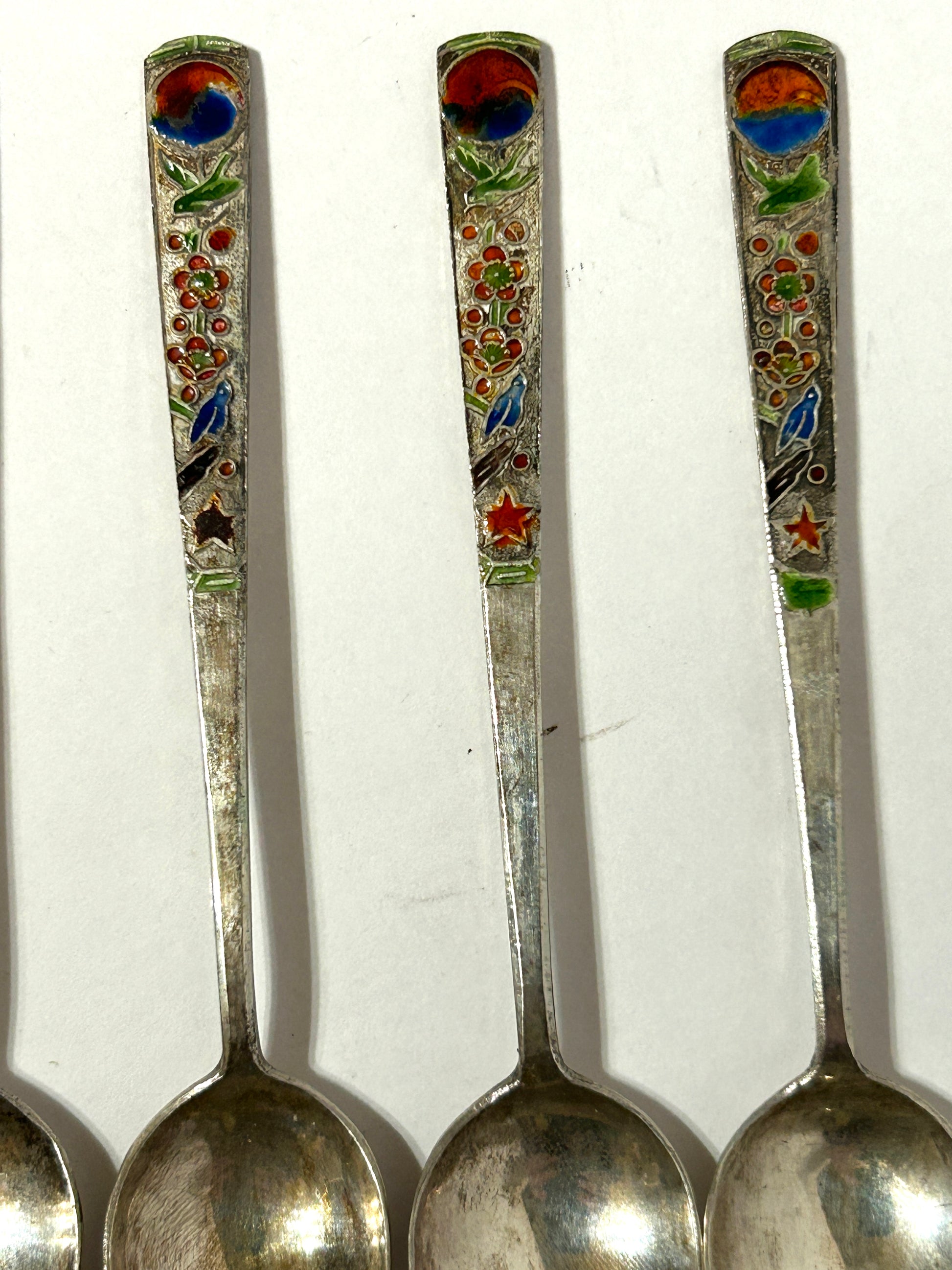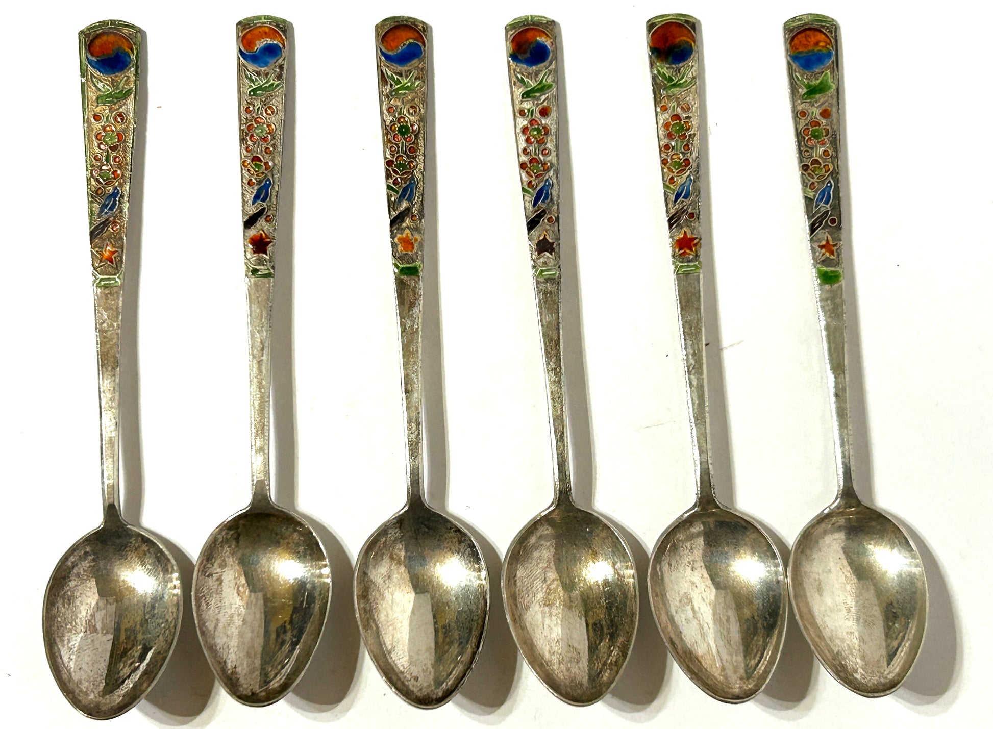 SET OF SIX ENAMELED ORIENTAL SILVER SPOONS EACH SPOON 4 3/4" LONG. SHIPPING IS EXTRA SO CALL OR TEXT TO FIND OUT HOW MUCH SHIPPING WILL COST