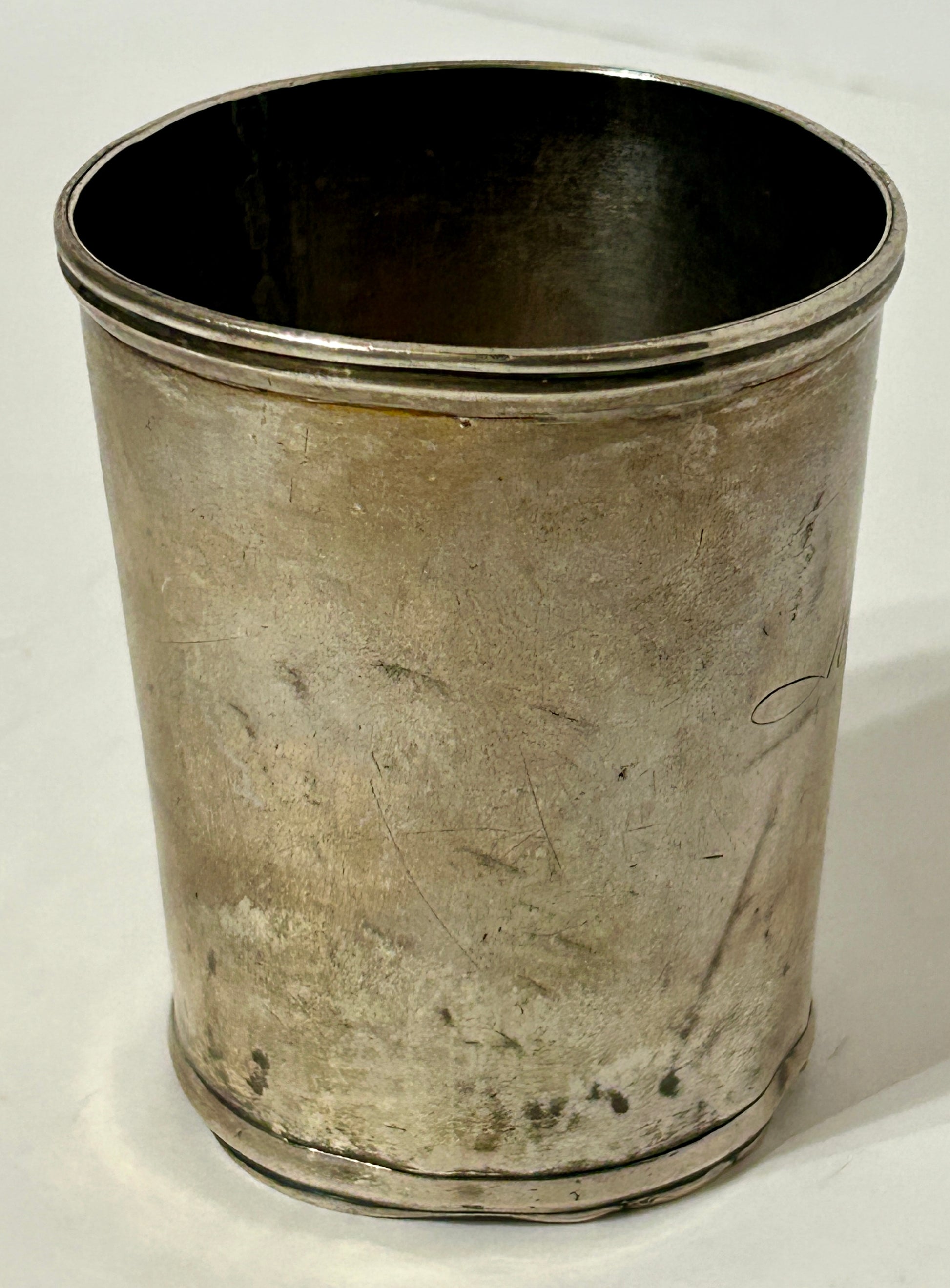 SILVER CUP BY THEODORE DUBOSQ,, PHILADELPHIA, PENNSYLVANIA 1829-1850 3 1/2" TALL X 2 1/2" DIA., 120.2 GRAMS, SOME BLEMISHES AND SMALL DENTS. SHIPPING IS EXTRA SO CALL OR TEXT TO FIND OUT HOW MUCH SHIPPING WILL COST