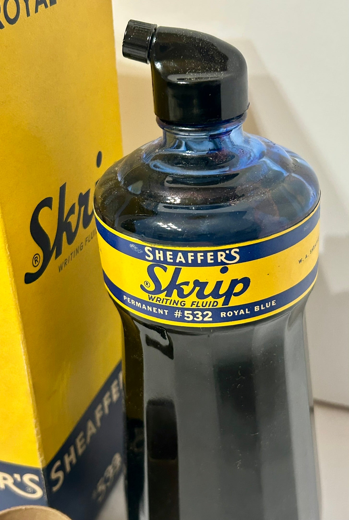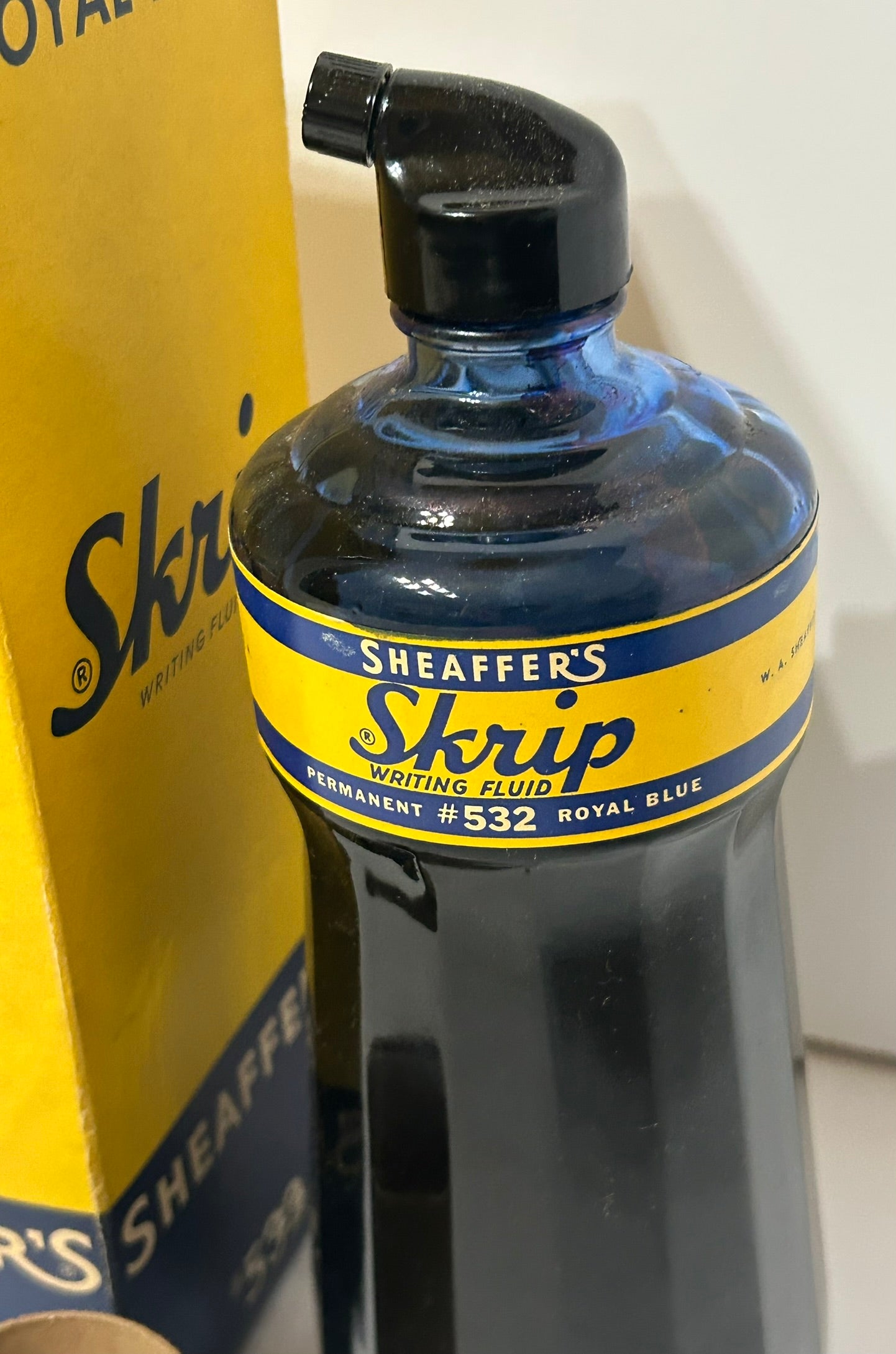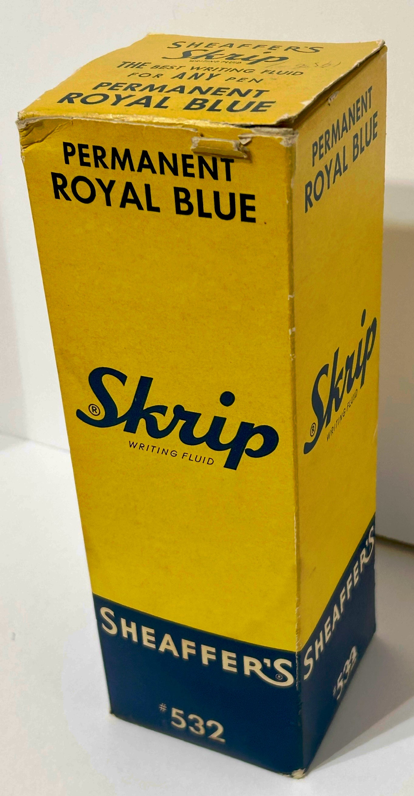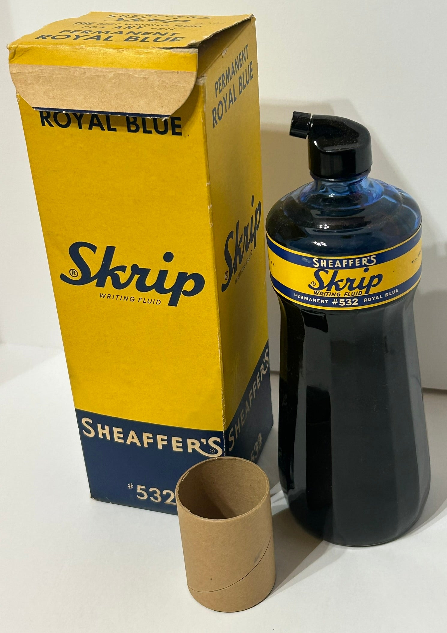 SKRIP BLUE PERMANENT 32 OZ. INK FULL GLASS BOTTLE WITH ORIGINAL BOTTLE - BOX IS 10 1/2" TALL. CALL OR TEXT FOR MORE INFORMATION