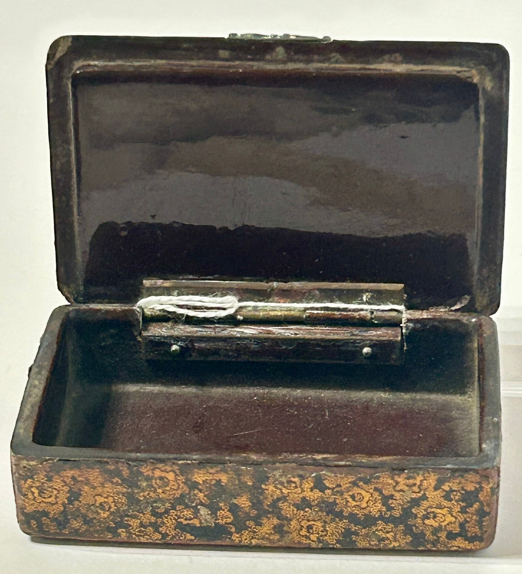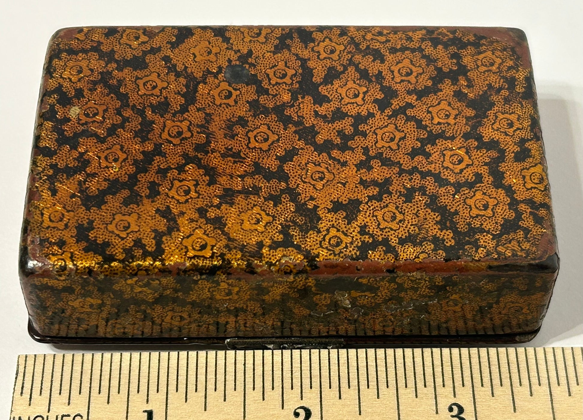 LATE 1700'S GILT AND BLACK PAPER MACHE SNUFF BOX. CALL OR TEXT FOR MORE INFORMATION