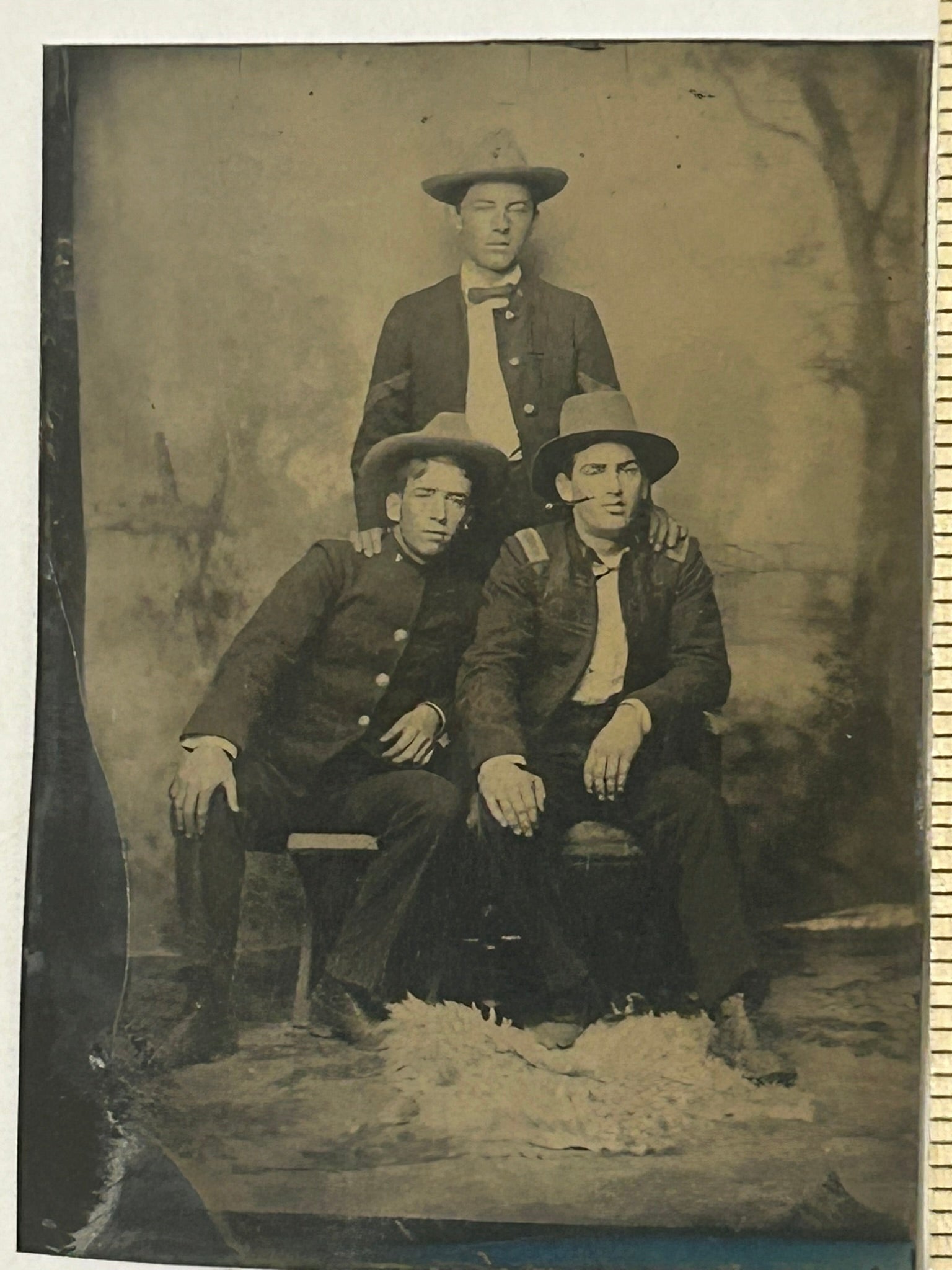TINTYPE PHOTO OF THREE 1800'S SOLDIERS STUDIO POSED 3 1/2" x 2 1/2". CALL OR TEXT FOR MORE INFORMATION