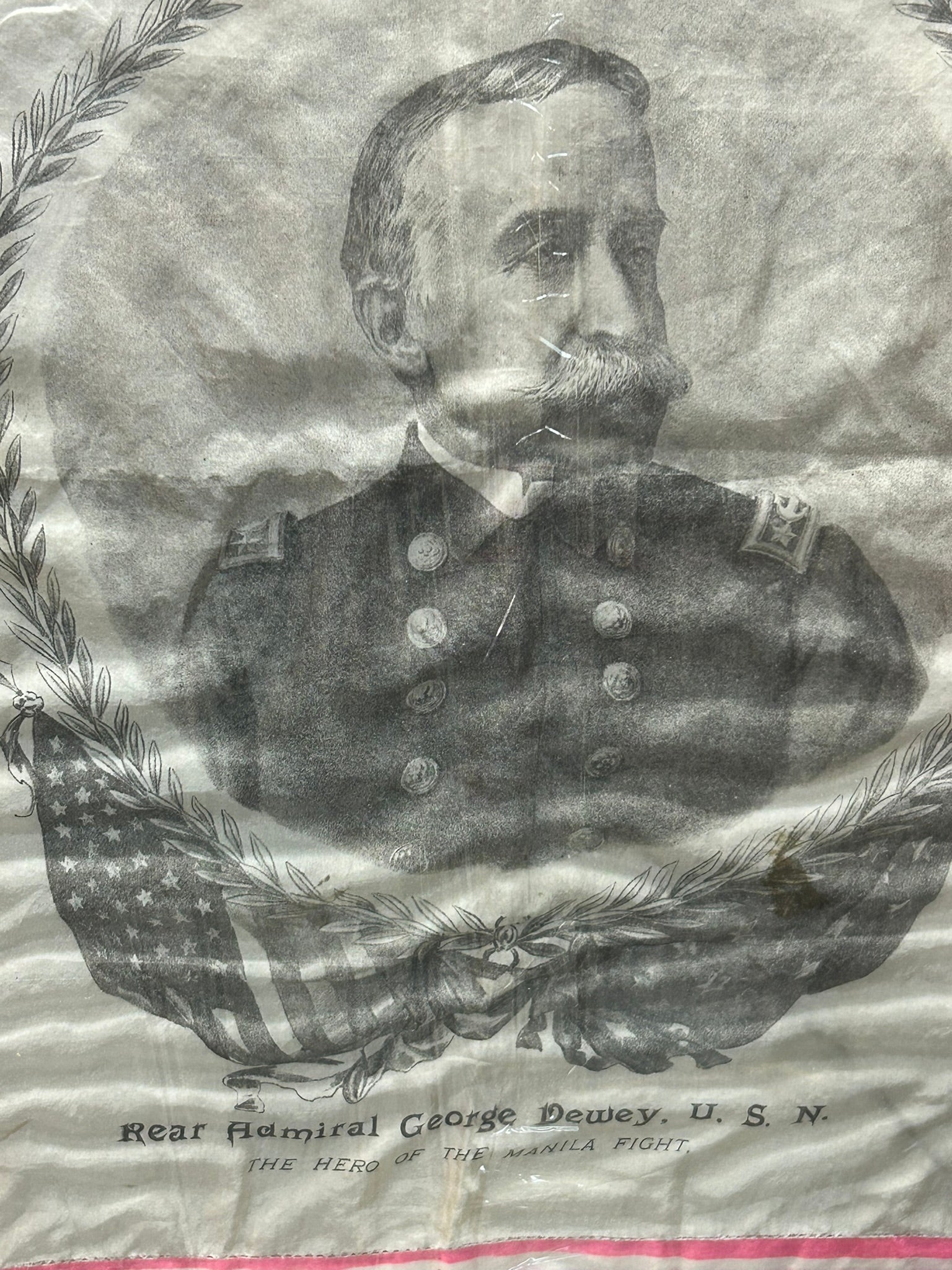 SPANISH AMERICAN WAR ADMIRAL DEWEY ANTIQUE SILK COMMEMORATIVE KERCHIEF 20" SQUARE. CALL OR TEXT FOR MORE INFORMATION