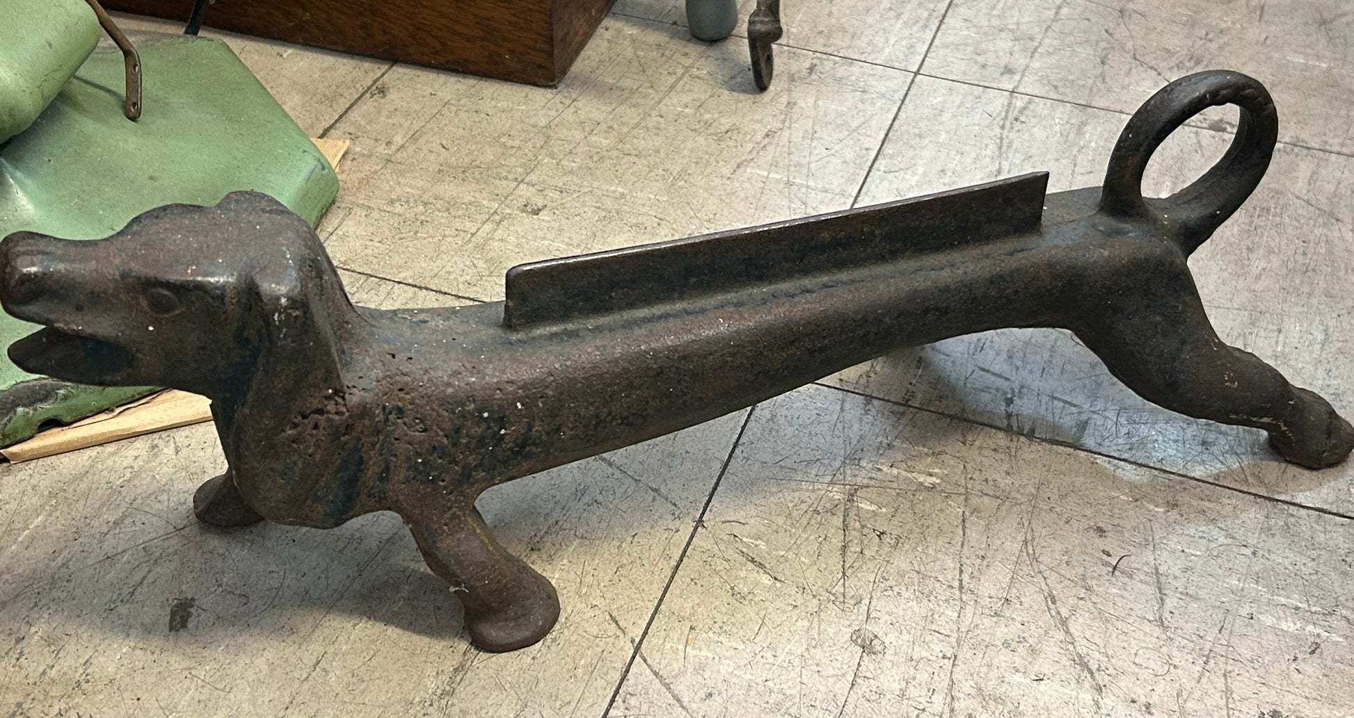 UNUSUAL SPLAY LEGGED CAST IRON DACHSHUND ANTIQUE FOOT SCRAPER., MOST HAVE EVENLY SPACED LEGS 21" LONG. CALL OR TEXT FOR MORE INFORMATION