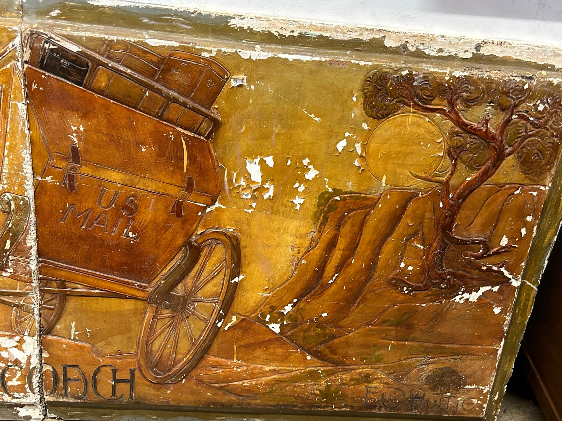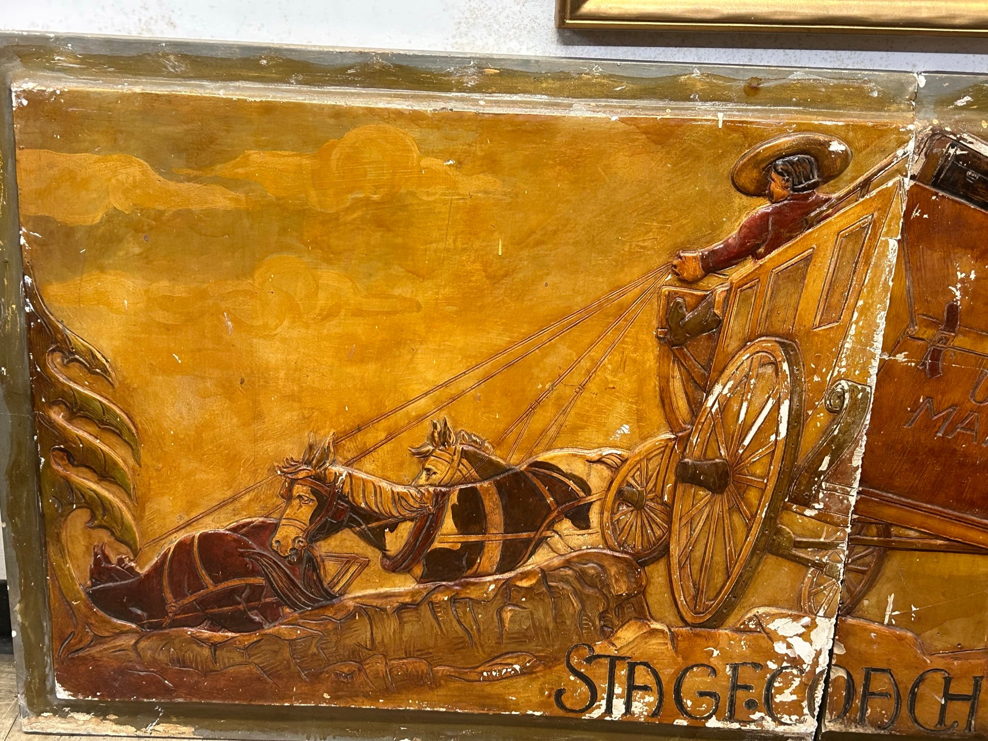 STAGE COACH SCENE SCULPTURED BASS RELIEF LARGE PLASTER PLAQUE IN TWO SECTIONS EACH 36" X 32" TALL. CALL OR TEXT FOR MORE INFORMATION